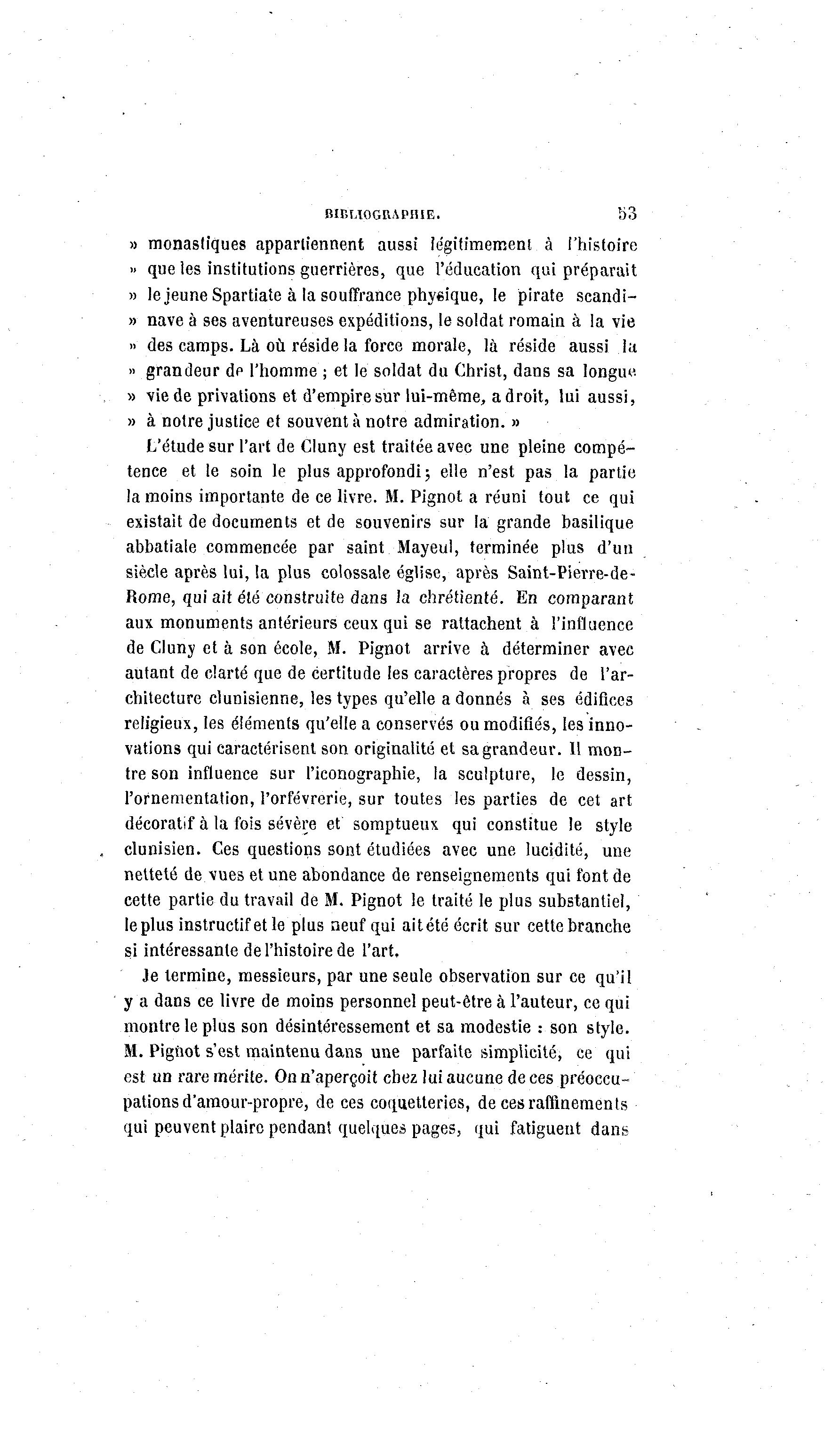 BIBLIOGRAPHIE. 53 » monastiques appartiennent aussi légitimement à l'histoire » que les institutions guerrières, que l'éducation qui préparait » le jeune Spartiate à la souffrance physique, le pirate scandi- » nave à ses aventureuses expéditions, le soldat romain à la vie » des camps. Là où réside la force morale, là réside aussi la « grandeur de l'homme ; et le soldat du Christ, dans sa longue » vie de privations et d'empire sur lui-même, adroit, lui aussi, » à notre justice et souvent à notre admiration. » L'étude sur l'art de Cluny est traitée avec une pleine compé- tence et le soin le plus approfondi ; elle n'est pas la partie la moins importante de ce livre. M. Pignot a réuni tout ce qui existait de documents et de souvenirs sur la grande basilique abbatiale commencée par saint Mayeul, terminée plus d'un siècle après lui, la plus colossale église, après Saint-Pierre-de- Rome, qui ait été construite dans la chrétienté. En comparant aux monuments antérieurs ceux qui se rattachent à l'influence de Cluny et à son école, M. Pignot arrive à déterminer avec autant de clarté que de certitude les caractères propres de l'ar- chitecture clunisienne, les types qu'elle a donnés à ses édifices religieux, les éléments qu'elle a conservés ou modifiés, les inno- vations qui caractérisent son originalité et sa grandeur. 11 mon- tre son influence sur l'iconographie, la sculpture, le dessin, l'ornementation, l'orfèvrerie, sur toutes les parties de cet art décoratif à la fois sévère et somptueux qui constitue le style clunisien. Ces questions sont étudiées avec une lucidité, une netteté de vues et une abondance de renseignements qui font de cette partie du travail de M. Pignot le traité le plus substantiel, le plus instructif et le plus neuf qui aitété écrit sur cette branche si intéressante de l'histoire de l'art. Je termine, messieurs, par une seule observation sur ce qu'il y a dans ce livre de moins personnel peut-être à l'auteur, ce qui montre le plus son désintéressement et sa modestie : son style. M. Pigiiot s'est maintenu dans une parfaite simplicité, ce qui est un rare mérite. On n'aperçoit chez lui aucune de ces préoccu- pations d'amour-propre, de ces coquetteries, de ces raffinements qui peuvent plaire pendant quelques pages, qui fatiguent dans