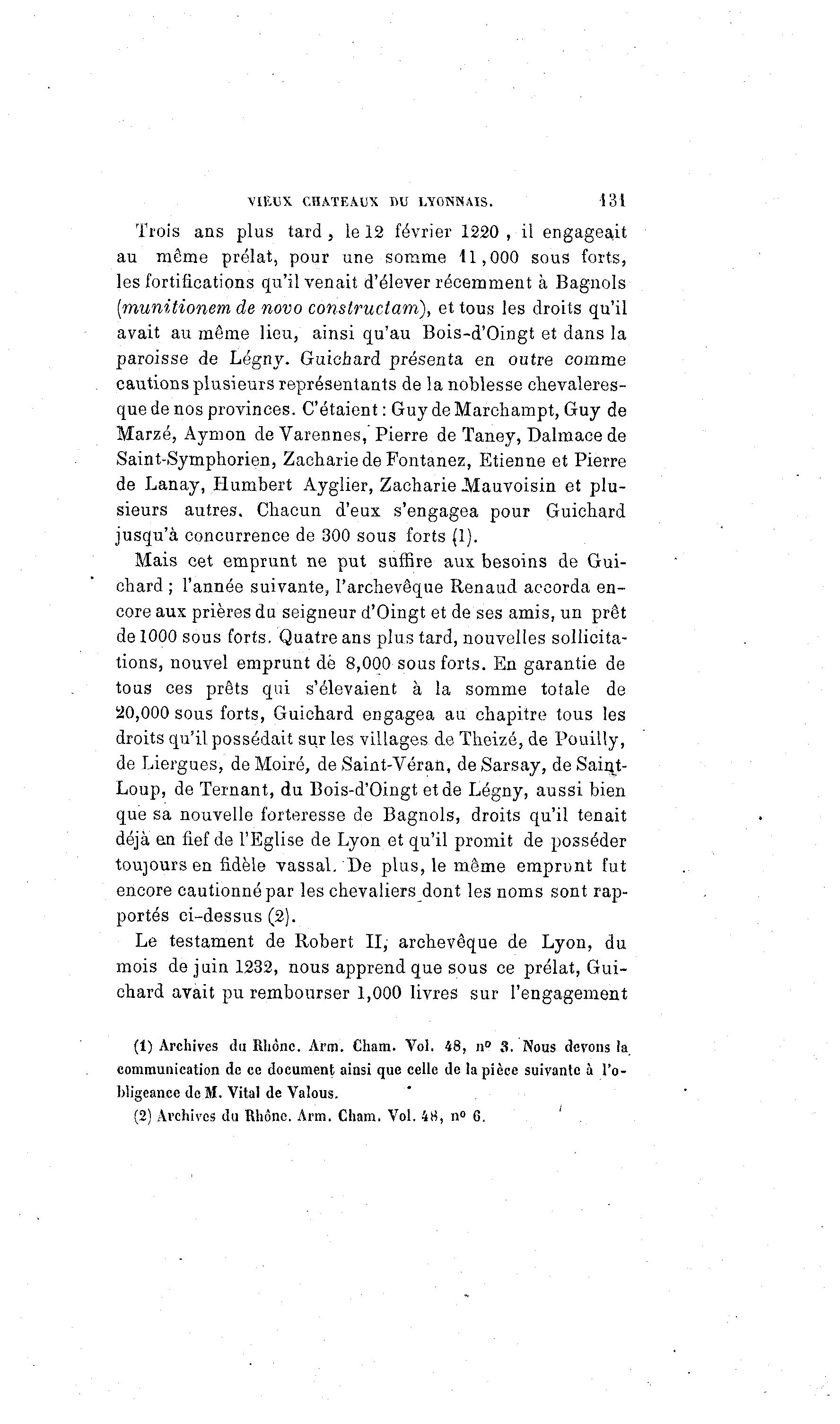 VIEUX CHATEAUX BU LYONNAIS. 431 Trois ans plus tard, le 12 février 1220 , il engageait au même prélat, pour une somme 41,000 sous forts, les fortifications qu'il venait d'élever récemment à Bagnols [munitionem de novo constructam), et tous les droits qu'il avait au même lieu, ainsi qu'au Bois-d'Oingt et dans la paroisse de Légny. Guicnard présenta en outre comme cautions plusieurs représentants de la noblesse chevaleres- que de nos provinces. C'étaient : Guy de Marchampt, Guy de Marzé, Aymon deVarennes, Pierre de Taney, Dalmace de Saint-Symphorien, Zacharie de Fontanez, Etienne et Pierre de Lanay, Humbert Ayglier, Zacharie .Mauvoisin et plu- sieurs autres. Chacun d'eux s'engagea pour Guichard jusqu'à concurrence de 300 sous forts (1). Mais cet emprunt ne put suffire aux besoins de Gui- chard ; l'année suivante, l'archevêque Renaud accorda en- core aux prières du seigneur d'Oingt et de ses amis, un prêt de 1000 sous forts. Quatre ans plus tard, nouvelles sollicita- tions, nouvel emprunt de 8,000 sous forts. En garantie de tous ces prêts qui s'élevaient à la somme totale de 120,000 sous forts, Guichard engagea au chapitre tous les droits qu'il possédait sur les villages de Theizé, de Pouilly, de Liergues, de Moiré, deSaint-Véran, deSarsay, de Saint- Loup, de Ternant, du Bois-d'Oingt et de Légny, aussi bien que sa nouvelle forteresse de Bagnols, droits qu'il tenait déjà en fief de l'Eglise de Lyon et qu'il promit de posséder toujours en fidèle vassal. De plus, le même emprunt fut encore cautionné par les chevaliers dont les noms sont rap- portés ci-dessus (2). Le testament de Robert II, archevêque de Lyon, du mois de juin 1232, nous apprend que sous ce prélat, Gui- chard avait pu rembourser 1,000 livres sur l'engagement (1) Archives du Rhône. Arm. Cham. Vol. 48, n° S. Nous devons la communication de ce document ainsi que celle de la pièce suivante à l'o- bligeance de M. Vital de Valous. (2) Archives du Rhône. Arm. Cham. Vol. 48, n° G. ' .