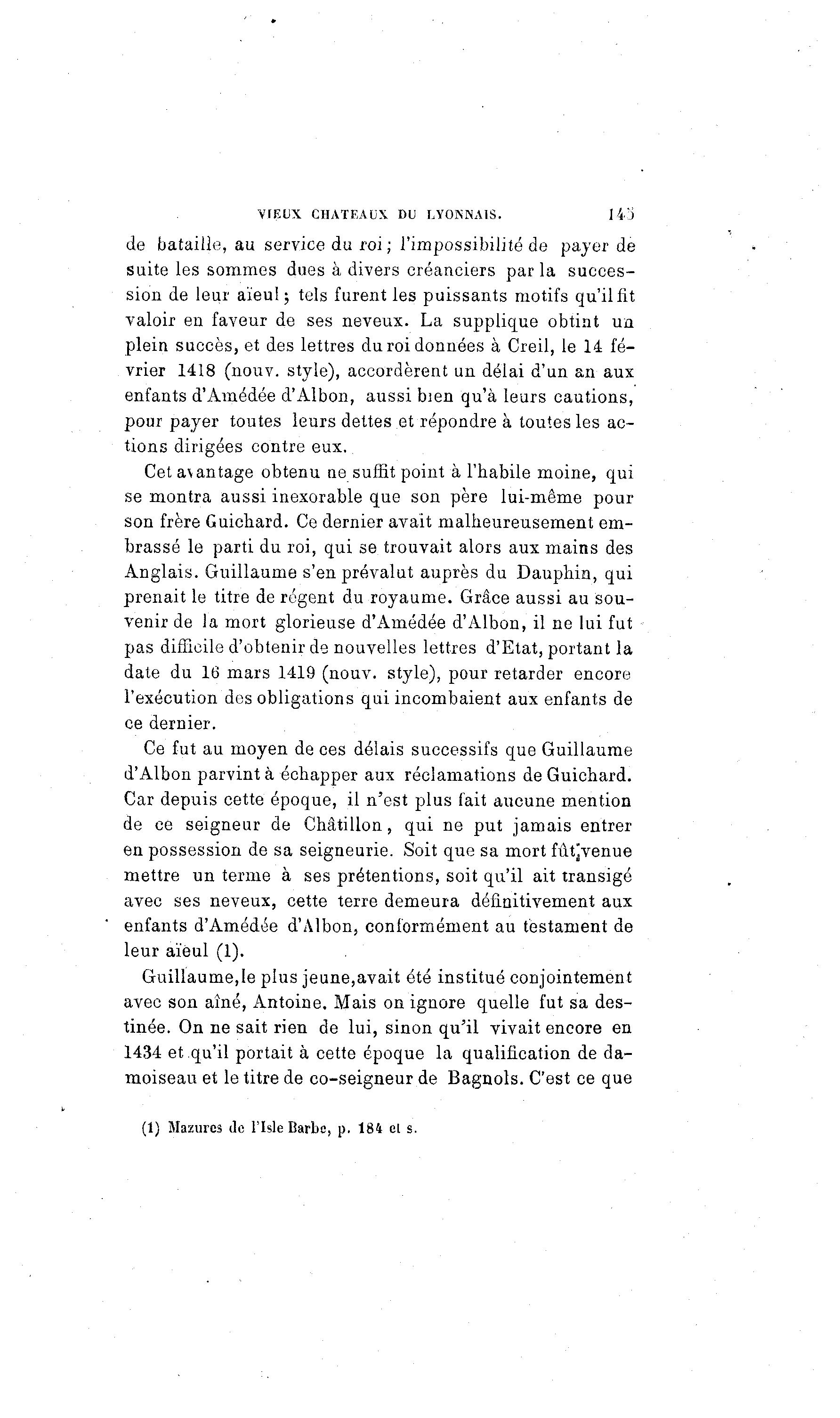 VIEUX CHATEAUX DU LYONNAIS. 1 i"i de bataille, au service du roi; l'impossibilité de payer de suite les sommes dues à divers créanciers parla succes- sion de leur aïeul ; tels furent les puissants motifs qu'il fit valoir en faveur de ses neveux. La supplique obtint un plein succès, et des lettres du roi données à Creil, le 14 fé- vrier 1418 (nouv. style), accordèrent un délai d'un an aux enfants d'Amedée d'Albon, aussi bien qu'à leurs cautions, pour payer toutes leurs dettes et répondre à toutes les ac- tions dirigées contre eux. Cet avantage obtenu ne suffit point à l'habile moine, qui se montra aussi inexorable que son père lui-même pour son frère Guichard. Ce dernier avait malheureusement em- brassé le parti du roi, qui se trouvait alors aux mains des Anglais. Guillaume s'en prévalut auprès du Dauphin, qui prenait le titre de régent du royaume. Grâce aussi au sou- venir de la mort glorieuse d'Amedée d'Albon, il ne lui fut pas difficile d'obtenir de nouvelles lettres d'Etat, portant la date du 16 mars 1419 (nouv. style), pour retarder encore l'exécution des obligations qui incombaient aux enfants de ce dernier. Ce fut au moyen de ces délais successifs que Guillaume d'Albon parvint à échapper aux réclamations de Guichard. Car depuis cette époque, il n'est plus fait aucune mention de ce seigneur de Châtillon, qui ne put jamais entrer en possession de sa seigneurie. Soit que sa mort fûtjvenue mettre un terme à ses prétentions, soit qu'il ait transigé avec ses neveux, cette terre demeura définitivement aux enfants d'Amedée d'Albon, conformément au testament de leur aïeul (1). Guillaume,le plus jeune,avait été institué conjointement avec son aîné, Antoine. Mais on ignore quelle fut sa des- tinée. On ne sait rien de lui, sinon qu'il vivait encore en 1434 et qu'il portait à cette époque la qualification de da- moiseau et le titre de co-seigneur de Bagnols. C'est ce que (1) Mazures de l'Isle Barbe, p. 184 el s.
