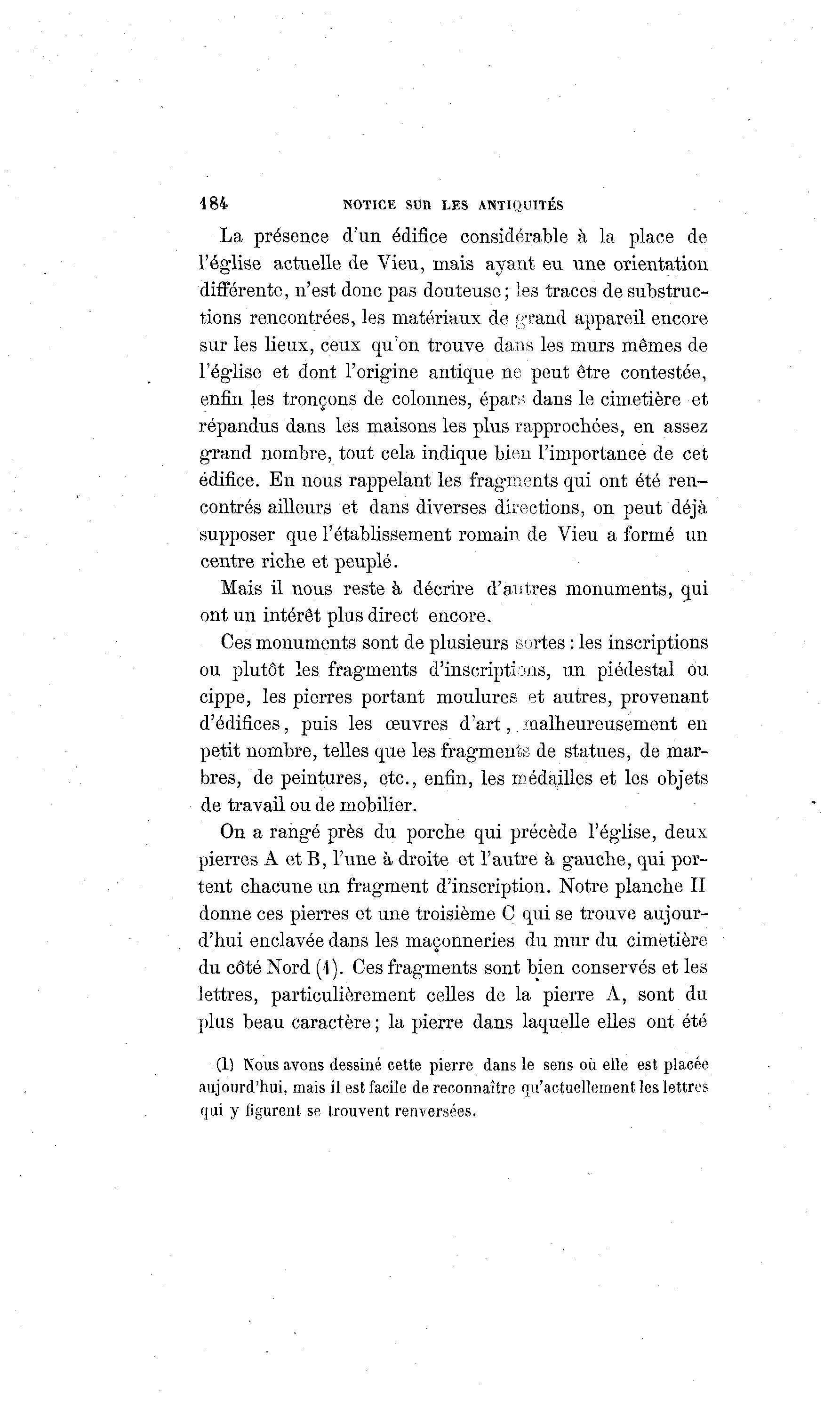 484 NOTICE SUR LES ANTIQUITÉS La présence d'un édifice considérable à la place de l'église actuelle de Vieu, mais ayant eu une orientation différente, n'est donc pas douteuse; les traces desubstruc- tions rencontrées, les matériaux de grand appareil encore sur les lieux, ceux qu'on trouve dans les murs mêmes de l'église et dont l'origine antique ne peut être contestée, enfin les tronçons de colonnes, épars dans le cimetière et répandus dans les maisons les plus rapprochées, en assez grand nombre, tout cela indique bien l'importance de cet édifice. En nous rappelant les fragments qui ont été ren- contrés ailleurs et dans diverses directions, on peut déjà supposer que l'établissement romain de Vieu a formé un centre riche et peuplé. Mais il nous reste à décrire d'autres monuments, qui ont un intérêt plus direct encore. Ces monuments sont de plusieurs sortes : les inscriptions ou plutôt les fragments d'inscriptions, un piédestal ou cippe, les pierres portant moulurée et autres, provenant d'édifices, puis les œuvres d'art,. malheureusement en petit nombre, telles que les fragments de statues, de mar- bres, de peintures, etc., enfin, les médailles et les objets de travail ou de mobilier. On a rangé près du porche qui précède l'église, deux pierres A et B, l'une à droite et l'autre à gauche, qui por- tent chacune un fragment d'inscription. Notre planche II donne ces pierres et une troisième G qui se trouve aujour- d'hui enclavée dans les maçonneries du mur du cimetière du côté Nord (1). Ces fragments sont bien conservés et les lettres, particulièrement celles de la pierre A, sont du plus beau caractère ; la pierre dans laquelle elles ont été (1) Nous avons dessiné cette pierre dans le sens où elle est placée aujourd'hui, mais il est facile de reconnaître qu'actuellement les lettres qui y figurent se trouvent renversées.