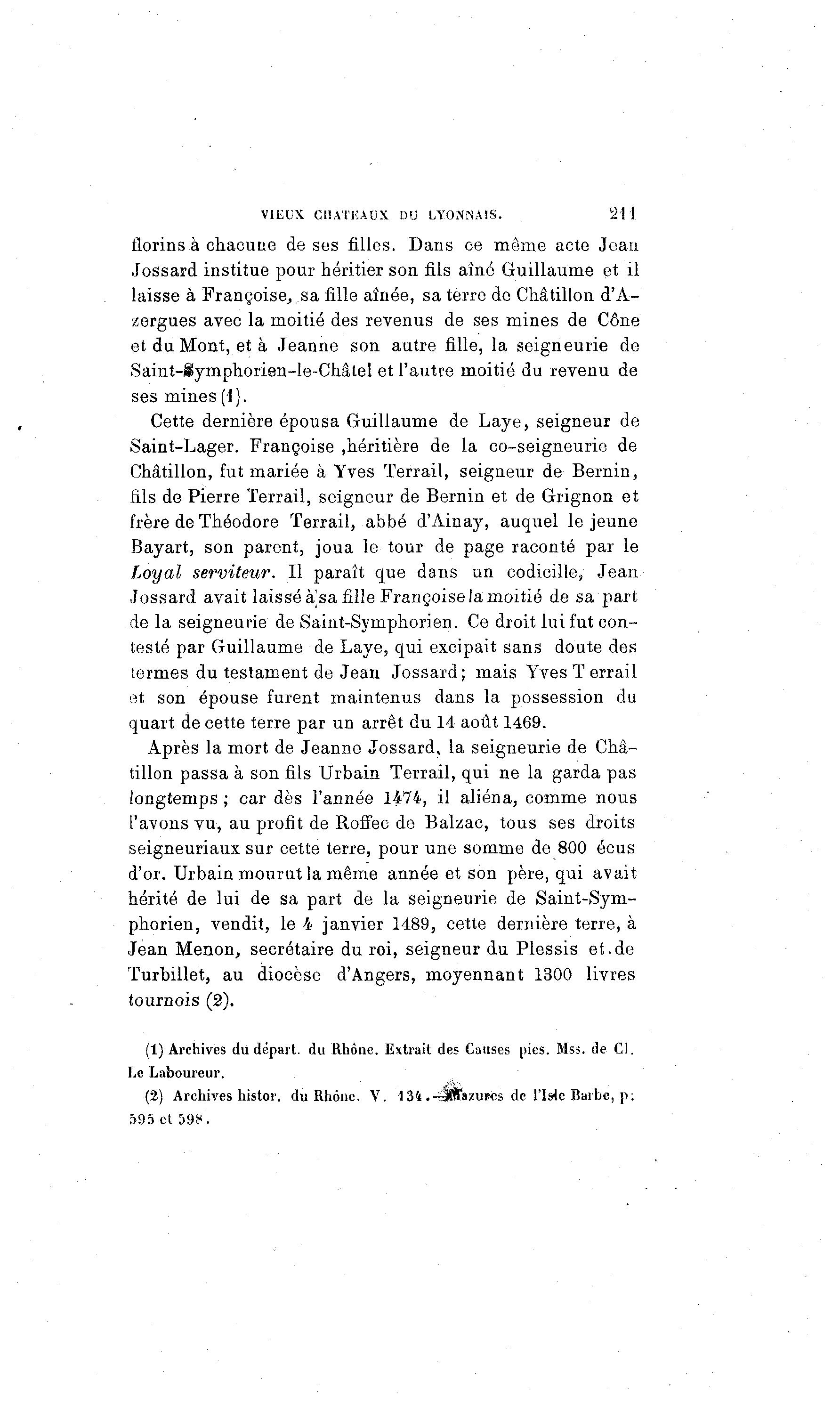 VIEUX CHATKAUX DU LYONNAIS. 211 florins à chacune de ses filles. Dans ce même acte Jean Jossard institue pour héritier son fils aîné Guillaume et il laisse à Françoise,.sa fille aînée, sa terre de Châtillon d'À- zergues avec la moitié des revenus de ses mines de Cône et du Mont, et à Jeanne son autre fille, la seigneurie de Saint-iymphorien-le-Châtel et l'autre moitié du revenu de ses mines (1). Cette dernière épousa Guillaume de Laye, seigneur de Saint-Lager. Françoise ,héritière de la co-seigneurie de Châtillon, fut mariée à Yves Terrail, seigneur de Bernin, iils de Pierre Terrail, seigneur de Bernin et de Grignon et frère de Théodore Terrail, abbé d'Ainay, auquel le jeune Bayart, son parent, joua le tour de page raconté par le Loyal serviteur. Il paraît que dans un codicille, Jean Jossard avait laissé a sa fille Françoise la moitié de sa part de la seigneurie de Saint-Symphorien. Ce droit lui fut con- testé par Guillaume de Laye, qui excipait sans doute des termes du testament de Jean Jossard; mais Yves Terrail et son épouse furent maintenus dans la possession du quart de cette terre par un arrêt du 14 août 1469. Après la mort de Jeanne Jossard, la seigneurie de Châ- tillon passa à son fils Urbain Terrail, qui ne la garda pas longtemps ; car dès l'année 1474, il aliéna, comme nous l'avons vu, au profit de Roffec de Balzac, tous ses droits seigneuriaux sur cette terre, pour une somme de 800 écus d'or. Urbain mourut la même année et son père, qui avait hérité de lui de sa part de la seigneurie de Saint-Sym- phorien, vendit, le 4 janvier 1489, cette dernière terre, à Jean Menon, secrétaire du roi, seigneur du Plessis et.de Turbillet, au diocèse d'Angers, moyennant 1300 livres tournois (2). (t) Archives du départ, du Rhône. Extrait des Causes pies. Mss. de Cl. Le Laboureur. (2) Archives histor. du Rhône. V. 134.4î!ftazUFCs de l'Is4e Barbe, p : 595 et 598.