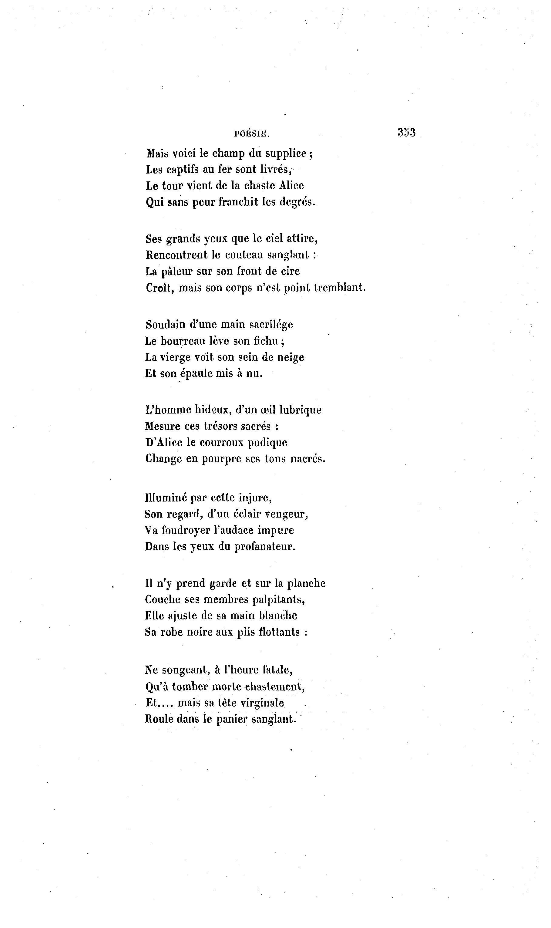 POÉSIE. 333 Mais voici le champ du supplice ; Les captifs au fer sont livrés, Le tour vient de la chaste Alice Qui sans peur franchit les degrés. Ses grands yeux que le ciel attire, Rencontrent le couteau sanglant : La pâleur sur son front de cire Croît, mais son corps n'est point tremblant. Soudain d'une main sacrilège Le bourreau lève son fichu ; La vierge voit son sein de neige Et son épaule mis à nu. L'homme hideux, d'un œil lubrique Mesure ces trésors sacrés : D'Alice le courroux pudique Change en pourpre ses tons nacrés. Illuminé par cette injure, Son regard, d'un éclair vengeur, Va foudroyer l'audace impure Dans les yeux du profanateur. Il n'y prend garde et sur la planche Couche ses membres palpitants, Elle ajuste de sa main blanche Sa robe noire aux plis flottants : Ne songeant, à l'heure fatale, Qu'à tomber morte chastement, Et mais sa tête virginale Roule dans le panier sanglant.