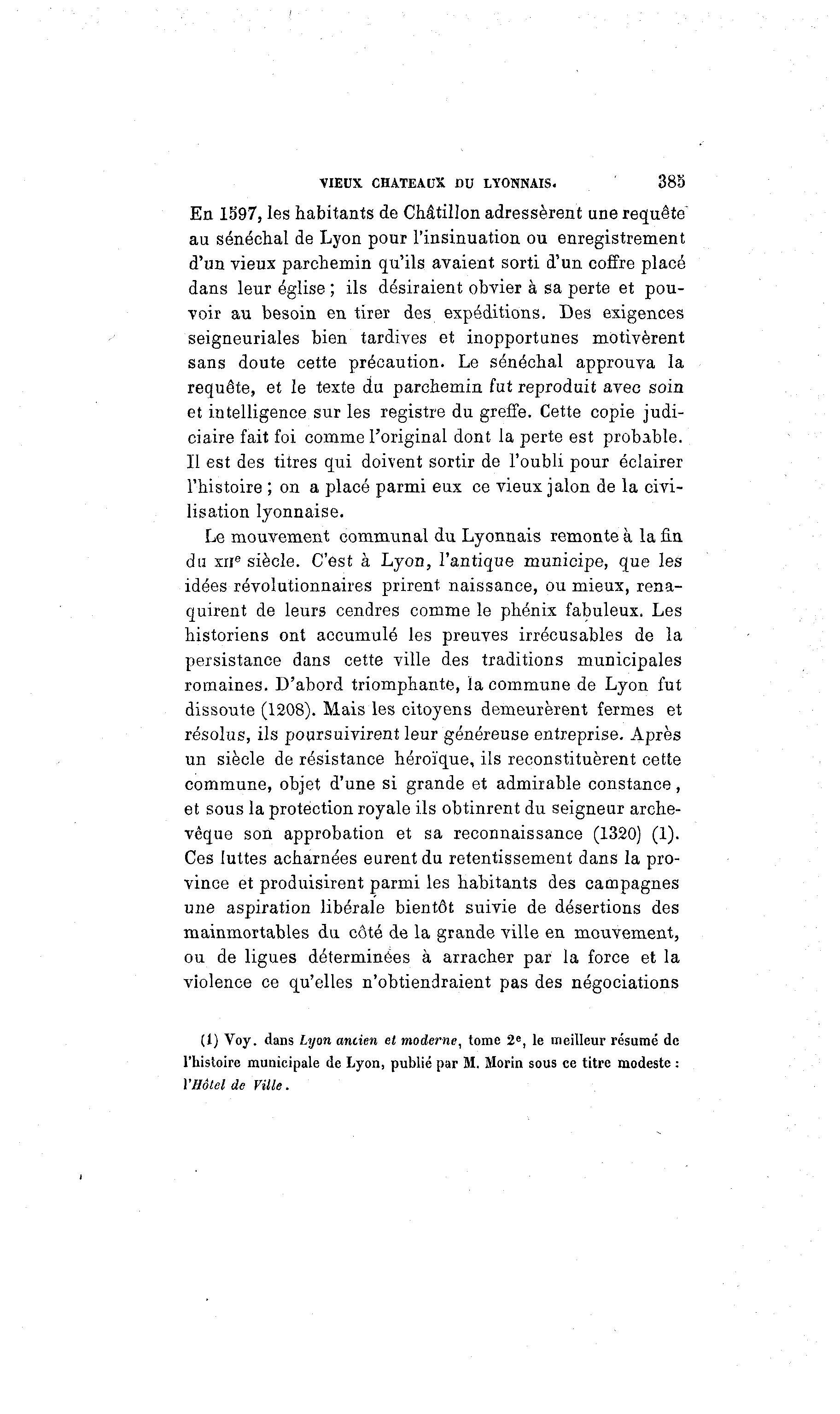 VIEUX CHATEAUX HU LYONNAIS. 383 En 1597, les habitants de Châtillon adressèrent une requête au sénéchal de Lyon pour l'insinuation ou enregistrement d'un vieux parchemin qu'ils avaient sorti d'un coffre placé dans leur église ; ils désiraient obvier à sa perte et pou- voir au besoin en tirer des expéditions. Des exigences seigneuriales bien tardives et inopportunes motivèrent sans doute cette précaution. Le sénéchal approuva la requête, et le texte du parchemin fut reproduit avec soin et intelligence sur les registre du greffe. Cette copie judi- ciaire fait foi comme l'original dont la perte est probable. Il est des titres qui doivent sortir de l'oubli pour éclairer l'histoire ; on a placé parmi eux ce vieux jalon de la civi- lisation lyonnaise. Le mouvement communal du Lyonnais remonte à la fin du xne siècle. C'est à Lyon, l'antique municipe, que les idées révolutionnaires prirent naissance, ou mieux, rena- quirent de leurs cendres comme le phénix fabuleux. Les historiens ont accumulé les preuves irrécusables de la persistance dans cette ville des traditions municipales romaines. D'abord triomphante, la commune de Lyon fut dissoute (1208). Mais les citoyens demeurèrent fermes et résolus, ils poursuivirent leur généreuse entreprise. Après un siècle de résistance héroïque, ils reconstituèrent cette commune, objet d'une si grande et admirable constance, et sous la protection royale ils obtinrent du seigneur arche- vêque son approbation et sa reconnaissance (1320) (1). Ces luttes acharnées eurent du retentissement dans la pro- vince et produisirent parmi les habitants des campagnes une aspiration libérale bientôt suivie de désertions des mainmortables du côté de la grande ville en mouvement, ou de ligues déterminées à arracher par la force et la violence ce qu'elles n'obtiendraient pas des négociations (X) Voy. dans Lyon ancien et moderne, tome 2 e , le meilleur résumé de l'histoire municipale de Lyon, publié par M. Morin sous ce titre modeste : l'Hôtel de Ville.