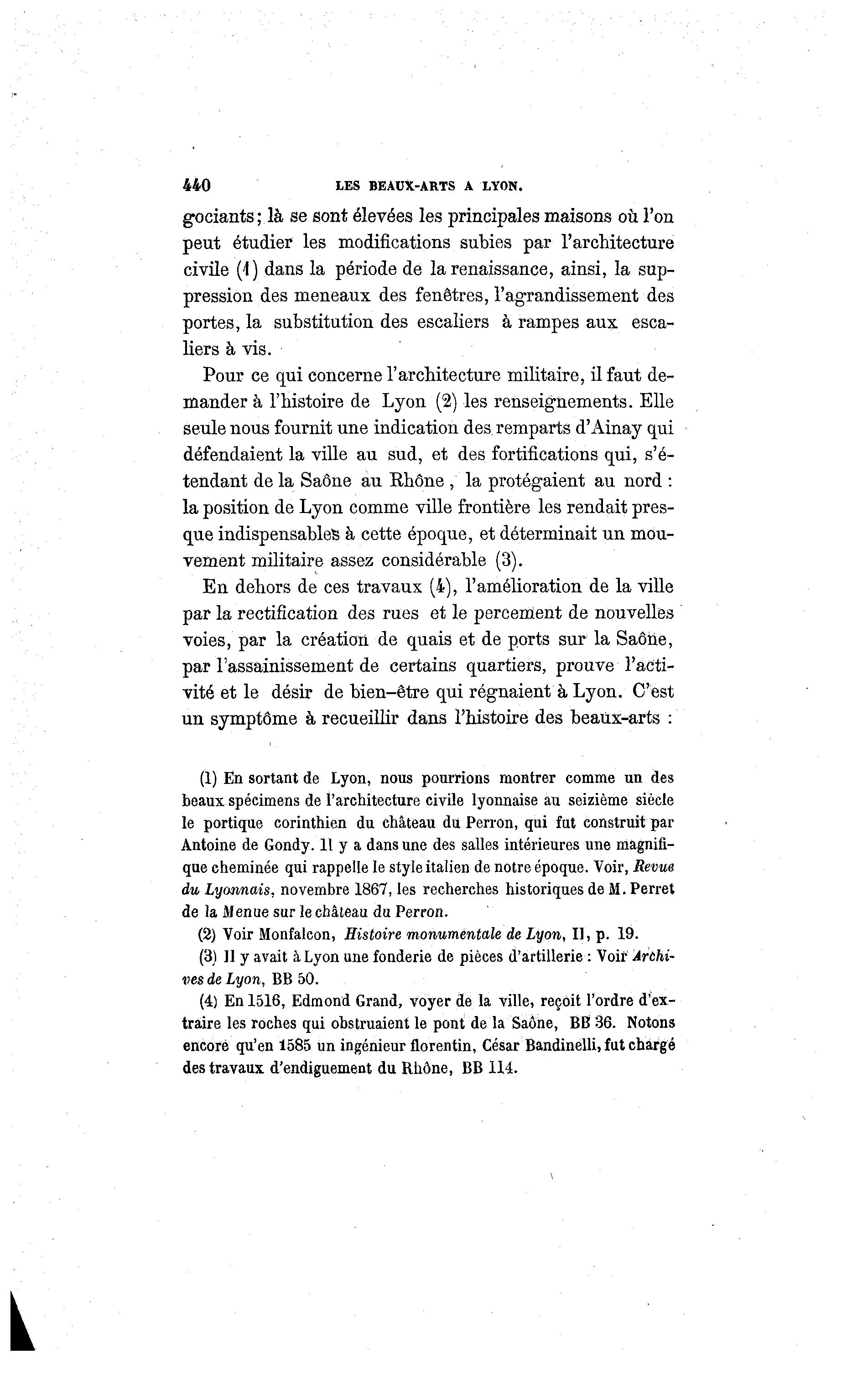440 LES BEAUX-ARTS A LYON. gociants; là se sont élevées les principales maisons où l'on peut étudier les modifications subies par l'architecture civile (1) dans la période de la renaissance, ainsi, la sup- pression des meneaux des fenêtres, l'agrandissement des portes, la substitution des escaliers à rampes aux esca- liers à vis. Pour ce qui concerne l'architecture militaire, il faut de- mander à l'histoire de Lyon (2) les renseignements. Elle seule nous fournit une indication des remparts d'Ainay qui défendaient la ville au sud, et des fortifications qui, s'é- tendant de la Saône au Rhône , la protégaient au nord : la position de Lyon comme ville frontière les rendait pres- que indispensables à cette époque, et déterminait un mou- vement militaire assez considérable (3). E n dehors de ces travaux (4), l'amélioration de la ville par la rectification des rues et le percement de nouvelles voies, par la création de quais et de ports sur la Saône, par l'assainissement de certains quartiers, prouve l'acti- vité et le désir de bien-être qui régnaient à Lyon. C'est un symptôme à recueillir dans l'histoire des beaux-arts : (1) En sortant de Lyon, nous poumons montrer comme un des beaux spécimens de l'architecture civile lyonnaise au seizième siècle le portique corinthien du château du Perron, qui fut construit par Antoine de Gondy. 11 y a dans une des salles intérieures une magnifi- que cheminée qui rappelle le style italien de notre époque. Voir, Revus du Lyonnais, novembre 1867, les recherches historiques de M. Perret de la Menue sur le château du Perron. (2) Voir Monfalcon, Histoire monumentale de Lyon, Il, p. 19. (3) 11 y avait à Lyon une fonderie de pièces d'artillerie : Voir Archi- ves de Lyon, BB 50. (4) En 1516, Edmond Grand, voyer de la ville, reçoit l'ordre d'ex- traire les roches qui obstruaient le pont de la Saône, BB 36. Notons encore qu'en 1585 un ingénieur florentin, César Bandinelli, fut chargé des travaux d'endiguement du Rhône, BB 114.