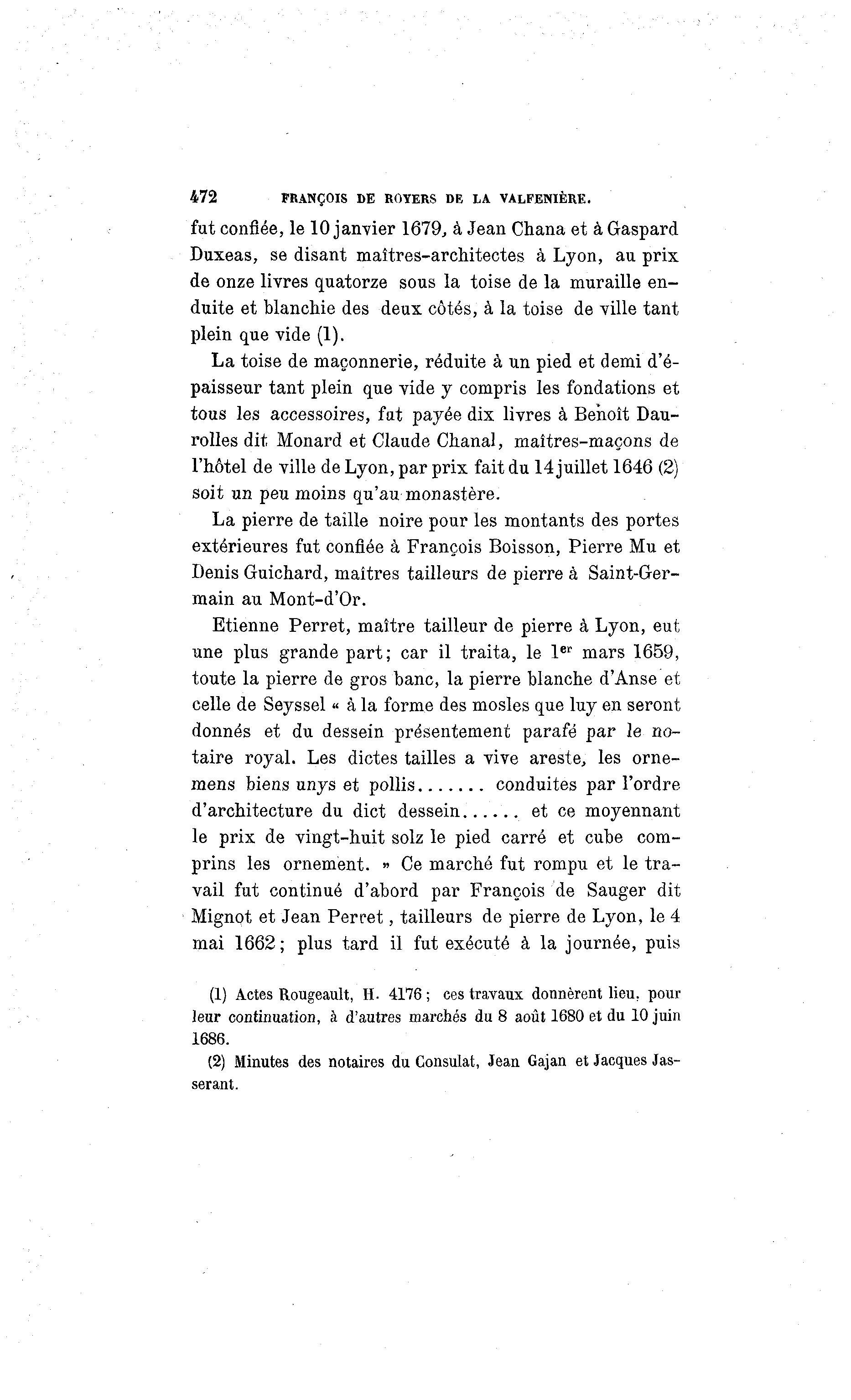 472 FRANÇOIS DE ROYERS DE LA VALFENIÈRE. fut confiée, le 10 janvier 1679, à Jean Chana et à Gaspard Duxeas, se disant maîtres-architectes à Lyon, au prix de onze livres quatorze sous la toise de la muraille en- duite et blanchie des deux côtés, à la toise de ville tant plein que vide (1). La toise de maçonnerie, réduite à un pied et demi d'é- paisseur tant plein que vide y compris les fondations et tous les accessoires, fat payée dix livres à Benoît Dau- rolles dit Monard et Claude Chanal, maîtres-maçons de l'hôtel de ville de Lyon, par prix fait du 14 juillet 1646 (2) soit un peu moins qu'au monastère. La pierre de taille noire pour les montants des portes extérieures fut confiée à François Boisson, Pierre Mu et Denis Guichard, maîtres tailleurs de pierre à Saint-Ger- main au Mont-d'Or. Etienne Perret, maître tailleur de pierre à Lyon, eut une plus grande part; car il traita, le 1 er mars 1659, toute la pierre de gros banc, la pierre blanche d'Anse et celle de Seyssel « à la forme des mosles que luy en seront donnés et du dessein présentement parafé par le no- taire royal. Les dictes tailles a vive areste, les orne- mens biens unys et pollis conduites par l'ordre d'architecture du dict dessein et ce moyennant le prix de vingt-huit solz le pied carré et cube com- prins les ornement. » Ce marché fut rompu et le tra- vail fut continué d'abord par François de Sauger dit Mignot et Jean Perret, tailleurs de pierre de Lyon, le 4 mai 1662; plus tard il fut exécuté à la journée, puis (1) Actes Rougeault, H. 4176 ; ces travaux donnèrent lieu, pour leur continuation, à d'autres marchés du 8 août 1680 et du 10 juin 1686. (2) Minutes des notaires du Consulat, Jean Gajan et Jacques Jas- serant.