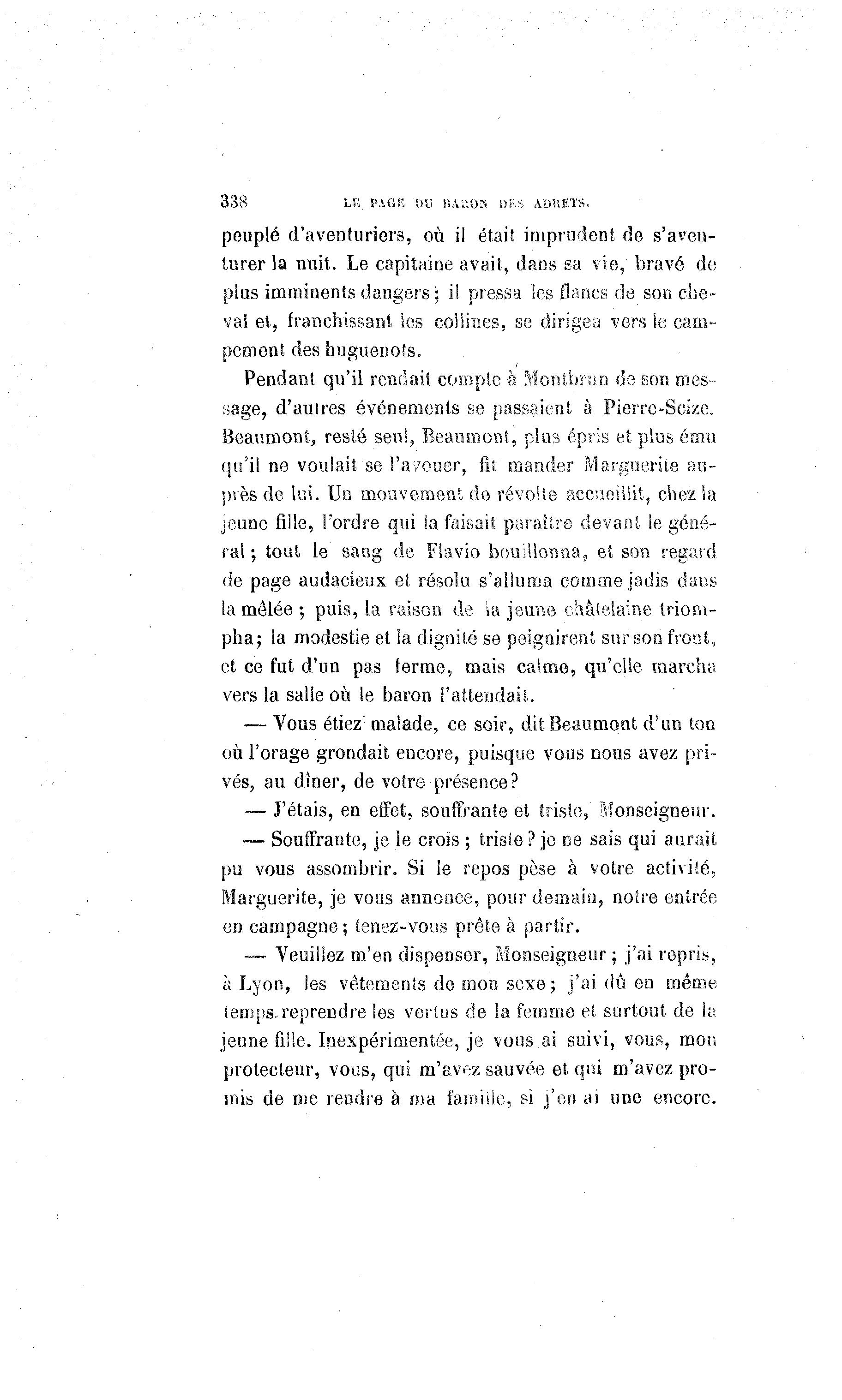 338 LV, PAGE DU JUKOH OKi AMïEÎS. peuplé d'aventuriers, où il était imprudent de s'aven- turer la nnit. Le capitaine avait, dans sa vie, bravé de plus imminents dangers; il pressa les flancs de son che- val et, franchissant les collines, se dirigea vers le cam- pement des huguenots. Pendant qu'il rendait, compte à Montbrun de son mes- sage, d'auires événements se passaient à Pierre-Scize. Beaumont, resté seul, Beaumont, plus épris et plus ému qu'il ne voulait se l'avouer, fit mander Marguerite au- près de lui. Un mouvement de révolte accueillit, chez la jeune fille, l'ordre qui la faisait paraître devant le géné- ral-, tout le sang de Fiavio bouillonna, et son regard de page audacieux et résolu s'alluma comme jadis dans la mêlée -, puis, la raison de ia jeune châtelaine triom- pha; la modestie et la dignité se peignirent sur son front, et ce fut d'un pas terme, mais calme, qu'elle marcha vers la salle où le baron l'attendait. — Vous étiez' malade, ce soir, dit Beaumont d'un ton où l'orage grondait encore, puisque vous nous avez pri- vés, au dîner, de votre présence? — J'étais, en effet, souffrante et triste, Monseigneur. — Souffrante, je le crois ; triste ? je ne sais qui aurait pu vous assombrir. Si le repos pèse à votre activité, Marguerite, je vous annonce, pour demain, notre entrée en campagne; tenez-vous prête à partir. —- Veuillez m'en dispenser, Monseigneur ; j'ai repris, à Lyon, les vêtements de mon sexe; j'ai dû en même temps.reprendre les vertus de la femme et surtout de la jeune fille. Inexpérimentée, je vous ai suivi, vous, mon protecteur, vous, qui m'avez sauvée et qui m'avez pro- mis de me rendre à ma famiile, si j'en ai une encore.