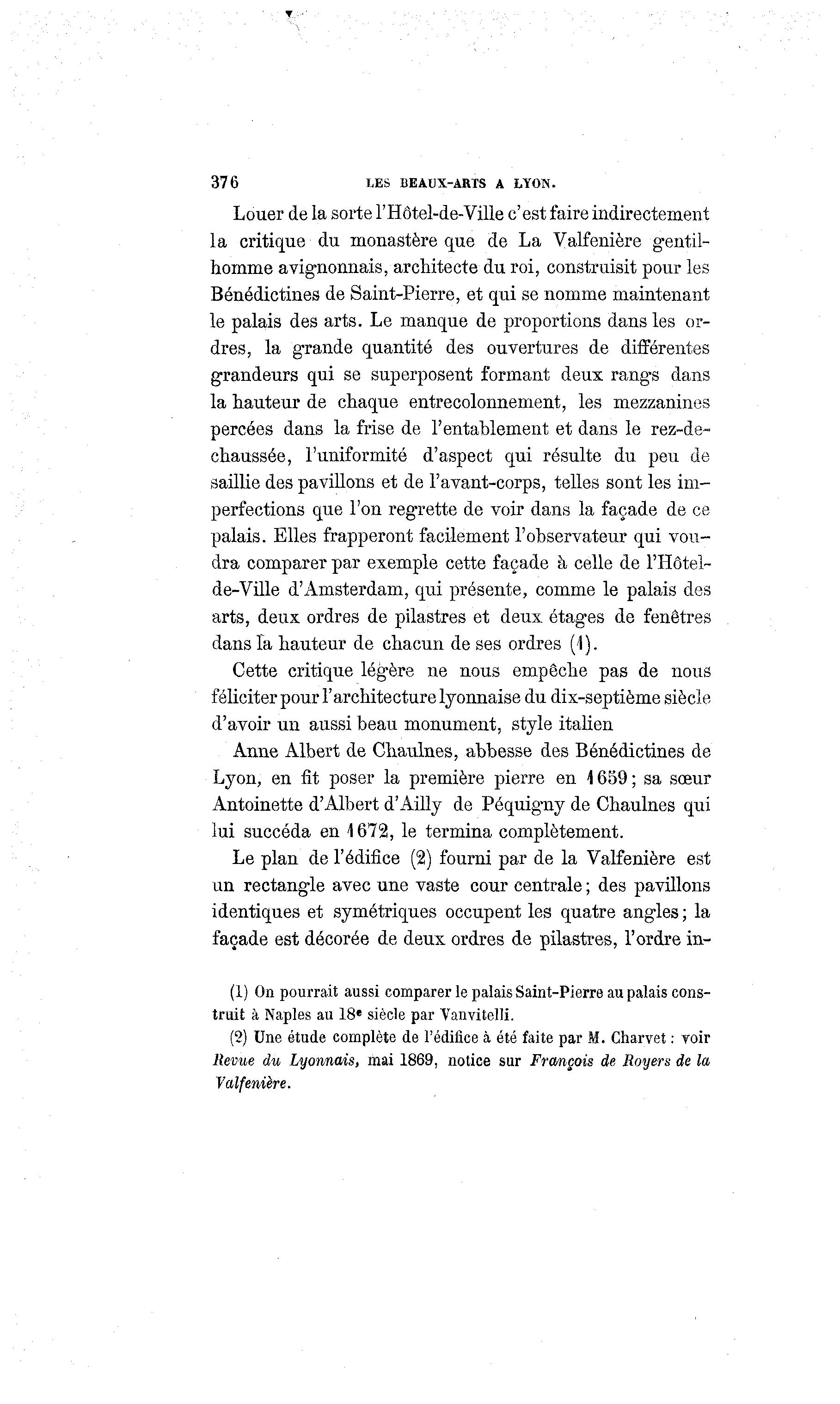 376 LES BEAUX-ARTS A LYON. Louer de la sorte l'Hôtel-de-Ville c'est faire indirectement la critique du monastère que de La Valfenière gentil- homme avignonnais, architecte du roi, construisit pour les Bénédictines de Saint-Pierre, et qui se nomme maintenant le palais des arts. Le manque de proportions dans les or- dres, la grande quantité des ouvertures de différentes grandeurs qui se superposent formant deux rang-s dans la hauteur de chaque entrecolonnement, les mezzanines percées dans la frise de l'entablement et dans le rez-de- chaussée, l'uniformité d'aspect qui résulte du peu de saillie des pavillons et de l'avant-corps, telles sont les im- perfections que l'on regrette de voir dans la façade de ce palais. Elles frapperont facilement l'observateur qui vou- dra comparer par exemple cette façade à celle de l'Hôtel- de-Ville d'Amsterdam, qui présente, comme le palais des arts, deux ordres de pilastres et deux étages de fenêtres dans la hauteur de chacun de ses ordres (1). Cette critique légère ne nous empêche pas de nous féliciter pour l'architecture lyonnaise du dix-septième siècle d'avoir un aussi beau monument, style italien Anne Albert de Chaulnes, abbesse des Bénédictines de Lyon, en fit poser la première pierre en 1659 ; sa sœur Antoinette d'Albert d'Ailly de Péquigny de Chaulnes qui lui succéda en 1672, le termina complètement. Le plan de l'édifice (2) fourni par de la Valfenière est un rectangle avec une vaste cour centrale ; des pavillons identiques et symétriques occupent les quatre angles ; la façade est décorée de deux ordres de pilastres, l'ordre in- (1) On pourrait aussi comparer le palais Saint-Pierre au palais cons- truit à Naples au 18e siècle par Vanvitelli. (2) Une étude complète de l'édifice à été faite par M. Charvet : yoir Revue du Lyonnais, mai 1869, notice sur François de Roy ers de ta Valfenière.