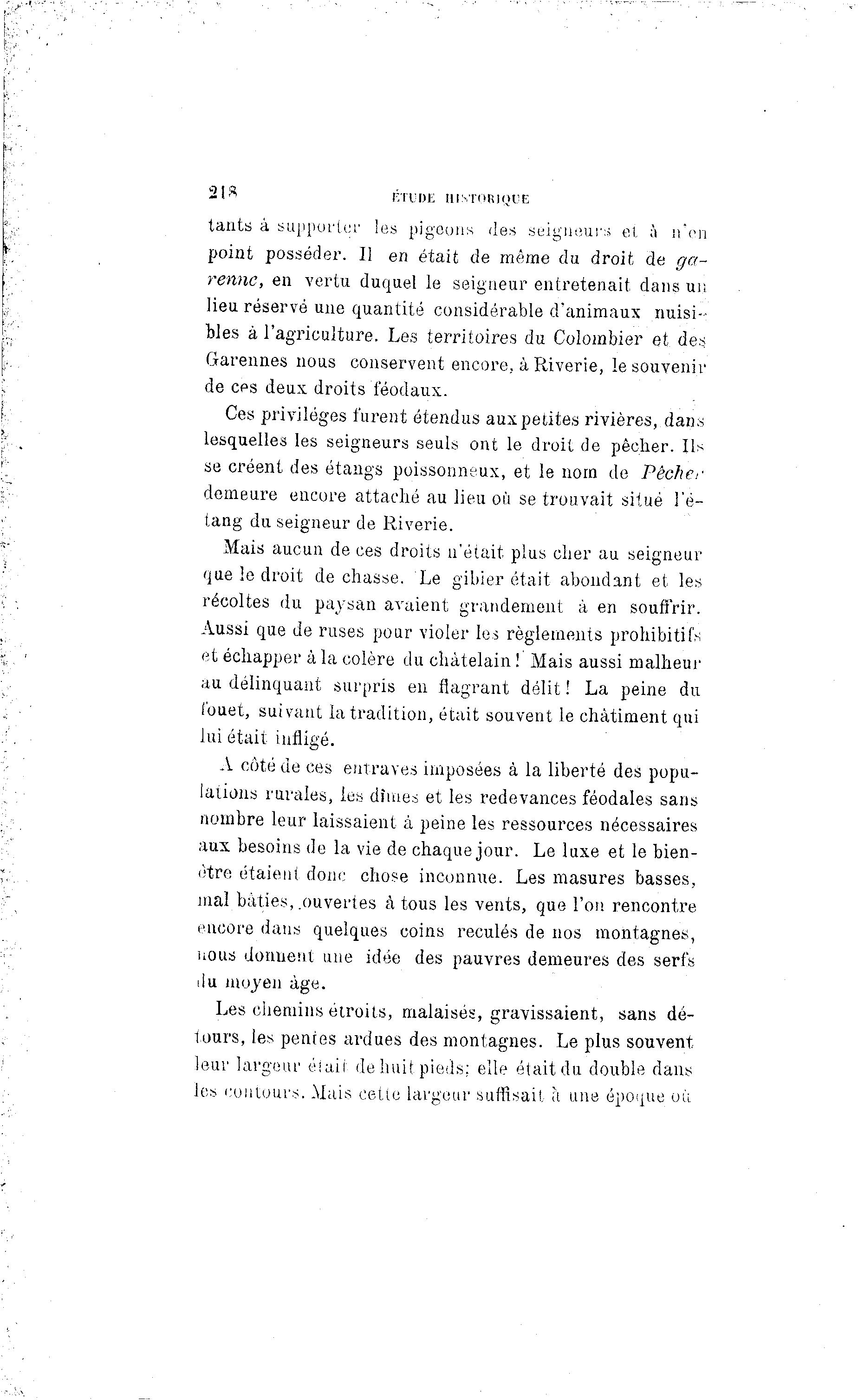 218 ÉTUDE HISTORIQUE tants â supporter les pigeons des s e i g n e u r s et à n'en point posséder. Il en était de même du droit de ga- renne, en vertu duquel le seigneur entretenait dans un lieu réservé une quantité considérable d'animaux nuisi- bles à l'agriculture. Les territoires du Colombier et des Garennes nous conservent encore, à Riverie, le souvenir de ces deux droits féodaux. Ces privilèges furent étendus aux petites rivières, dans lesquelles les seigneurs seuls ont le droit de pêcher. Ils se créent des étangs poissonneux, et le nom de Pécher demeure encore attaché au lieu où se trouvait situé l'é- tang du seigneur de Riverie. Mais aucun de ces droits n'était plus cher au seigneur que le droit de chasse. Le gibier était abondant et les récoltes du paysan avaient grandement à en souffrir. Aussi que de ruses pour violer les règlements prohibitifs et échapper à la colère du châtelain ! Mais aussi malheur au délinquant surpris en flagrant délit ! La peine du fouet, suivant la tradition, était souvent le châtiment qui lui était infligé. A côté de ces entraves imposées à la liberté des popu- lations rurales, les dîmes et les redevances féodales sans nombre leur laissaient à peine les ressources nécessaires aux besoins de la vie de chaque jour. Le luxe et le bien- être étaient donc chose inconnue. Les masures basses, mal bâties,.ouvertes à tous les vents, que l'on rencontre encore dans quelques coins reculés de nos montagnes, nous donnent une idée des pauvres demeures des serfs ilu moyen âge. Les chemins étroits, malaisés, gravissaient, sans dé- tours, les pentes ardues des montagnes. Le plus souvent leur largeur éiait de huit pieds; elle était du double dans les contours. Mais cetie largeur suffisait à une époque où