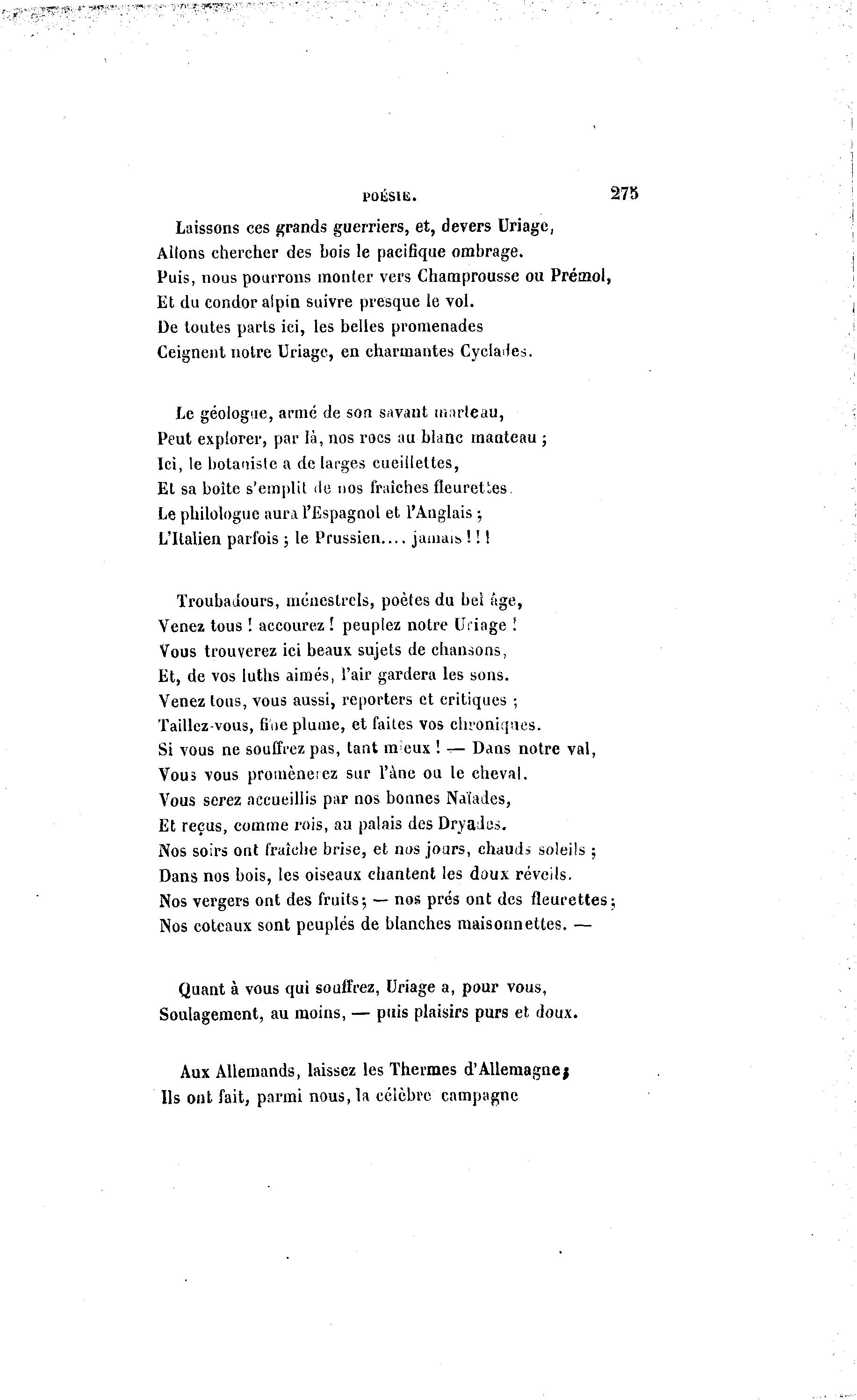 POÉSIK. Laissons ces grands guerriers, et, devers Uriagc, Allons chercher des bois le pacifique ombrage. Puis, nous pourrons monter vers Champrousse ou Prémol, Et du condor alpin suivre presque le vol. De toutes parts ici, les belles promenades Ceignent notre Uriage, en charmantes Cyelades. Le géologue, armé de son savant marteau, Peut explorer, par là , nos rocs au blanc manteau ; Ici, le botaniste a de larges cueillettes, Et sa boîte s'emplit de nos fraîches fleurettes Le philologue aura l'Espagnol et l'Anglais ; L'Italien parfois ; le Prussien jamais, ! ! ! Troubadours, ménestrels, poètes du bel âge, Venez tous ! accourez ! peuplez notre Uriage I Vous trouverez ici beaux sujets de chansons, Et, de vos luths aimés, l'air gardera les sons. Venez tous, vous aussi, reporters et critiques ; Taillez-vous, fine plume, et faites vos chroniques. Si vous ne souffrez pas, tant mieux ! -r— Dans notre val, Vous vous promène:ez sur l'à ne ou le cheval. Vous serez accueillis par nos bonnes Naïades, Et reçus, comme rois, au palais des Dryades. Nos soirs ont fraîche brise, et nos jours, chauds soleils ; Dans nos bois, les oiseaux chantent les doux réveils. Nos vergers ont des fruits; — nos prés ont des fleurettes; Nos coteaux sont peuplés de blanches maisonnettes. — Quant à vous qui souffrez, Uriage a, pour vous, Soulagement, au moins, — puis plaisirs purs et doux. Aux Allemands, laissez les Thermes d'Allemagne; Ils ont fait, parmi nous, la célèbre campagne