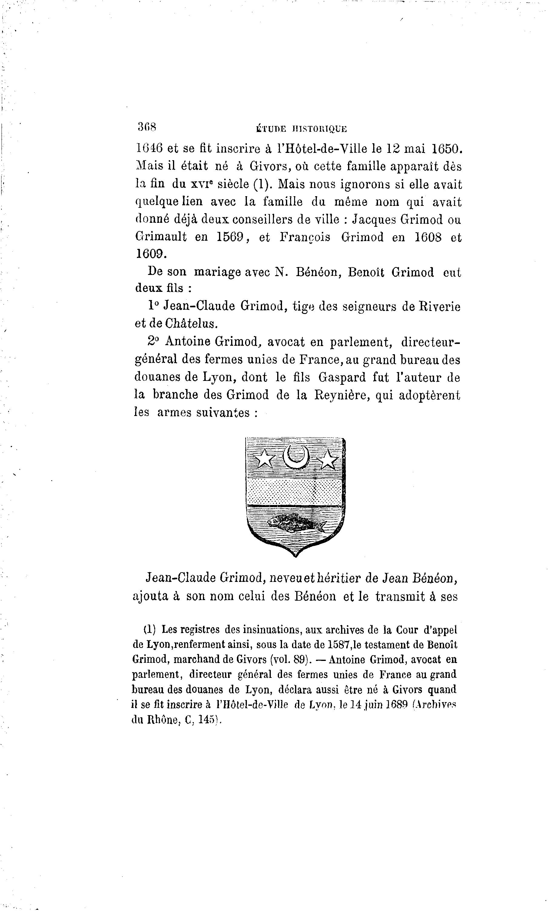 308 ÉTUDE HISTORIQUE 1646 et se fit inscrire à l'Hôtel-de-Ville le 12 mai 1650. Mais il était né à Givors, où cette famille apparaît dès la fin du xvie siècle (1). Mais nous ignorons si elle avait quelque lien avec la famille du même nom qui avait donné déjà deux conseillers de ville : Jacques Grimod ou Grimault en 1569, et François Grimod en 1608 et 1609. De son mariage avec N. Bénéon, Benoît Grimod eut deux fils : 1° Jean-Claude Grimod, tige des seigneurs de Riverie et deChâtelus. 2° Antoine Grimod, avocat en parlement, directeur- général des fermes unies de France, au grand bureau des douanes de Lyon, dont le fils Gaspard fut l'auteur de la branche des Grimod de la Reynière, qui adoptèrent les armes suivantes : Jean-Claude Grimod, neveu et héritier de Jean Bénéon, ajouta à son nom celui des Bénéon et le transmit à ses (1) Les registres des insinuations, aux archives de la Cour d'appel de Lyon,renferment ainsi, sous la date de 1587,1e testament de Benoît Grimod, marchand de Givors (vol. 89). — Antoine Grimod, avocat en parlement, directeur général des fermes unies de France au grand bureau des douanes de Lyon, déclara aussi être né à Givors quand il sefitinscrire à l'Hôtel-de-Ville de Lyon, le 14 juin 1689 (Archives du Rhône, C, 145).