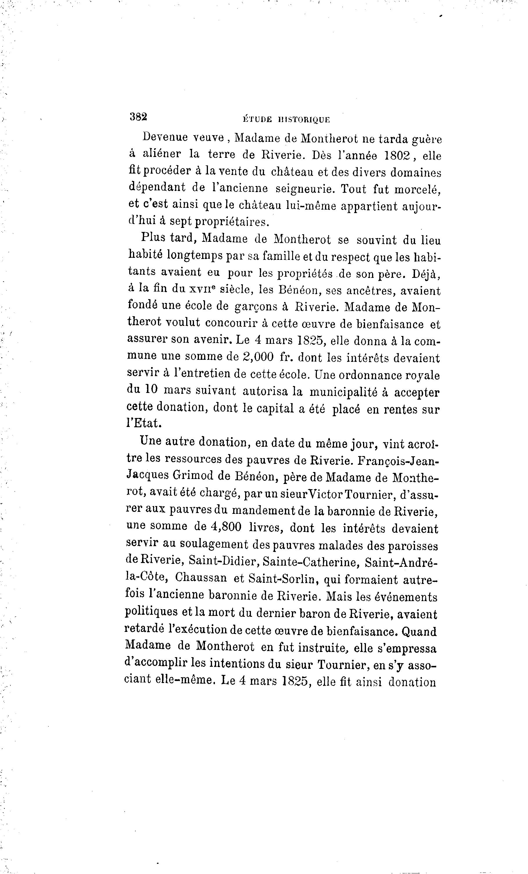 382 ÉTUDE HISTORIQUE Devenue veuve , Madame de Montherot ne tarda guère à aliéner la terre de Riverie. Dès l'année 1802, elle fit procéder à la vente du château et des divers domaines dépendant de l'ancienne seigneurie. Tout fut morcelé, et c'est ainsi que le château lui-même appartient aujour- d'hui à sept propriétaires. Plus tard, Madame de Montherot se souvint du lieu habité longtemps par sa famille et du respect que les habi- tants avaient eu pour les propriétés de son père. Déjà , à la fin du xvn e siècle, les Bénéon, ses ancêtres, avaient fondé une école de garçons à Riverie. Madame de Mon- therot voulut concourir à cette oeuvre de bienfaisance et assurer son avenir. Le 4 mars 1825, elle donna à la com- mune une somme de 2,000 fr. dont les intérêts devaient servir à l'entretien de cette école. Une ordonnance royale du 10 mars suivant autorisa la municipalité à accepter cette donation, dont le capital a été placé en rentes sur l'Etat. Une autre donation, en date du même jour, vint acroî- tre les ressources des pauvres de Riverie. François-Jean- Jacques Grimod de Bénéon, père de Madame de Monthe- rot, avait été chargé, parunsieurVictorTournier, d'assu- rer aux pauvres du mandement de la baronnie de Riverie, une somme de 4,800 livres, dont les intérêts devaient servir au soulagement des pauvres malades des paroisses de Riverie, Saint-Didier, Sainte-Catherine, Saint-André- la-Côte, Chaussan et Saint-Sorlin, qui formaient autre- fois l'ancienne baronnie de Riverie. Mais les événements politiques et la mort du dernier baron de Riverie, avaient retardé l'exécution de cette oeuvre de bienfaisance. Quand Madame de Montherot en fut instruite, elle s'empressa d'accomplir les intentions du sieur Tournier, en s'y asso- ciant elle-même. Le 4 mars 1825, elle fit ainsi donation