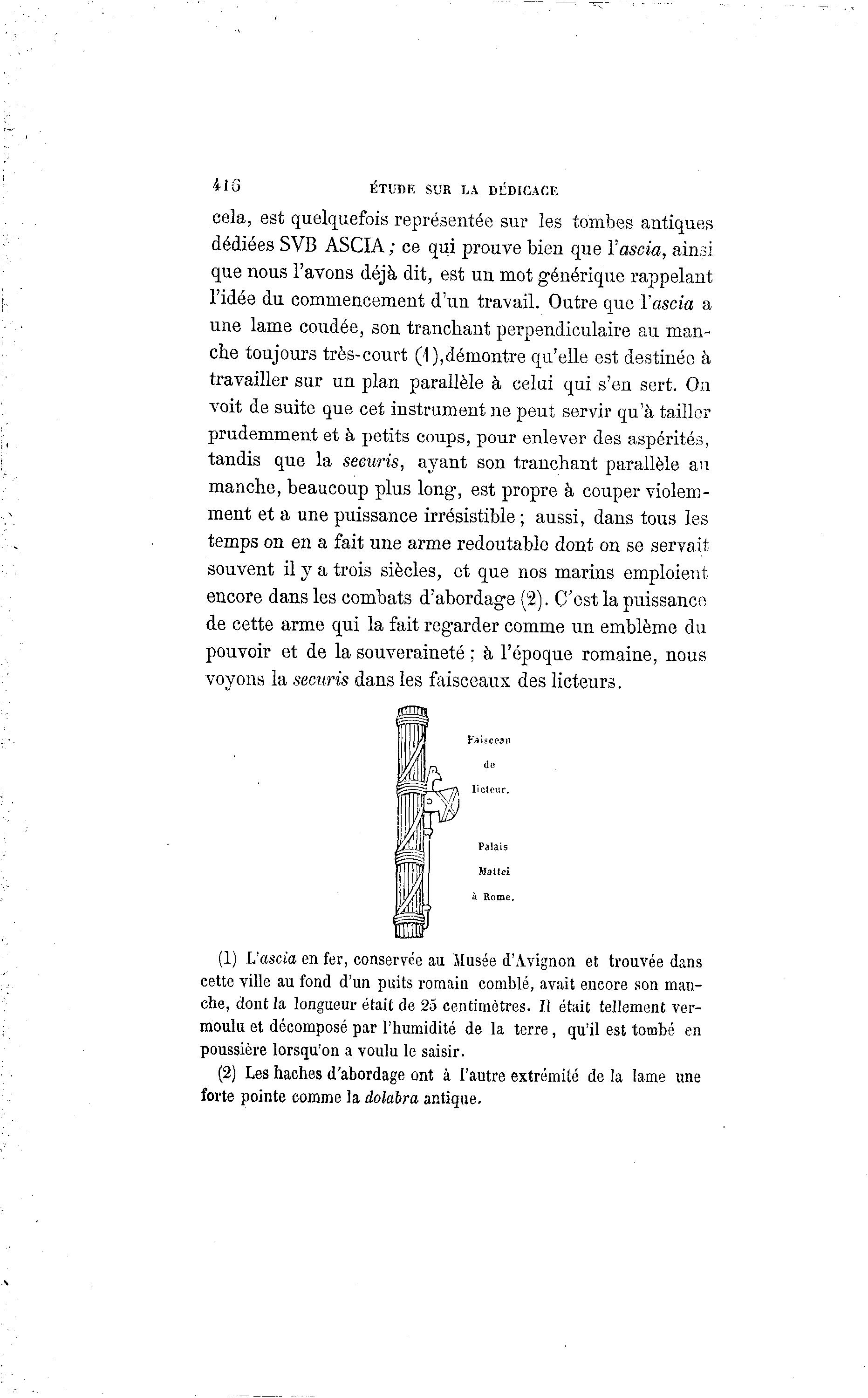 41-3 ÉTUDK SUR LA DÉDICACE cela, est quelquefois représentée sur les tombes antiques dédiées SVB ASCIA ; ce qui prouve bien que Vascia, ainsi que nous l'avons déjà dit, est un mot générique rappelant l'idée du commencement d'un travail. Outre que Vascia a une lame coudée, son tranchant perpendiculaire au man- che toujours très-court (1),démontre qu'elle est destinée à travailler sur un plan parallèle à celui qui s'en sert. Ou voit de suite que cet instrument ne peut servir qu'à tailler prudemment et à petits coups, pour enlever des aspérités, tandis que la seeuris, ayant son tranchant parallèle au manche, beaucoup plus long, est propre à couper violem- ment et a une puissance irrésistible ; aussi, dans tous les temps on en a fait une arme redoutable dont on se servait souvent il y a trois siècles, et que nos marins emploient encore dans les combats d'abordage (2). C'est la puissance de cette arme qui la fait regarder comme un emblème du pouvoir et de la souveraineté ; à l'époque romaine, nous voyons la seeuris dans les faisceaux des licteurs. (1) L'ascia en fer, conservée au Musée d'Avignon et trouvée dans cette ville au fond d'un puits romain comblé, avait encore son man- che, dont la longueur était de 25 centimètres. Il était tellement ver- moulu et décomposé par l'humidité de la terre, qu'il est tombé en poussière lorsqu'on a voulu le saisir. (2) Les haches d'abordage ont à l'autre extrémité de la lame une forte pointe comme la dolabra antique.