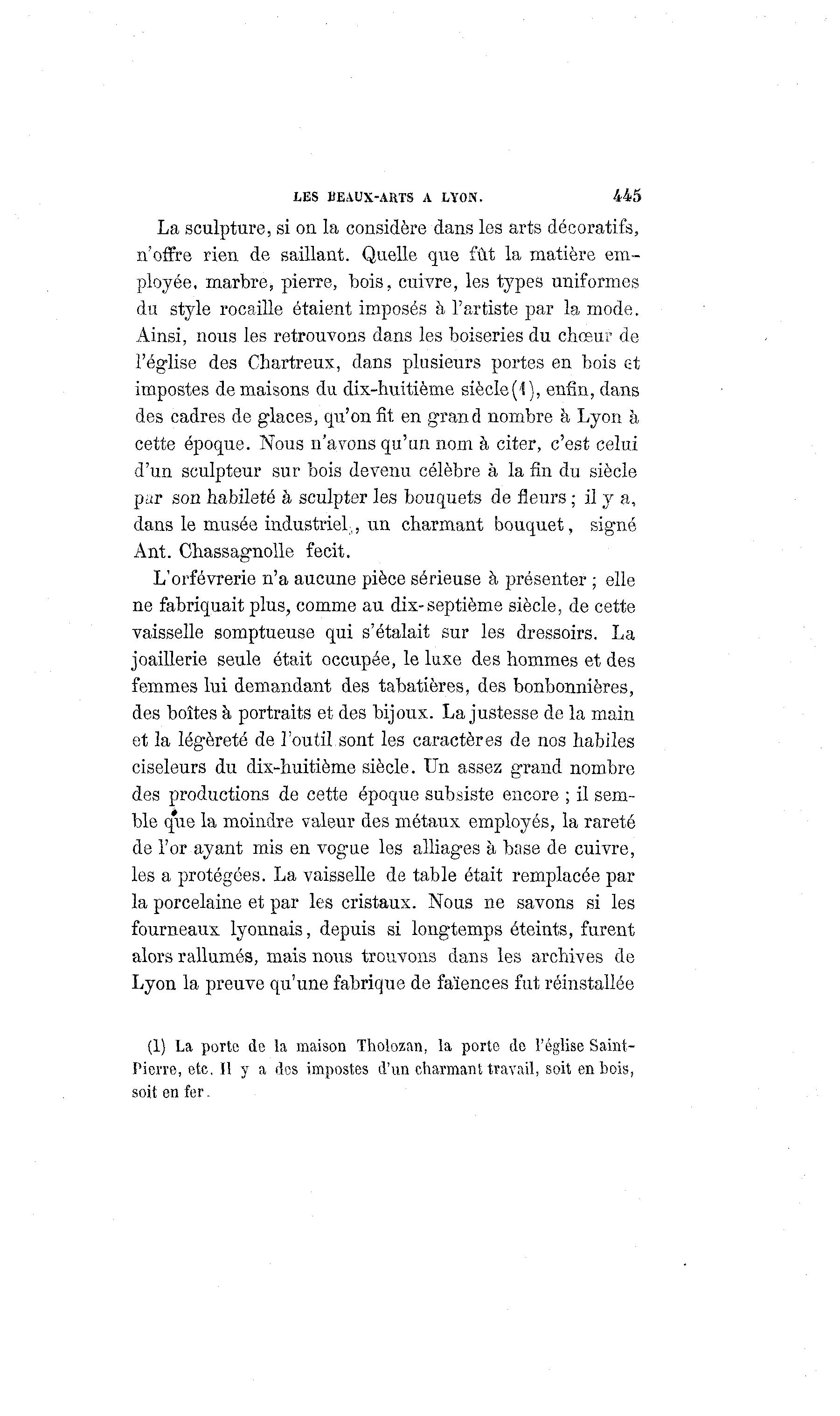 LES BEAUX-ARTS A LYON. 445 La sculpture, si on la considère dans les arts décoratifs, n'offre rien de saillant. Quelle que fût la matière em- ployée, marbre, pierre, bois, cuivre, les types uniformes du style rocaille étaient imposés à l'artiste par la mode. Ainsi, nous les retrouvons dans les boiseries du chœur de l'église des Chartreux, dans plusieurs portes en bois et impostes de maisons du dix-huitième siècle(1), enfin, dans des cadres de glaces, qu'on fit en grand nombre à Lyon à cette époque. Nous n'avons qu'un nom à citer, c'est celui d'un sculpteur sur bois devenu célèbre à la fin du siècle pur son habileté à sculpter les bouquets de fleurs ; il y a, dans le musée industriel,, un charmant bouquet, signé Ant. Chassagnolle fecit. L'orfèvrerie n'a aucune pièce sérieuse à présenter ; elle ne fabriquait plus, comme au dix-septième siècle, de cette vaisselle somptueuse qui s'étalait sur les dressoirs. La joaillerie seule était occupée, le luxe des hommes et des femmes lui demandant des tabatières, des bonbonnières, des boîtes à portraits et des bijoux. La justesse de la main et la légèreté de l'outil sont les caractères de nos habiles ciseleurs du dix-huitième siècle. Un assez grand nombre des productions de cette époque subsiste encore ; il sem- ble q*ue la moindre valeur des métaux employés, la rareté de l'or ayant mis en vogue les alliages à base de cuivre, les a protégées. La vaisselle de table était remplacée par la porcelaine et par les cristaux. Nous ne savons si les fourneaux lyonnais, depuis si longtemps éteints, furent alors rallumés, mais nous trouvons dans les archives de Lyon la preuve qu'une fabrique de faïences fut réinstallée (1) La porte de la maison Tholozan, la porte do l'église Saint- Pierre, etc. Il y a des impostes d'un charmant travail, soit en bois, soit en fer.