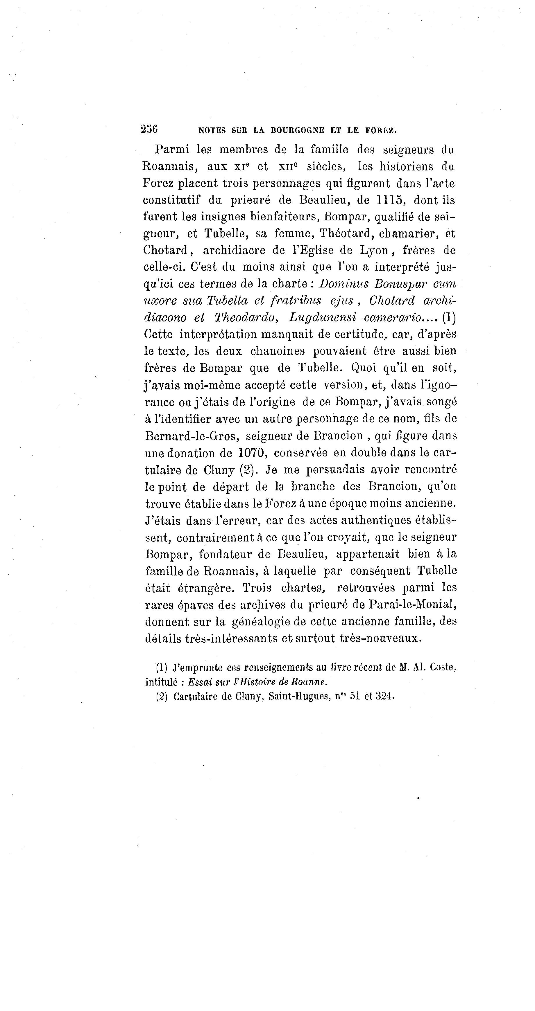 25G NOTES SUR LA BOURGOGNE ET LE FOREZ. Parmi les membres de la famille des seigneurs du Roannais, aux xie et xn e siècles, les historiens du Forez placent trois personnages qui figurent dans l'acte constitutif du prieuré de Beaulieu, de 1115, dont ils furent les insignes bienfaiteurs, Bompar, qualifié de sei- gneur, et Tubelle, sa femme, Théotard, chamarier, et Chotard, archidiacre de l'Eglise de Lyon, frères de celle-ci. C'est du moins ainsi que l'on a interprété jus- qu'ici ces termes de la charte : Dominus Bonuspar cum iiûcore sua Tubella et fratribus ejas , Chotard archi- diacono et Theodardo, Lugdunensi camerario.... (1) Cette interprétation manquait de certitude, car, d'après le texte, les deux chanoines pouvaient être aussi bien frères de Bompar que de Tubelle. Quoi qu'il en soit, j'avais moi-même accepté cette version, et, dans l'igno- rance ou j'étais de l'origine de ce Bompar, j'avais, songé à l'identifier avec un autre personnage de ce nom, fils de Bernard-le-Gros, seigneur de Brancion , qui figure dans une donation de 1070, conservée en double dans le car- tulaire de Cluny (2). Je me persuadais avoir rencontré le point de départ de la branche des Brancion, qu'on trouve établie dans le Forez aune époque moins ancienne. J'étais dans l'erreur, car des actes authentiques établis- sent, contrairement â ce que l'on croyait, que le seigneur Bompar, fondateur de Beaulieu, appartenait bien à la famille de Roannais, à laquelle par conséquent Tubelle était étrangère. Trois chartes, retrouvées parmi les rares épaves des archives du prieuré de Parai-le-Monial, donnent sur la généalogie de cette ancienne famille, des détails très-intéressants et surtout très-nouveaux. (1) J'emprunte ces renseignements au livre récent de M. Al. Coste,. intitulé : Essai sur l'Histoire de Roanne. (2) Cartulaire de Cluny, Saint-Hugues, n" 51 et 324.