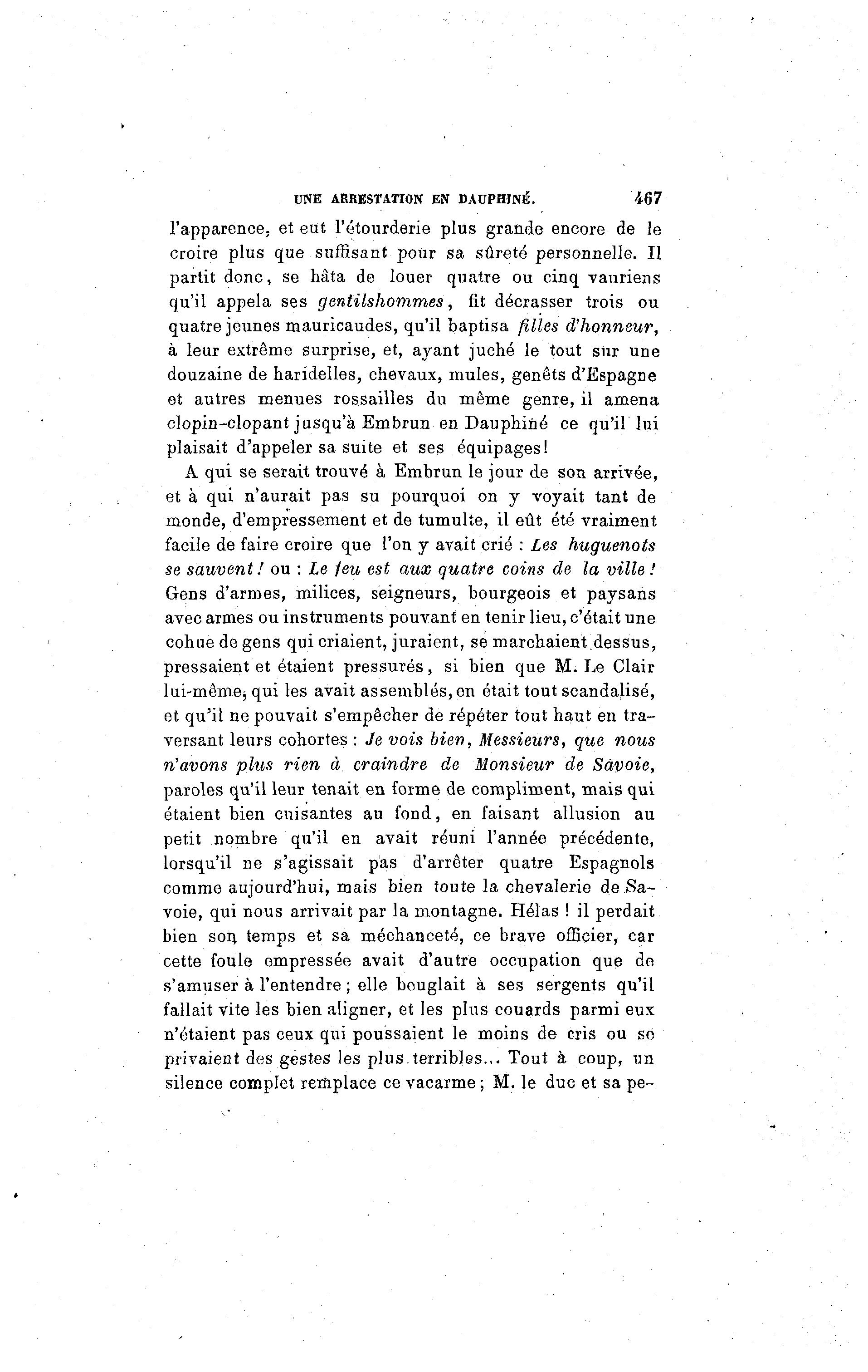 UNE ARRESTATION EN DAUPHINÉ. 467 l'apparence, et eut l'étourderie plus grande encore de le croire plus que suffisant pour sa sûreté personnelle. Il partit donc, se hâta de louer quatre ou cinq vauriens qu'il appela ses gentilshommes, fit décrasser trois ou quatre jeunes mauricaudes, qu'il baptisa filles d'honneur, à leur extrême surprise, et, ayant juché le tout sur une douzaine de haridelles, chevaux, mules, genêts d'Espagne et autres menues rossailles du même genre, il amena clopin-clopant jusqu'à Embrun en Dauphiné ce qu'il lui plaisait d'appeler sa suite et ses équipages! A qui se serait trouvé à Embrun le jour de son arrivée, et à qui n'aurait pas su pourquoi on y voyait tant de monde, d'empressement et de tumulte, il eût été vraiment facile de faire croire que l'on y avait crié : Les huguenots se sauvent! ou : Le ieu est aux quatre coins de la ville ! Gens d'armes, milices, seigneurs, bourgeois et paysans avec armes ou instruments pouvant en tenir lieu, c'était une cohue de gens qui criaient, juraient, se marchaient dessus, pressaient et étaient pressurés, si bien que M. Le Clair lui-mêmej qui les avait assemblés, en était tout scandalisé, et qu'il ne pouvait s'empêcher de répéter tout haut en tra- versant leurs cohortes : Je vois bien, Messieurs, que nous n'avons plus rien à craindre de Monsieur de Savoie, paroles qu'il leur tenait en forme de compliment, mais qui étaient bien cuisantes au fond, en faisant allusion au petit nombre qu'il en avait réuni l'année précédente, lorsqu'il ne s'agissait pas d'arrêter quatre Espagnols comme aujourd'hui, mais bien toute la chevalerie de Sa- voie, qui nous arrivait par la montagne. Hélas ! il perdait bien soii temps et sa méchanceté, ce brave officier, car cette foule empressée avait d'autre occupation que de s'amuser à l'entendre ; elle beuglait à ses sergents qu'il fallait vite les bien aligner, et les plus couards parmi eux n'étaient pas ceux qui poussaient le moins de cris ou se privaient des gestes les plus terribles.,. Tout à coup, un silence complet remplace ce vacarme ; M. le duc et sa pe-