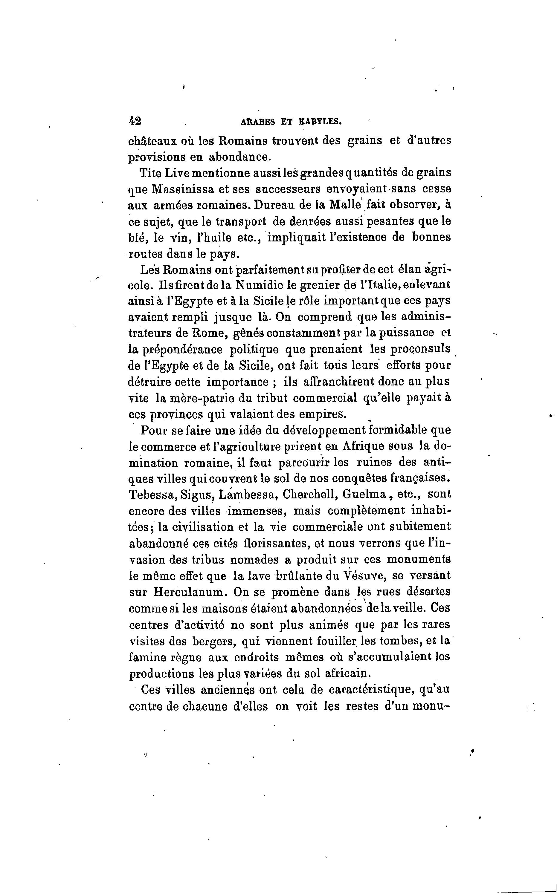 42 ARABES ET KABYLES. châteaux où les Romains trouvent des grains et d'autres provisions en abondance. Tite Live mentionne aussi les grandes quantités de grains que Massinissa et ses successeurs envoyaient sans cesse aux armées romaines. Dureau de la Malle' fait observer, à ce sujet, que le transport de denrées aussi pesantes que le blé, le vin, l'huile etc., impliquait l'existence de bonnes routes dans le pays. Les Romains ont parfaitement su profiter de cet élan agri- cole. Ilsfirentdela Numidie le grenier de l'Italie,enlevant ainsi à l'Egypte et à la Sicile le rôle important que ces pays avaient rempli jusque là . On comprend que les adminis- trateurs de Rome, gênés constamment par la puissance et la prépondérance politique que prenaient les proconsuls de l'Egypte et de la Sicile, ont fait tous leurs efforts pour détruire cette importance ; ils affranchirent donc au plus vite la mère-patrie du tribut commercial qu'elle payait à ces provinces qui valaient des empires. Pour se faire une idée du développement formidable que le commerce et l'agriculture prirent en Afrique sous la do- mination romaine, il faut parcourir les ruines des anti- ques villes qui couvrent le sol de nos conquêtes françaises. Tebessa, Sigus, Lambessa, Cherchell, Guelma,, etc., sont encore des villes immenses, mais complètement inhabi- tées; la civilisation et la vie commerciale ont subitement abandonné ces cités florissantes, et nous verrons que l'in- vasion des tribus nomades a produit sur ces monuments le même effet que la lave brûlante du Vésuve, se versant sur Herculanum. On se promène dans les rues désertes comme si les maisons étaient abandonnées de la veille. Ces centres d'activité ne sont plus animés que par les rares visites des bergers, qui viennent fouiller les tombes, et la famine règne aux endroits mêmes où s'accumulaient les productions les plus variées du sol africain. Ces villes anciennes ont cela de caractéristique, qu'au centre de chacune d'elles on voit les restes d'un monu-