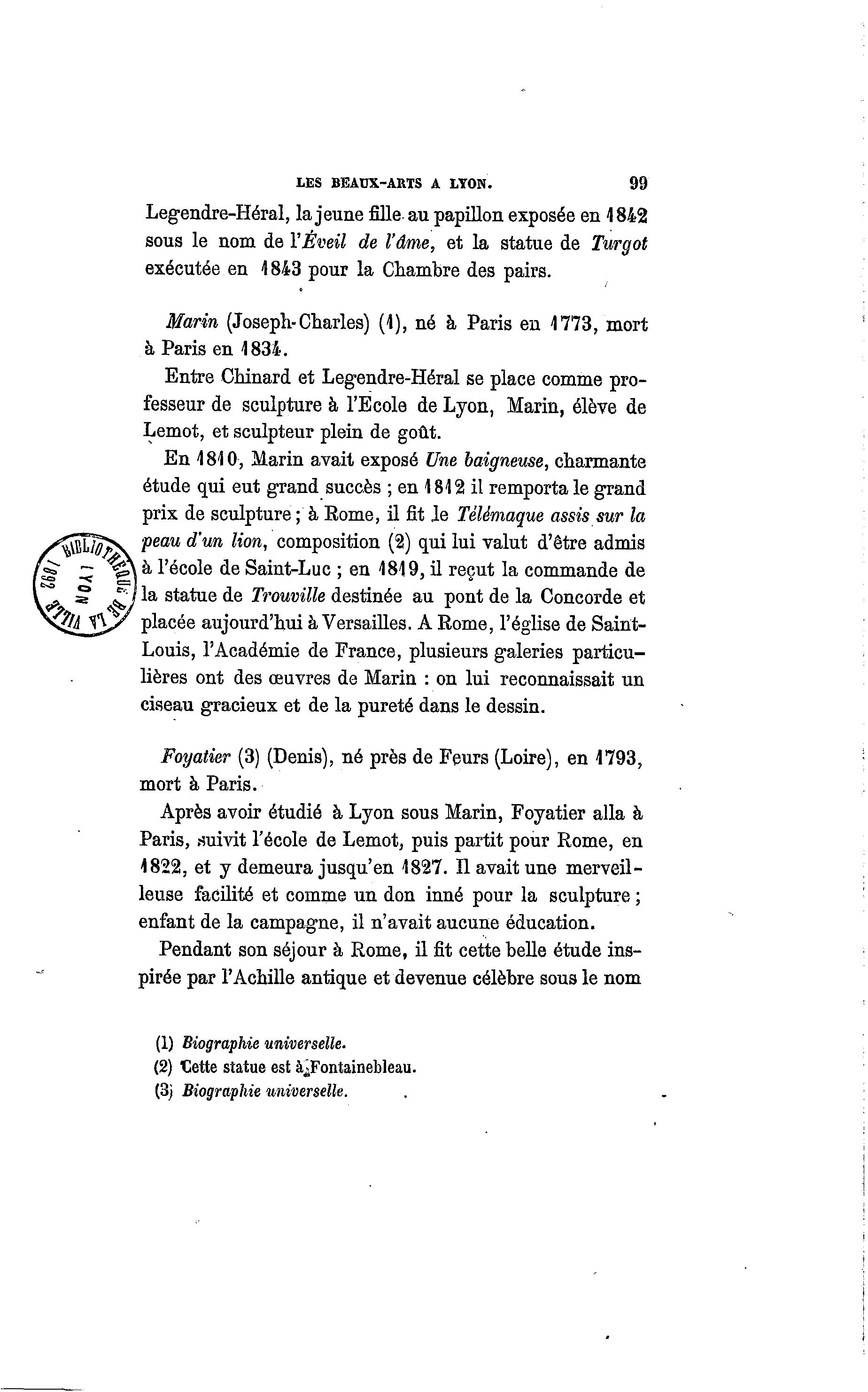 LES BEAUX-ARTS A LYON. 99 Legendre-Héral, la jeune fille au papillon exposée en 4842 sous le nom de l'Éveil de l'âme, et la statue de Turgot exécutée en 4843 pour la Chambre des pairs. Marin (Joseph-Charles) (4), né à Paris en 4773, mort à Paris en 4834. Entre Chinard et Legendre-Héral se place comme pro- fesseur de sculpture à l'Ecole de Lyon, Marin, élève de Lemot, et sculpteur plein de goût. En 4810, Marin avait exposé Une baigneuse, charmante étude qui eut grand succès ; en 1812 il remporta le grand prix de sculpture ; à Rome, il fit Je Télémaque assis sur la peau d'un lion, composition (2) qui lui valut d'être admis à l'école de Saint-Luc ; en 1819, il reçut la commande de la statue de Trouville destinée au pont de la Concorde et placée aujourd'hui à Versailles. A Rome, l'église de Saint- Louis, l'Académie de France, plusieurs galeries particu- lières ont des œuvres de Marin : on lui reconnaissait un ciseau gracieux et de la pureté dans le dessin. Foyatier (3) (Denis), né près de Feurs (Loire), en 4793, mort à Paris. Après avoir étudié à Lyon sous Marin, Foyatier alla à Paris, .suivit l'école de Lemot, puis partit pour Rome, en 4822, et y demeura jusqu'en 1827. Il avait une merveil- leuse facilité et comme un don inné pour la sculpture ; enfant de la campagne, il n'avait aucune éducation. Pendant son séjour à Rome, il fit cette belle étude ins- pirée par l'Achille antique et devenue célèbre sous le nom (1) Biographie universelle. (2) Cette statue est à ^Fontainebleau. (3! Biographie universelle.