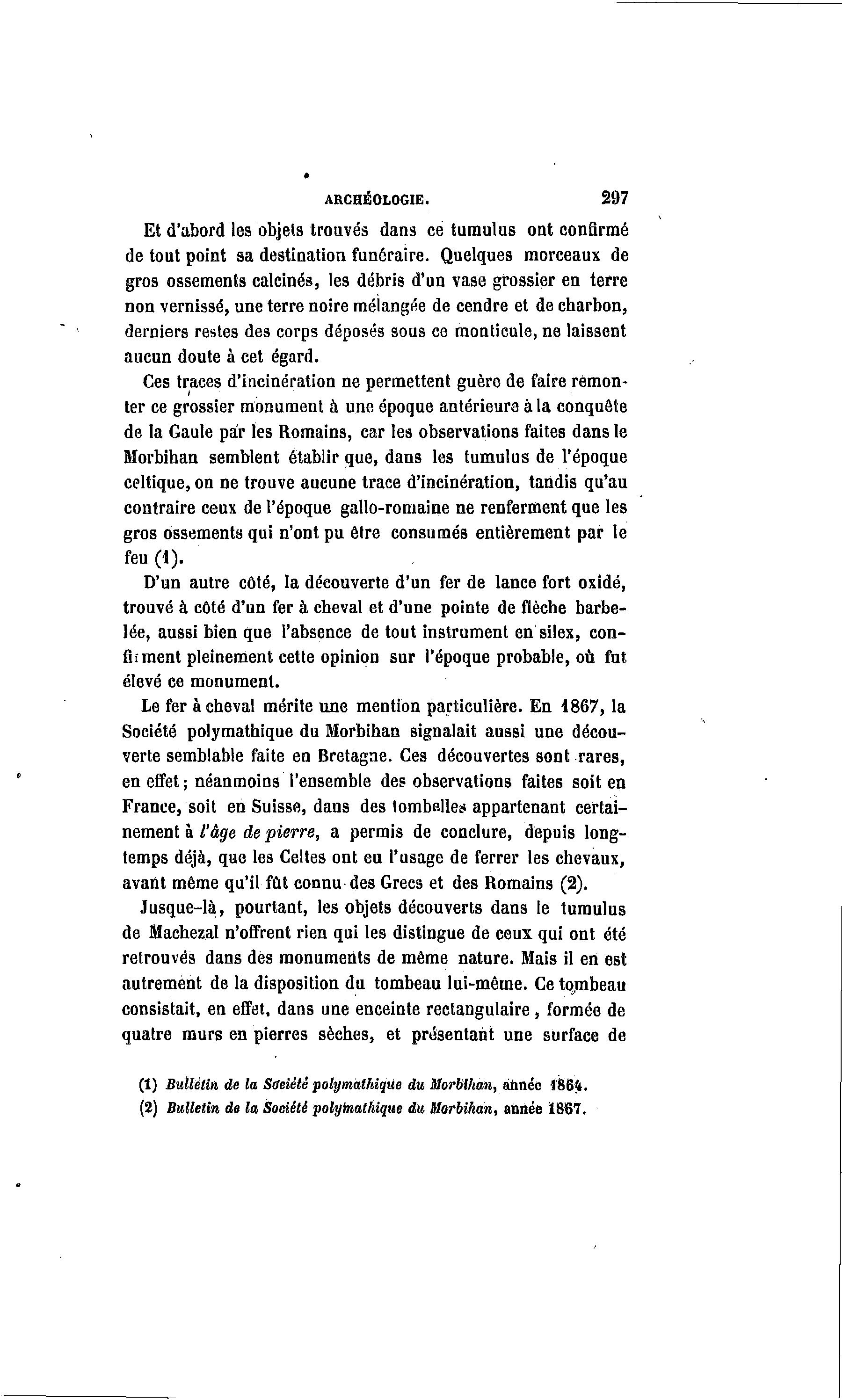 ARCHÉOLOGIE. 297 Et d'abord les objets trouvés dans ce tumulus ont confirmé de tout point sa destination funéraire. Quelques morceaux de gros ossements calcinés, les débris d'un vase grossier en terre non vernissé, une terre noire mélangée de cendre et de charbon, derniers restes des corps déposés sous ce monticule, ne laissent aucun doute à cet égard. Ces traces d'incinération ne permettent guère de faire rémon- ter ce grossier monument à une époque antérieure à la conquête de la Gaule par les Romains, car les observations faites dans le Morbihan semblent établir que, dans les tumulus de l'époque celtique, on ne trouve aucune trace d'incinération, tandis qu'au contraire ceux de l'époque gallo-romaine ne renferment que les gros ossements qui n'ont pu être consumés entièrement par le feu (1). D'un autre côté, la découverte d'un fer de lance fort oxidé, trouvé à côté d'un fer à cheval et d'une pointe de flèche barbe- lée, aussi bien que l'absence de tout instrument en silex, con- fis ment pleinement cette opinion sur l'époque probable, où fut élevé ce monument. Le fer achevai mérite une mention particulière. En 4867, la Société polymathique du Morbihan signalait aussi une décou- verte semblable faite en Bretagne. Ces découvertes sont rares, en effet ; néanmoins l'ensemble des observations faites soit en France, soit en Suisse, dans des tombelles appartenant certai- nement à l'âge de pierre, a permis de conclure, depuis long- temps déjà , que les Celtes ont eu l'usage de ferrer les chevaux, avant même qu'il fût connu des Grecs et des Romains (2). Jusque-là , pourtant, les objets découverts dans le tumulus de Machezal n'offrent rien qui les distingue de ceux qui ont été retrouvés dans dès monuments de même nature. Mais il en est autrement de la disposition du tombeau lui-même. Ce tombeau consistait, en effet, dans une enceinte rectangulaire , formée de quatre murs en pierres sèches, et présentant une surface de (1) Bulletin de la StJeiêtê potymà thiqUe du Morbihan, année 1864. (2) Bulletin de la Société polymathique du Morbihan, année 1867.