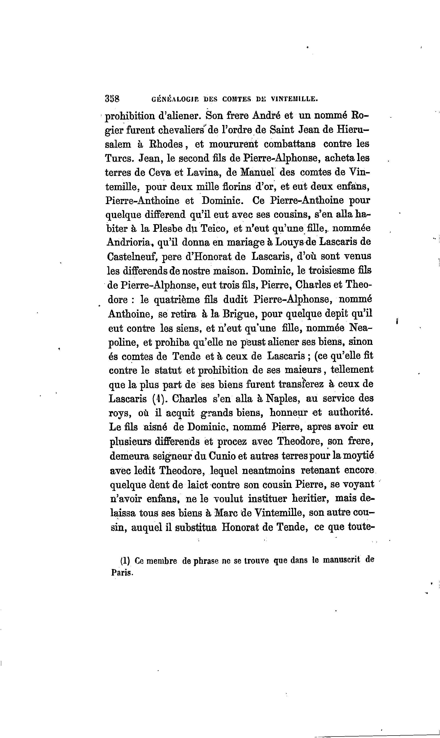 358 GÉNÉALOGIE DES COMTES DE VINTEMILLE. prohibition d'aliéner. Son frère André et un nommé Ro- gier furent chevaliers* de l'ordre de Saint Jean de Hieru- salem à Rhodes, et moururent combattans contre les Turcs. Jean, le second fils de Pierre-Alphonse, acheta les terres de Ceva et Lavina, de Manuel des comtes de Vin- temille, pour deux mille florins d'or, et eut deux enfans, Pierre-Anthoine et Dominic. Ce Pierre-Anthoine pour quelque différend qu'il eut avec ses cousins, s'en alla ha- biter à la Plesbe d)i Teico, et n'eut qu'une fille,, nommée Andrioria, qu'il donna en mariage à Louys de Lascaris de Castelneuf, père d'Honorat de Lascaris, d'où sont venus les différends de nostre maison. Dominic, le troisiesme fils de Pierre-Alphonse, eut trois fils, Pierre, Charles et Théo- dore : le quatrième fils dudit Pierre-Alphonse, nommé Anthoine, se retira à la Brigue, pour quelque dépit qu'il eut contre les siens, et n'eut qu'une fille, nommée Nea- poline, et prohiba qu'elle ne peust aliéner ses biens, sinon es comtes de Tende et à ceux de Lascaris ; (ce qu'elle fit contre le statut et prohibition de ses maieurs, tellement que la plus part de ses biens furent transferez à ceux de Lascaris (1). Charles s'en alla à Naples, au service des roys, où il acquit grands biens, honneur et authorité. Le fils aisné de Dominic, nommé Pierre, après avoir eu plusieurs différends et procez avec Théodore, son frère, demeura seigneur du Cunio et autres terres pour lamoytié avec ledit Théodore, lequel neantmoins retenant encore quelque dent de laict contre son cousin Pierre, se voyant n'avoir enfans, ne le voulut instituer héritier, mais dé- laissa tous ses biens à Marc de Vintemille, son autre cou- sin, auquel il substitua Honorât de Tende, ce que toute- (1) Ce membre de phrase ne se trouve que dans le manuscrit de Paris.