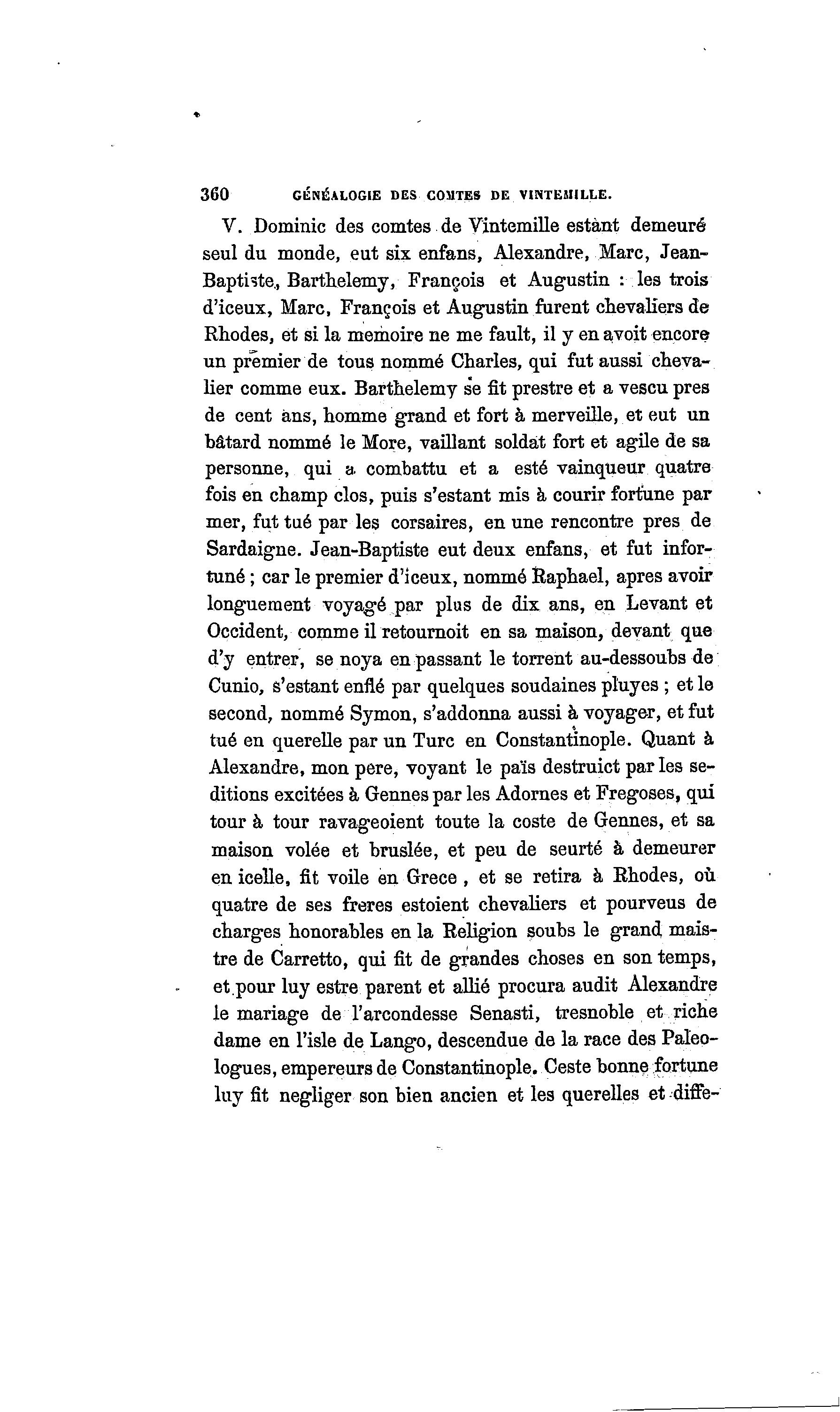 360 GÉNÉALOGIE DES COMTES DE VINTES» LLE. V. Dominic des comtes de Yintemille estant demeuré seul du monde, eut six enfans, Alexandre, Marc, Jean- Baptiste., Barthélémy, François et Augustin : les trois d'iceux, Marc, François et Augustin furent chevaliers de Rhodes, et si la mémoire ne me fault, il y en avoit encore un premier de tous nommé Charles, qui fut aussi cheva- lier comme eux. Barthélémy s'e fit prestre et a vescu près de cent ans, homme grand et fort à merveille, et eut un bâtard nommé le More, vaillant soldât fort et agile de sa personne, qui a combattu et a esté vainqueur quatre fois en champ clos, puis s'estant mis à courir fortune par mer, fut tué par les corsaires, en une rencontre près de Sardaigne. Jean-Baptiste eut deux enfans, et fut infor- tuné ; car le premier d'iceux, nommé Raphaël, après avoir longuement voyagé par plus de dix ans, en Levant et Occident, comme il retournoit en sa maison, devant que d'y entrer, se noya en passant le torrent au-dessoubs de Cunio, s'estant enflé par quelques soudaines pluyes ; et le second, nommé Symon, s'addonna aussi à voyager, et fut tué en querelle par un Turc en Constantinople. Quant à Alexandre, mon père, voyant le pais destruict parles sé- ditions excitées à Gennespar les Adornes et Fregoses, qui tour à tour ravageoient toute la coste de Gennes, et sa maison volée et bruslée, et peu de seurté à demeurer en icelle, fit voile en Grèce , et se retira à Rhodes, où quatre de ses frères estoient chevaliers et pourveus de charges honorables en la Religion soubs le grand mais- tre de Carretto, qui fit de grandes choses en son temps, et.pour luy estre parent et allié procura audit Alexandre le mariage de Tarcondesse Senasti, tresnoble et riche dame en l'isle de Lango, descendue de la race des Paleo- logues, empereurs de Constantinople. Ceste bonne fortune luy fit négliger son bien ancien et les querelles et diffe-