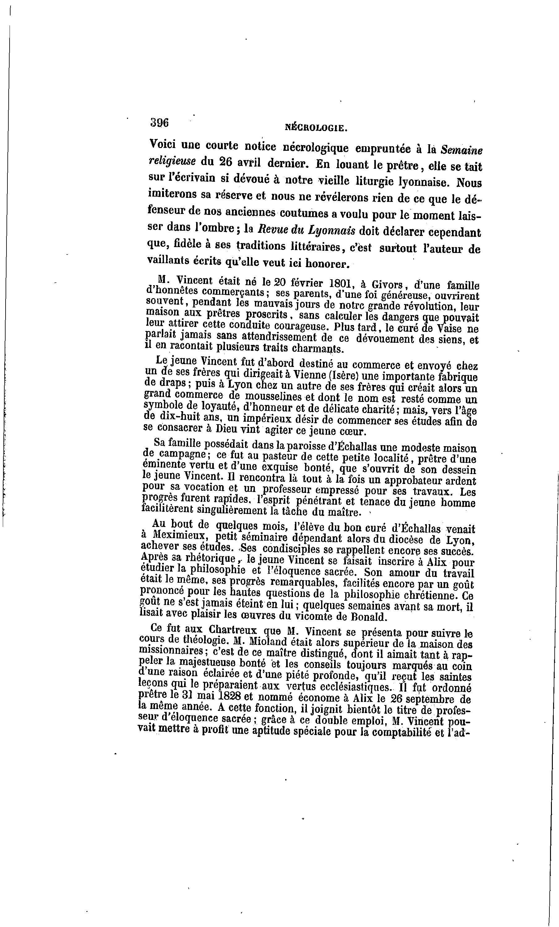 396 NÉCROLOGIE. Voici une courte notice nécrologique empruntée à là Semaine religieuse du 26 avril dernier. En louant le prêtre, elle se tait sur l'écrivain si dévoué à notre vieille liturgie lyonnaise. Nous imiterons sa réserve et nous ne révélerons rien de ce que le dé- fenseur de nos anciennes coutumes a voulu pour le moment lais- ser dans l'ombre ; la Revue du Lyonnais doit déclarer cependant que, fidèle à ses traditions littéraires, c'est surtout l'auteur de vaillants écrits qu'elle veut ici honorer. M. Vincent était né le 20 février 1801, à Givors, d'une famille d'honnêtes commerçants ; ses parents, d'une foi généreuse, ouvrirent souvent, pendant les mauvais jours de notre grande révolution, leur maison aux prêtres proscrits, sans calculer les dangers que pouvait leur attirer cette conduite courageuse. Plus tard, le curé de Vaise ne parlait jamais sans attendrissement de ce dévouement des siens, et il en racontait plusieurs traits charmants. Le jeune Vincent fut d'abord destiné au commerce et envoyé chez un de ses frères qui dirigeait à Vienne (Isère) une importante fabrique de draps ; puis à Lyon chez un autre de ses frères qui créait alors un grand commerce de mousselines et dont le nom est resté comme un symbole de loyauté, d'honneur et de délicate charité ; mais, vers l'âge de dix-huit ans, un impérieux désir de commencer ses études afin de se consacrer à Dieu vint agiter ce jeune cœur. Sa famille possédait dans la paroisse d'Échallas une modeste maison de campagne; ce fut au pasteur de cette petite localité, prêtre d'une éminente vertu et d'une exquise bonté, que s'ouvrit de son dessein le jeune Vincent. Il rencontra là tout à la fois un approbateur ardent pour sa vocation et un professeur empressé pour ses travaux. Les progrès furent rapides, l'esprit pénétrant et tenace du jeune homme facilitèrent singulièrement la tâche du maître. ' Au bout de quelques mois, l'élève du bon curé d'Échallas venait à Meximieux, petit séminaire dépendant alors du diocèse de Lyon, achever ses études. .Ses condisciples se rappellent encore ses succès. Après sa rhétorique,- le jeune Vincent se faisait inscrire à Alix pour étudier la philosophie et l'éloquence sacrée. Son amour du travail était le même, ses progrès remarquables, facilités encore par un goût prononcé pour les hautes questions de la philosophie chrétienne. Ce goût ne s'est jamais éteint en lui ; quelques semaines avant sa mort, il lisait avec plaisir les œuvres du vicomte de Bonald. Ce fut aux Chartreux que M. Vincent se présenta pour suivre le cours de théologie. M. Mioland était alors supérieur de la maison des missionnaires ; c'est de ce maître distingué, dont il aimait tant à rap- peler la majestueuse bonté et les conseils toujours marqués au coin d'une raison éclairée et d'une piété profonde, qu'il reçut les saintes leçons qui le préparaient aux vertus ecclésiastiques. Il fut ordonné prêtre le 31 mai 1828 et nommé économe à Alix le 26 septembre de la même année. A cette fonction, il joignit bientôt le titre de profes- seur d'éloquence sacrée ; grâce à ce double emploi, M. Vincent pou- vait mettre à profit une aptitude spéciale pour la comptabilité et l'ad-
