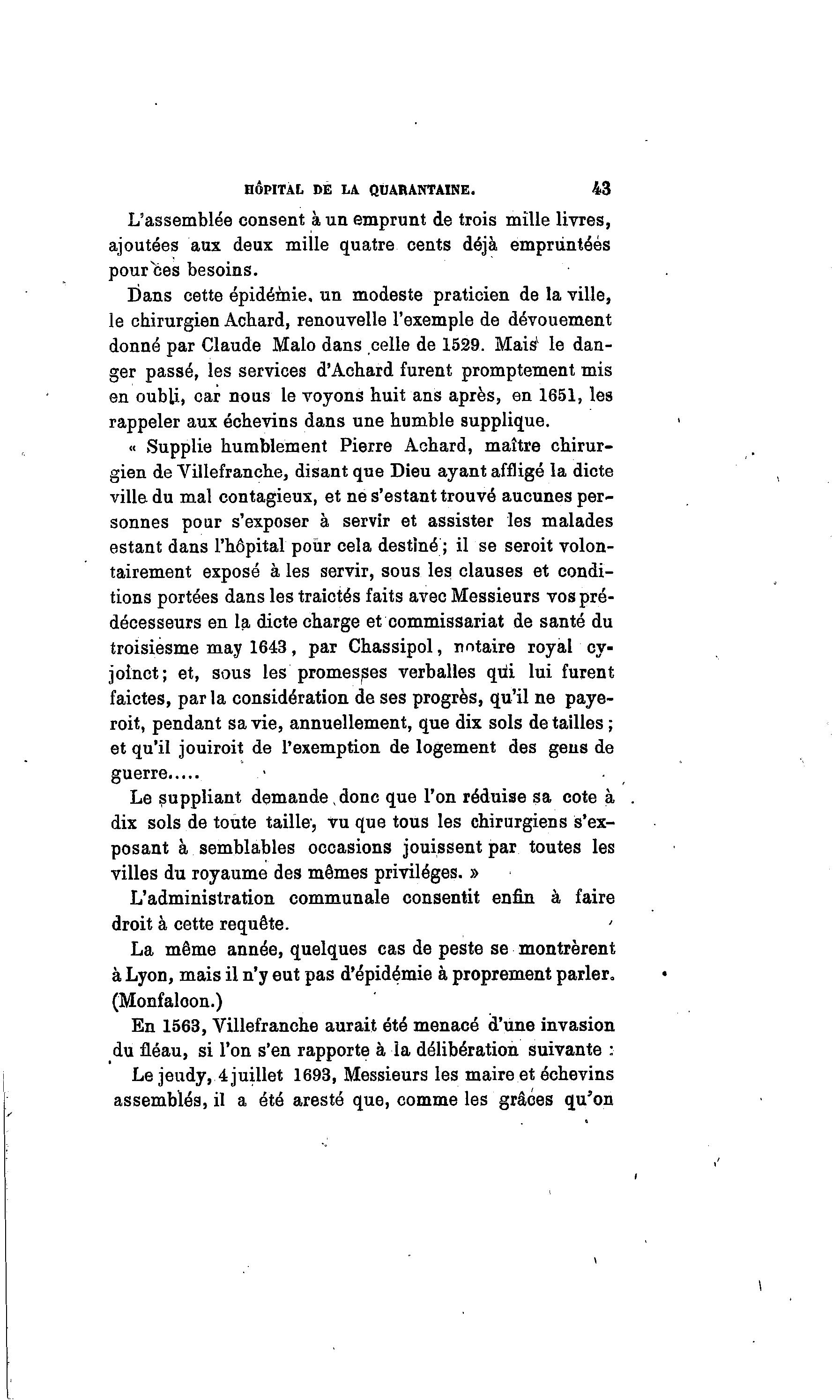 HÔPITAL DE LA QUARANTAINE. 43 L'assemblée consent à un emprunt de trois mille livres, ajoutées aux deux mille quatre cents déjà empruntées pourvces besoins. Dans cette épidémie, un modeste praticien de la ville, le chirurgien Achard, renouvelle l'exemple de dévouement donné par Claude Malo dans celle de 1529. Maisv le dan- ger passé, les services d'Achard furent promptement mis en oubli, car nous le voyons huit ans après, en 1651, les rappeler aux échevins dans une humble supplique. « Supplie humblement Pierre Achard, maître chirur- gien de Villefranche, disant que Dieu ayant affligé la dicte ville du mal contagieux, et ne s'estant trouvé aucunes per- sonnes pour s'exposer à servir et assister les malades estant dans l'hôpital pour cela destiné ; il se seroit volon- tairement exposé à les servir, sous les clauses et condi- tions portées dans les traictés faits avec Messieurs vos pré- décesseurs en la dicte charge et commissariat de santé du troisiesme may 1643, par Chassipol, notaire royal cy- joinct; et, sous les promesses verballes qui lui furent faictes, par la considération de ses progrès, qu'il ne paye- roit, pendant sa vie, annuellement, que dix sols détailles ; et qu'il jouiroit de l'exemption de logement des gens de guerre Le suppliant demande donc que l'on réduise sa cote à dix sols de toute taille-, vu que tous les chirurgiens s'ex- posant à semblables occasions jouissent par toutes les villes du royaume des mêmes privilèges. » L'administration communale consentit enfin à faire droit à cette requête. La même année, quelques cas de peste se montrèrent à Lyon, mais il n'y eut pas d'épidémie à proprement parler. (Monfaloon.) En 1563, Villefranche aurait été menacé d'une invasion du fléau, si l'on s'en rapporte à la délibération suivante : Le jeudy, 4 juillet 1693, Messieurs les maire et échevins assemblés, il a été aresté que, comme les grâces qu'on