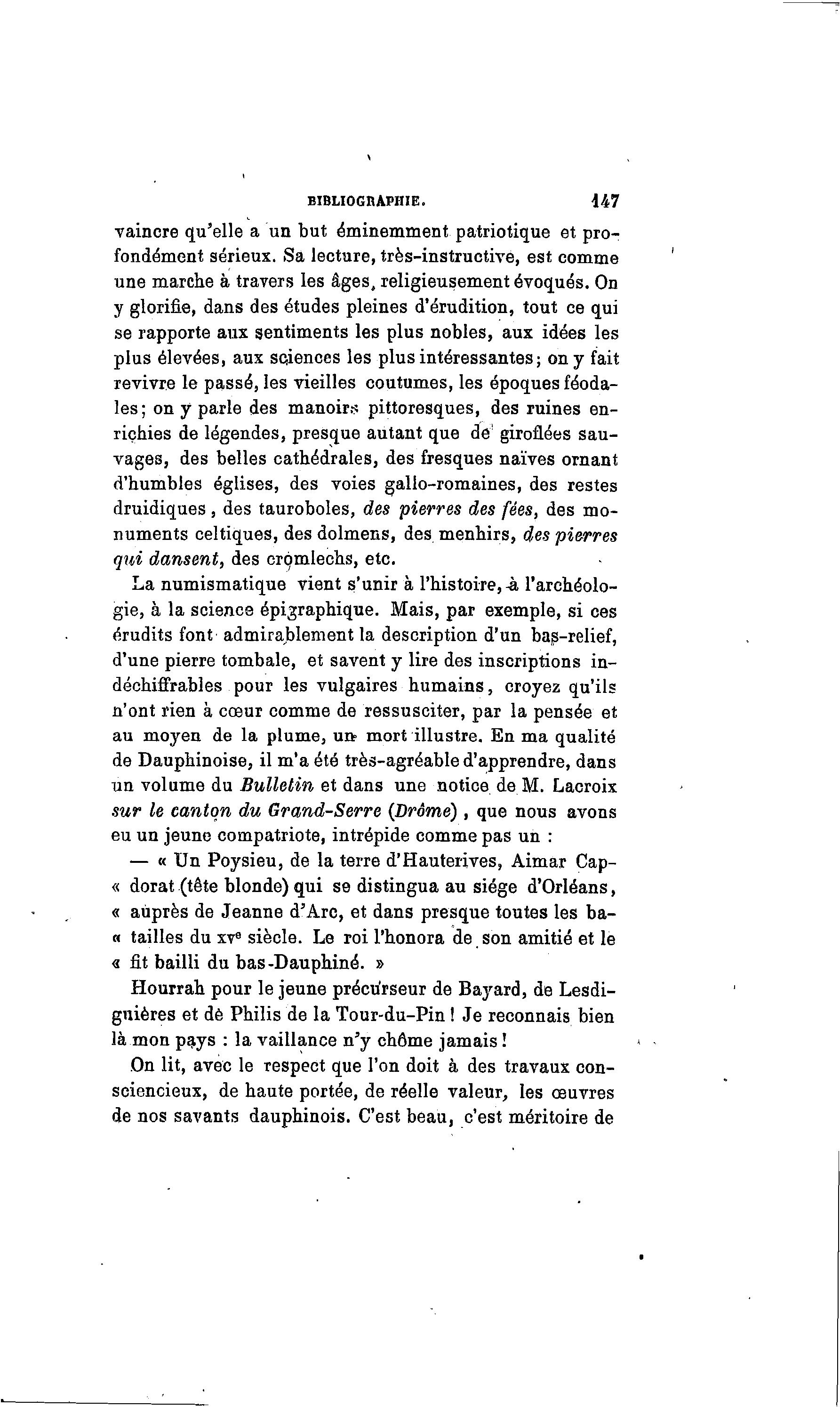 BIBLIOGKAPHIE. 147 vaincre qu'elle a un but éminemment patriotique et pro- fondément sérieux. Sa lecture, très-instructive, est comme une marche à travers les âges, religieusement évoqués. On y glorifie, dans des études pleines d'érudition, tout ce qui se rapporte aux sentiments les plus nobles, aux idées les plus élevées, aux sciences les plus intéressantes ; on y fait revivre le passé, les vieilles coutumes, les époques féoda- les; on y parle des manoirs pittoresques, des ruines en- richies de légendes, presque autant que deJ giroflées sau- vages, des belles cathédrales, des fresques naïves ornant d'humbles églises, des voies gallo-romaines, des restes druidiques, des tauroboles, des pierres des fées, des mo- numents celtiques, des dolmens, des menhirs, des pierres qui dansent, des cromlechs, etc. La numismatique vient s'unir à l'histoire, -à l'archéolo- gie, à la science épigraphique. Mais, par exemple, si ces érudits font admirablement la description d'un bas-relief, d'une pierre tombale, et savent y lire des inscriptions in- déchiffrables pour les vulgaires humains, croyez qu'ils n'ont rien à cœur comme de ressusciter, par la pensée et au moyen de la plume, un? mort illustre. En ma qualité de Dauphinoise, il m'a été très-agréable d'apprendre, dans un volume du Bulletin et dans une notice de M. Lacroix sur le canton du Grand-Serre (Drômé), que nous avons eu un jeune compatriote, intrépide comme pas un : — « Un Poysieu, de la terre d'Hauterives, Aimar Cap- « dorât (tête blonde) qui se distingua au siège d'Orléans, « auprès de Jeanne d'Arc, et dans presque toutes les ba- « tailles du xve siècle. Le roi l'honora de son amitié et le « fit bailli du bas-Dauphiné. » Hourrah pour le jeune précurseur de Bayard, de Lesdi- gnières et de Philis de la Tour-du-Pin ! Je reconnais bien là mon pays : la vaillance n'y chôme jamais ! On lit, avec le respect que l'on doit à des travaux con- sciencieux, de haute portée, de réelle valeur, les œuvres de nos savants dauphinois. C'est beau, c'est méritoire de