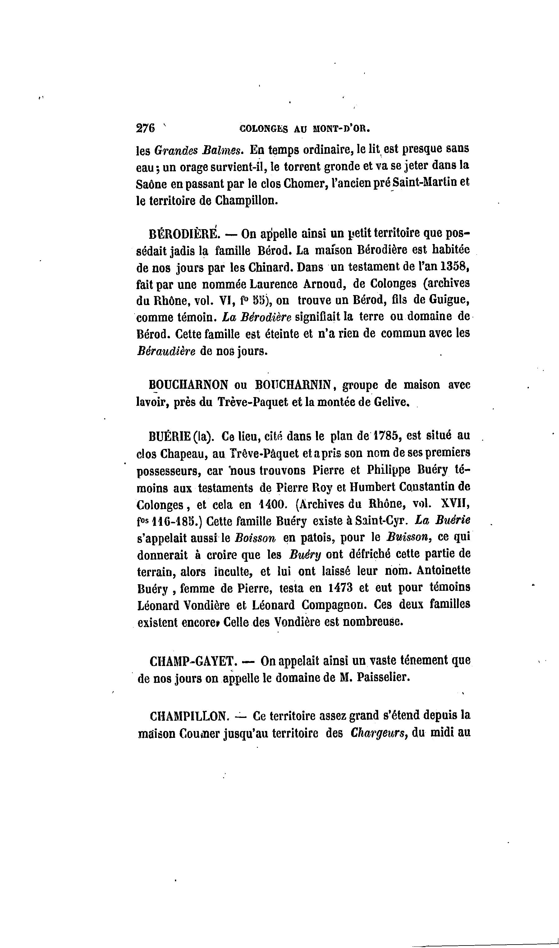 276 " COLONGES AU MONT-D'OR. les Grandes Balmes. En temps ordinaire, le lit est presque sans eau ; un orage survient-il, le torrent gronde et va se jeter dans la Saône en passant par le clos Chômer, l'ancien pré Saint-Martin et le territoire de Champillon. BERODIÈRE. — On appelle ainsi un petit territoire que pos- sédait jadis la famille Bérod. La maison Berodière est habitée de nos jours par les Chinard. Dans un testament de l'an 1358, fait par une nommée Laurence Arnoud, de Colonges (archives du Rhône, vol. VI, f° 33), on trouve un Bérod, flls de Guigue, comme témoin. La Berodière signifiait la terre ou domaine de Bérod. Cette famille est éteinte et n'a rien de commun avec les Béraudière de nos jours. BOUCHARNON ou BOUCHARNIN, groupe de maison avec lavoir, près du Trève-Paquet et la montée de Gelive. BUÉRIE(la). Ce lieu, cité dans le plan de 1785, est situé au clos Chapeau, au Trêve-Pâquet etapris son nom de ses premiers possesseurs, car 'nous trouvons Pierre et Philippe Buéry té- moins aux testaments de Pierre Roy et Humbert Constantin de Colonges, et cela en 1400. (Archives du Rhône, vol. XVII, fos 116-183.) Cette famille Buéry existe à Saint-Cyr. La Buérie s'appelait aussi le Boisson en patois, pour le Buisson, ce qui donnerait à croire que les Buéry ont défriché cette partie de terrain, alors inculte, et lui ont laissé leur nom. Antoinette Buéry , femme de Pierre, testa en 1473 et eut pour témoins Léonard Vondière et Léonard Compagnon. Ces deux familles existent encore» Celle des Vondière est nombreuse. CHAMP-GAYET. — On appelait ainsi un vaste ténement que de nos jours on appelle le domaine de M. Paisselier. CHAMPILLON. — Ce territoire assez grand s'étend depuis la maison Courtier jusqu'au territoire des Chargeurs, du midi au