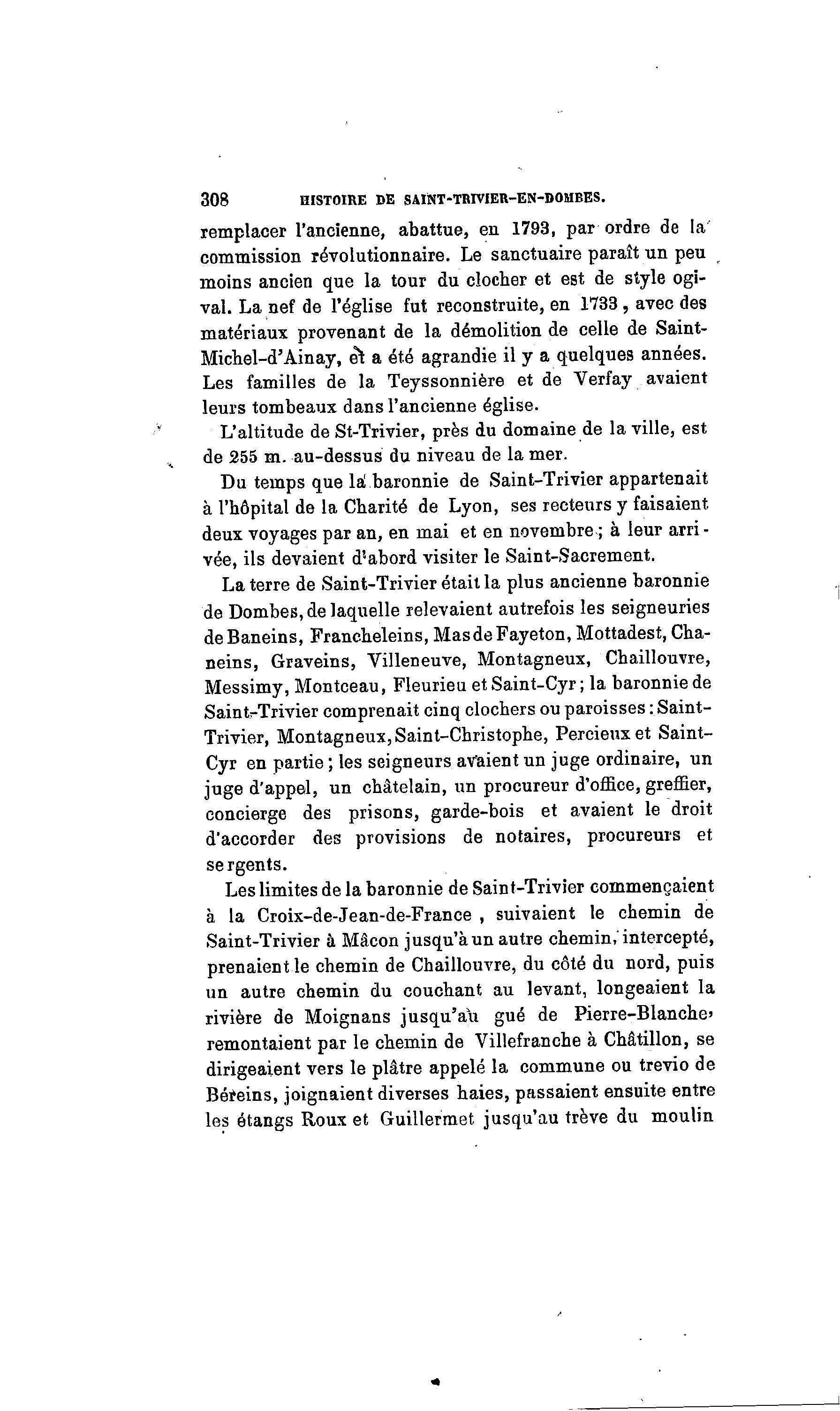 308 HISTOIRE DE SAINT-TMVIER-EN-DOMBES. remplacer l'ancienne, abattue, en 1793, par ordre de la' commission révolutionnaire. Le sanctuaire paraît un peu moins ancien que la tour du clocher et est de style ogi- val. La nef de l'église fut reconstruite, en 1733 , avec des matériaux provenant de la démolition de celle de Saint- Michel-d'Ainay, et a été agrandie il y a quelques années. Les familles de la Teyssonnière et de Verfay avaient leurs tombeaux dans l'ancienne église. L'altitude de St-Trivier, près du domaine de la ville, est de 255 m. au-dessus du niveau de la mer. Du temps que là baronnie de Saint-Trivier appartenait à l'hôpital de la Charité de Lyon, ses recteurs y faisaient deux voyages par an, en mai et en novembre ; à leur arri- vée, ils devaient d'abord visiter le Saint-Sacrement. La terre de Saint-Trivier était la plus ancienne baronnie de Dombes, de laquelle relevaient autrefois les seigneuries deBaneins, Francheleins, MasdeFayeton, Mottadest, Cha- neins, Graveins, Villeneuve, Montagneux, Chaillouvre, Messimy, Montceau, Fleurieu etSaint-Cyr; la baronnie de SaintrTrivier comprenait cinq clochers ou paroisses : Saint- Trivier, Montagneux, Saint-Christophe, Percieuxet Saint- Cyr en partie ; les seigneurs avaient un juge ordinaire, un juge d'appel, un châtelain, un procureur d'office, greffier, concierge des prisons, garde-bois et avaient le droit d'accorder des provisions de notaires, procureurs et sergents. Les limites de la baronnie de Saint-Trivier commençaient à la Croix-de-Jean-de-France , suivaient le chemin de Saint-Trivier à Mâcon jusqu'à un autre chemin,'intercepté, prenaient le chemin de Chaillouvre, du côté du nord, puis un autre chemin du couchant au levant, longeaient la rivière de Moignans jusqu'au gué de Pierre-Blanche> remontaient par le chemin de Villefranche à Châtillon, se dirigeaient vers le plâtre appelé la commune ou trevio de Béreins, joignaient diverses haies, passaient ensuite entre les étangs Roux et Guillermet jusqu'au trêve du moulin