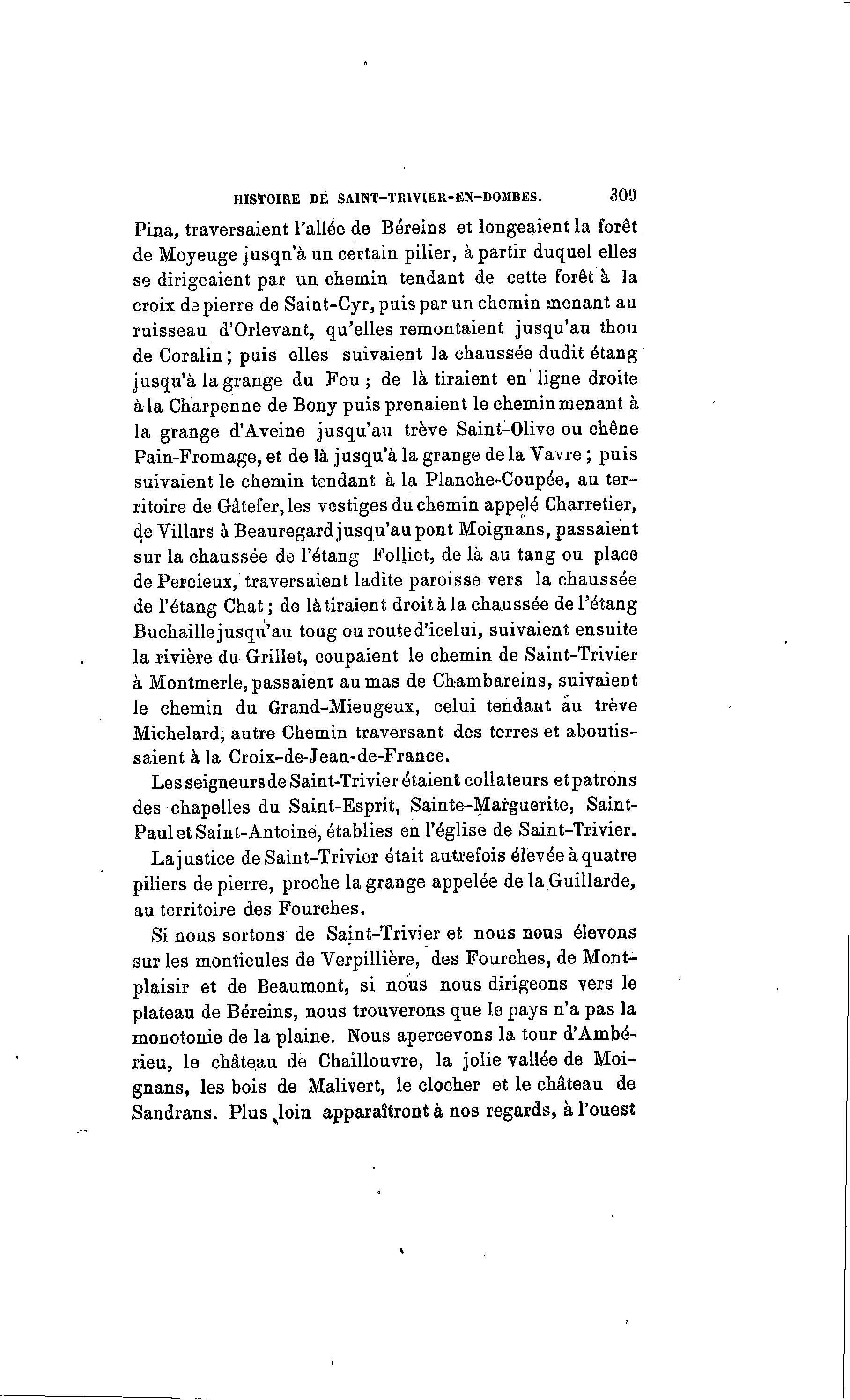 HISÃOIRE DE SAINT-TR1VIE.R-EN-D0MBES. 30!) Pina, traversaient l'allée de Béreins et longeaient la forêt de Moyeuge jusqu'à un certain pilier, à partir duquel elles se dirigeaient par un chemin tendant de cette forêt à la croix ds pierre de Saint-Cyr, puis par un chemin menant au ruisseau d'Orlevant, qu'elles remontaient jusqu'au thou de Coralin ; puis elles suivaient la chaussée dudit étang jusqu'à lagrange du F o u ; de là tiraient en ligne droite à l a Charpenne de Bony puis prenaient le cheminmenant à la grange d'Aveine jusqu'au trêve Saint-Olive ou chêne Pain-Fromage, et de là jusqu'à la grange de la Vavre ; puis suivaient le chemin tendant à la Planche<-Coupée, au ter- ritoire de Gâtefer, les vestiges du chemin appelé Charretier, de Villars à Beauregard jusqu'au pont Moignans, passaient sur la chaussée de l'étang Folliet, de là au tang ou place de Percieux, traversaient ladite paroisse vers la chaussée de l'étang Chat ; de là tiraient droit à la chaussée de l'étang Buchaille jusqu'au toug ou route d'icelui, suivaient ensuite la rivière du Grillet, coupaient le chemin de Saint-Trivier à Montmerle, passaient au mas de Chambareins, suivaient le chemin du Grand-Mieugeux, celui tendant au trêve Michelard; autre Chemin traversant des terres et aboutis- saient à la Croix-de-Jean-de-France. Les seigneurs de Saint-Trivier étaient collateurs etpatrons des chapelles du Saint-Esprit, Sainte-Marguerite, Saint- Paul et Saint-Antoine, établies en l'église de Saint-Trivier. Lajustice de Saint-Trivier était autrefois élevée à quatre piliers de pierre, proche la grange appelée de la Guillarde, au territoire des Fourches. Si nous sortons de Saint-Trivier et nous nous élevons sur les monticules de Verpillière, des Fourches, de Mont- plaisir et de Beaumont, si nous nous dirigeons vers le plateau de Béreins, nous trouverons que le pays n'a pas la monotonie de la plaine. Nous apercevons la tour d'Ambé- rieu, le château de Chaillouvre, la jolie vallée de Moi- gnans, les bois de Malivert, le clocher et le château de Sandrans. Plus vloin apparaîtront à nos regards, à l'ouest