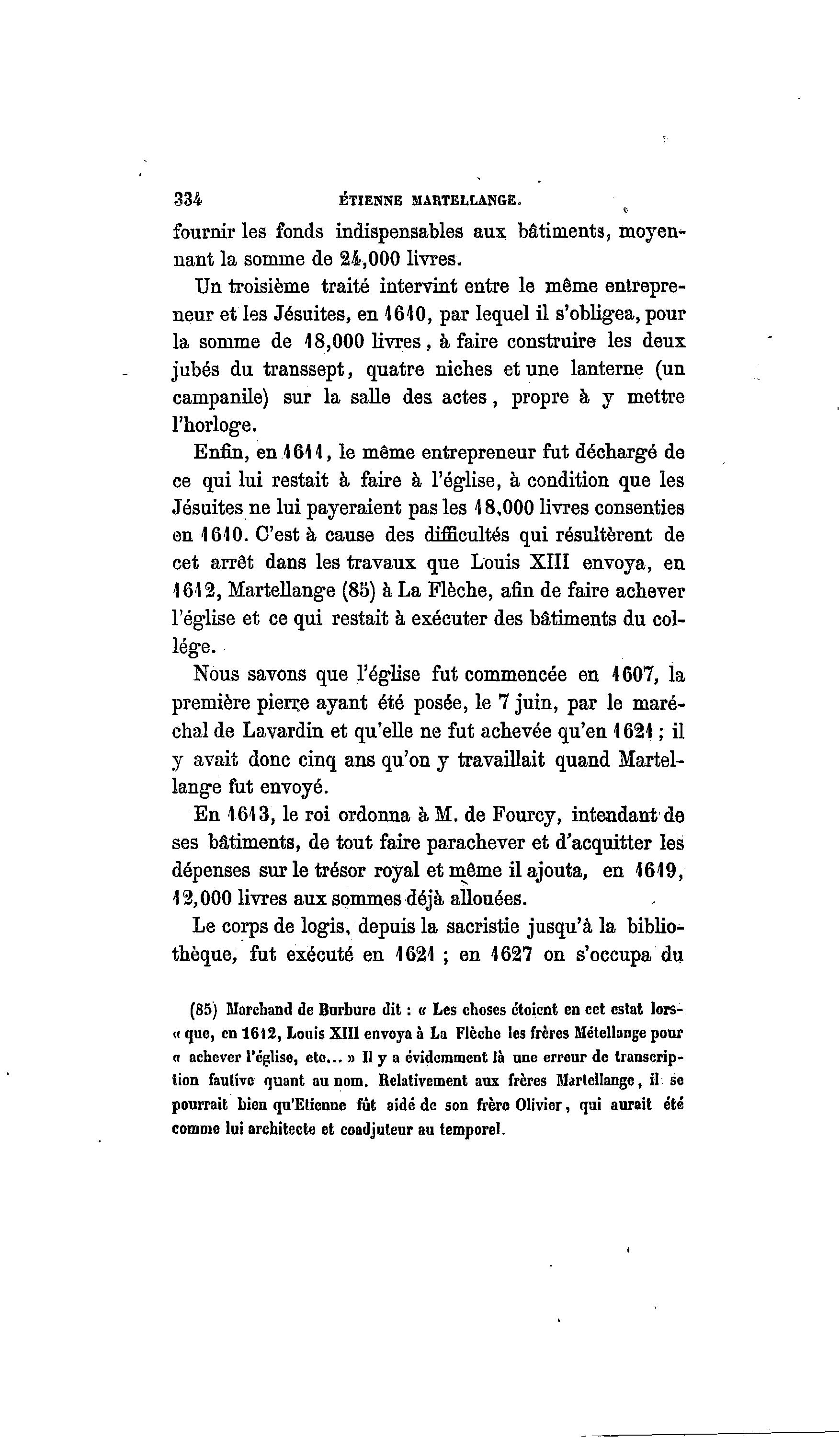 334 ETIENNE MAMELLANGE. fournir les fonds indispensables aux bâtiments, moyen- nant la somme de 24,000 livres. Un troisième traité intervint entre le même entrepre- neur et les Jésuites, en 1610, par lequel il s'obligea, pour la somme de 18,000 livres, à faire construire les deux jubés du transsept, quatre niches et une lanterne (un campanile) sur la salle des actes, propre à y mettre l'horloge. Enfin, en 1611, le même entrepreneur fut déchargé de ce qui lui restait à faire à l'église, à condition que les Jésuites ne lui payeraient pas les 18,000 livres consenties en 1610. C'est à cause des difficultés qui résultèrent de cet arrêt dans les travaux que Louis XIII envoya, en 1612, Martellange (85) à La Flèche, afin de faire achever l'église et ce qui restait à exécuter des bâtiments du col- lège. Nous savons que l'église fut commencée en 1607, la première pierçe ayant été posée, le 7 juin, par le maré- chal de Lavardin et qu'elle ne fut achevée qu'en 1621 ; il y avait donc cinq ans qu'on y travaillait quand Martel- lange fut envoyé. En 1613, le roi ordonna à M. de Fourcy, intendant de ses bâtiments, de tout faire parachever et d'acquitter lés dépenses sur le trésor royal et même il ajouta, en 1619, 12,000 livres aux sommes déjà allouées. Le corps de logis, depuis la sacristie jusqu'à la biblio- thèque, fut exécuté en 1621 ; en 1627 on s'occupa du (85) Marchand de Burbure dit : « Les choses ctoicnt en cet estât lors- « que, en 1612, Lonis XIII envoya à La Flèche les frères Métellange pour « achever l'église, e t c . . » Il y a évidemment là nne errenr de transcrip- tion fautive quant au nom. Relativement aux frères Marlellange, il se pourrait bien qu'Etienne fût aidé de son frère Olivier, qui aurait été comme lui architecte et coadjuteur au temporel.