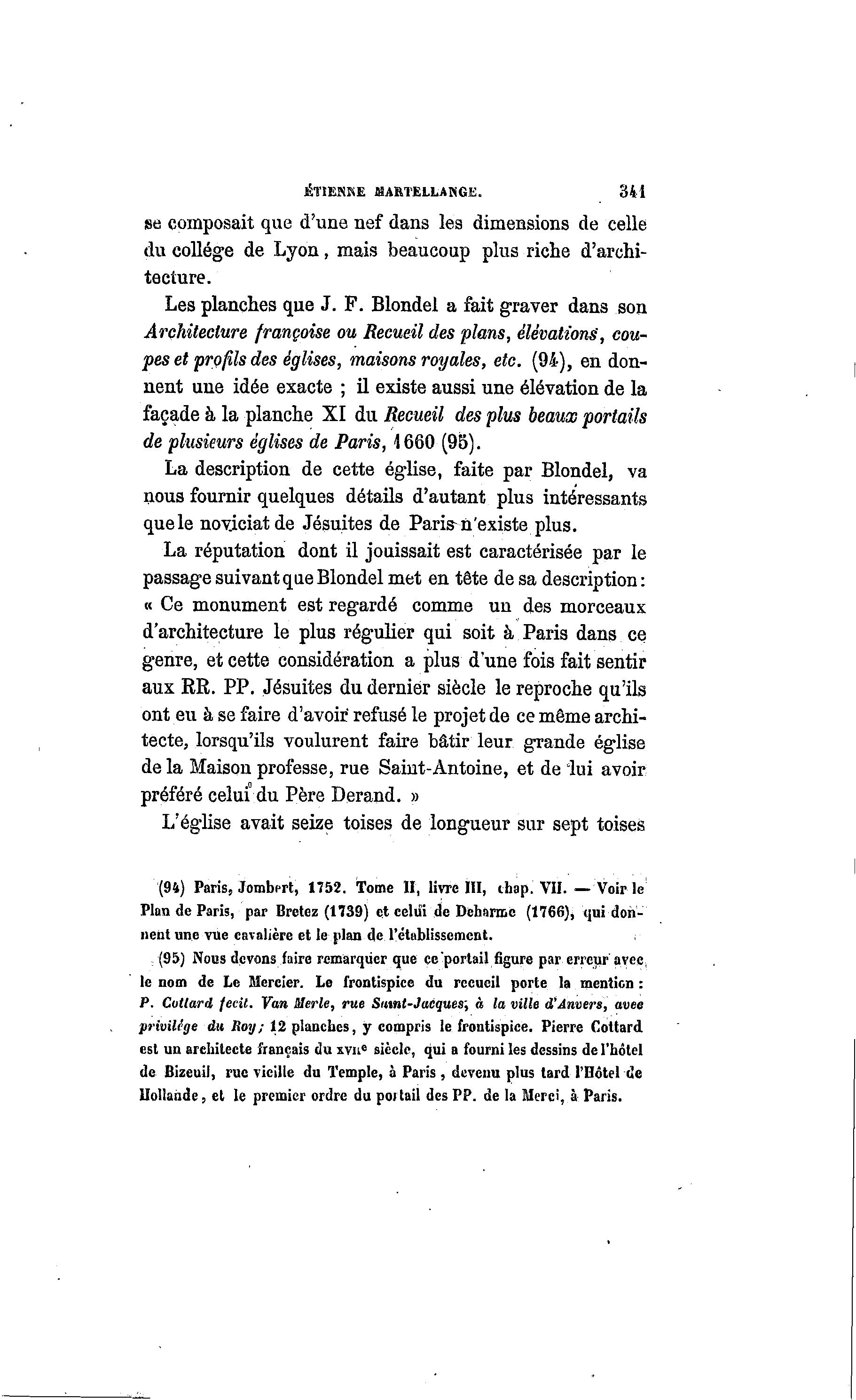 ETIENNE MARTELLANGE. 341 se composait que d'une nef dans les dimensions de celle du collège de Lyon, mais beaucoup plus riche d'archi- tecture. Les planches que J. F. Blondel a fait graver dans son Architecture française ou Recueil des plans, élévations, cou- pes et prç fils des églises, maisons royales, etc. (94), en don- nent une idée exacte ; il existe aussi une élévation de la façade à la planche XI du Recueil des plus beaux portails de plusieurs églises de Paris, 1660 (95). La description de cette église, faite par Blondel, va nous fournir quelques détails d'autant plus intéressants que le noviciat de Jésuites de Paris-n'existe plus. La réputation dont il jouissait est caractérisée par le passage suivant que Blondel met en tête de sa description: « Ce monument est regardé comme un des morceaux d'architecture le plus régulier qui soit à Paris dans ce genre, et cette considération a plus d'une fois fait sentir aux RR. PP. Jésuites du dernier siècle le reproche qu'ils ont eu à se faire d'avoir' refusé le projet de ce même archi- tecte, lorsqu'ils voulurent faire bâtir leur grande église delà Maison professe, rue Saint-Antoine, et de 'lui avoir préféré celui du Père Derand. » L'église avait seize toises de longueur sur sept toises (94) Paris, Jombcrt, 1752. tome H, livre III, chap. VII. — Voir le Plan de Paris, par Brctez (1739) et celui de Deharme (1766), qui don- nent une rue cavalière et le plan de l'établissement. (95) Nous devons faire remarquer que ce portail figure par erreur avec, le nom de Le Mercier. Le frontispice du recueil porte la mention : P. Cutlard fecil. Van Merle, rue Samt-Jacques; à la ville d'Anvers, avee privilège du Roy; 12 planches, y compris le frontispice. Pierre Cottard est un architecte français du xvne siècle, qui a fourni les dessins de l'hôtel de Bizeuil, rue vieille du Temple, à Paris, devenu plus tard l'Hôtel de Hollande, et le premier ordre du portail des PP. de la Merci, à Paris.