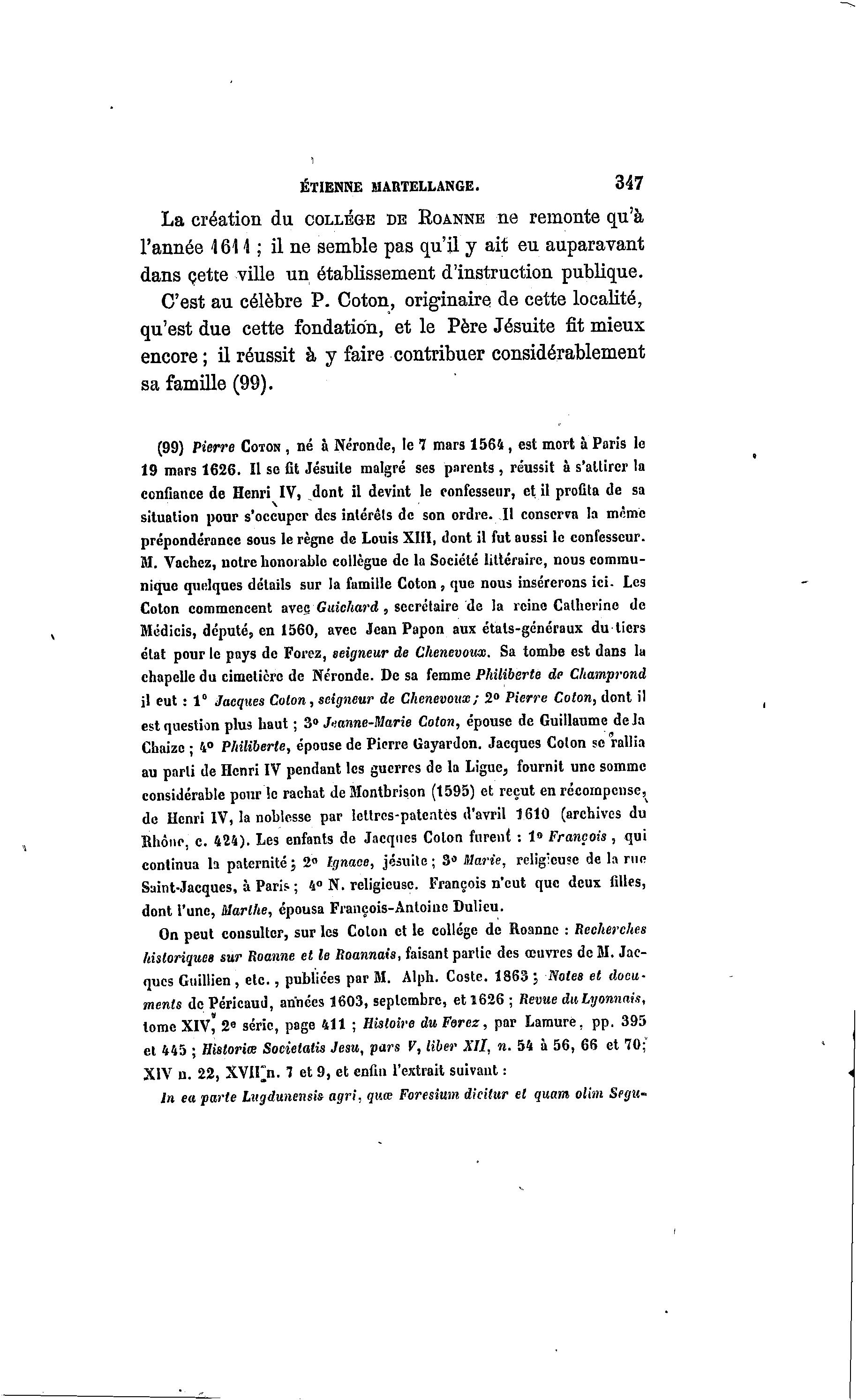 ETIENNE MARTELLANGE. 347 La création du COLLÈGE DE ROANNE ne remonte qu'à l'année 461 \ ; il ne semble pas qu'il y ait eu auparavant dans cette ville un établissement d'instruction publique. C'est au célèbre P. Coton, originaire de cette localité, qu'est due cette fondation, et le Père Jésuite fit mieux encore ; il réussit à y faire contribuer considérablement sa famille (99). (99) Pierre COTON , né à Néronde, le 7 mars 1564 , est mort à Paris le 19 mars 1626. Il se fit Jésuite malgré ses parents , réussit à s'attirer la confiance de Henri IV, dont il devint le confesseur, et. il profita de sa situation pour s'occuper des intérêts de son ordre. Il conserva la même prépondérance sous le règne de Louis XIII, dont il fut aussi le confesseur. M. Vachcz, notre honorable collègue de la Société littéraire, nous commu- nique quelques détails sur la famille Coton , que nous insérerons ici- Les Coton commencent avec Guichard , secrétaire de la reine Catherine de Médicis, député, en 1560, avec Jean Papon aux états-généraux du tiers état pour le pays de Forez, seigneur de Chenevoux, Sa tombe est dans lu chapelle du cimetière de Néronde. De sa femme Philiberte de Champrond il eut : 1° Jacques Colon, seigneur de Chenevoux; 2° Pierre Coton, dont il est question plus haut ; 3° Jeanne-Marie Coton, épouse de Guillaume delà Chaizc ; 4° Philiberte, épouse de Pierre Gayardon. Jacques Colon se rallia au parti de Henri IV pendant les guerres de la Ligue, fournit une somme considérable pour le rachat de Montbrison (1595) et reçut en récompense, de Henri IV, la noblesse par lettres-patentes d'avril 1610 (archives du Bhône, c. 424). Les enfants de Jacques Colon furent : 1» François , qui continua la paternité; 2° Ignace, jésuite; 8° Marie, religieuse de la rue Suint-Jacques, à Paris ; 4° N. religieuse. François n'eut que deux filles, dont l'une, Marthe, épousa François-Antoine Dulicu. On peut consulter, sur les Colon et le collège de Roanne : Recherches historique» sur Roanne et le Roannais, faisant partie des œuvres de M. Jac- ques Guillien , e t c . , publiées par M. Alph. Coste. 1863 ; Notes et docu- ments de Péricaud, années 1603, septembre, et 1626 ; Revue du Lyonnais, tome XIV, 2° série, page 411 ; Histoire du Forez, par Lamurë, pp. 395 et 445 ; Historiœ Socielatis Jesu, pars V, liber XII, n. 54 à 56, 66 et 70;" XIV n. 22, XVIFn. 7 et 9, et enfin l'extrait suivant : In ea parle Lugdwiensis agri, quœ Foresium dicilur et quant olim Segit-