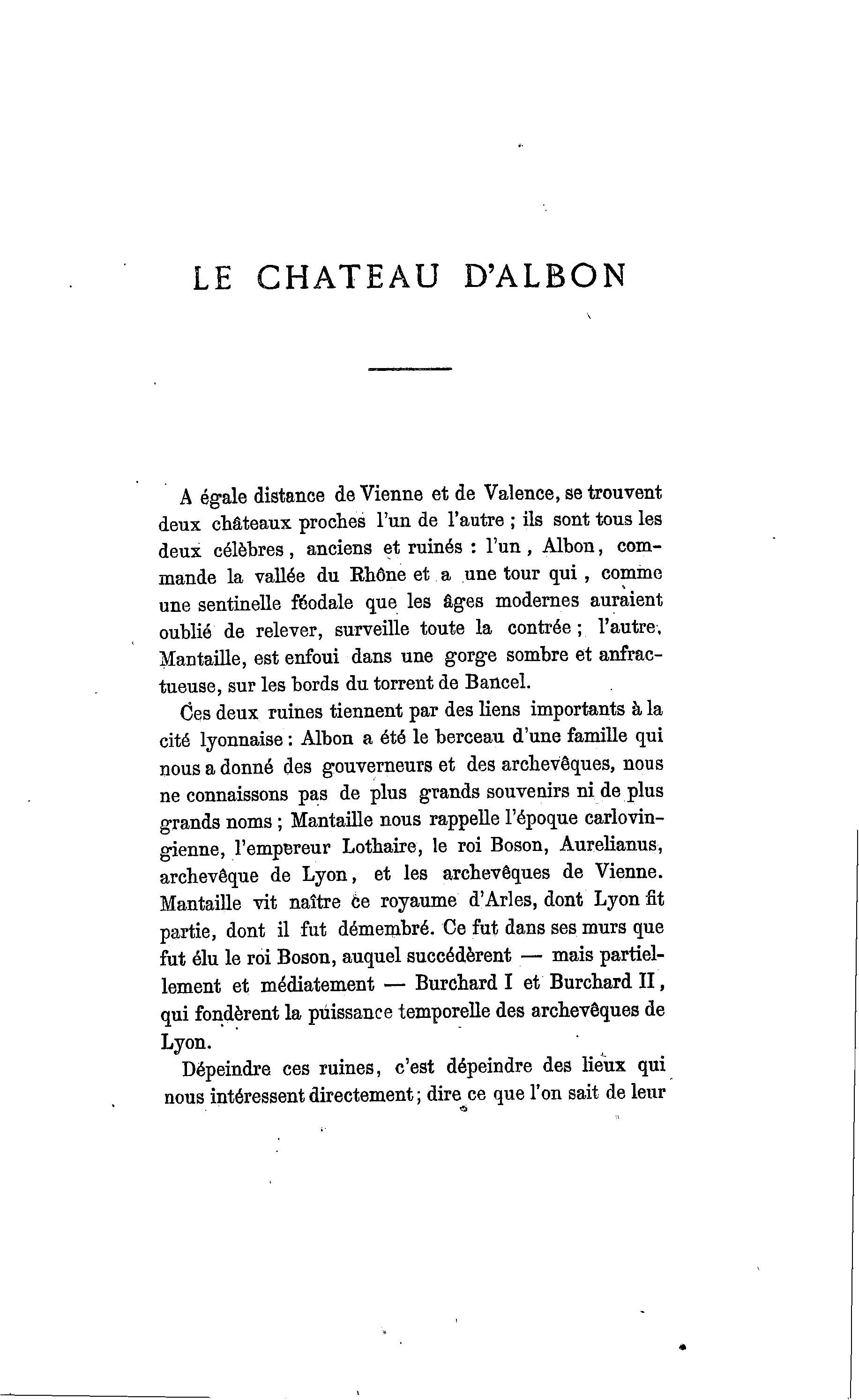 LE CHATEAU D'ALBON A égale distance de Vienne et de Valence, se trouvent deux châteaux proches l'un de l'autre ; ils sont tous les deux célèbres, anciens et ruinés : l'un , Albon, com- mande la vallée du Rhône et a une tour q u i , comme une sentinelle féodale que les âges modernes auraient oublié de relever, surveille toute la contrée; l'autre, Mantaille, est enfoui dans une gorge sombre et anfrac- tueuse, sur les bords du torrent de Bancel. Ces deux ruines tiennent par des liens importants à la cité lyonnaise : Albon a été le berceau d'une famille qui nous a donné des gouverneurs et des archevêques, nous ne connaissons pas de plus grands souvenirs ni de plus grands noms ; MantaiUe nous rappelle l'époque carlovin- gienne, l'empereur Lothaire, le roi Boson, Aurelianus, archevêque de Lyon, et les archevêques de Vienne. MantaiUe vit naître ce royaume d'Arles, dont Lyon fit partie, dont il fut démembré. Ce fut dans ses murs que fut élu le roi Boson, auquel succédèrent — mais partiel- lement et médiatement — Burchard I et Burchard I I , qui fondèrent la puissance temporelle des archevêques de Lyon. Dépeindre ces ruines, c'est dépeindre des lieux qui nous intéressent directement ; dire ce que l'on sait de leur