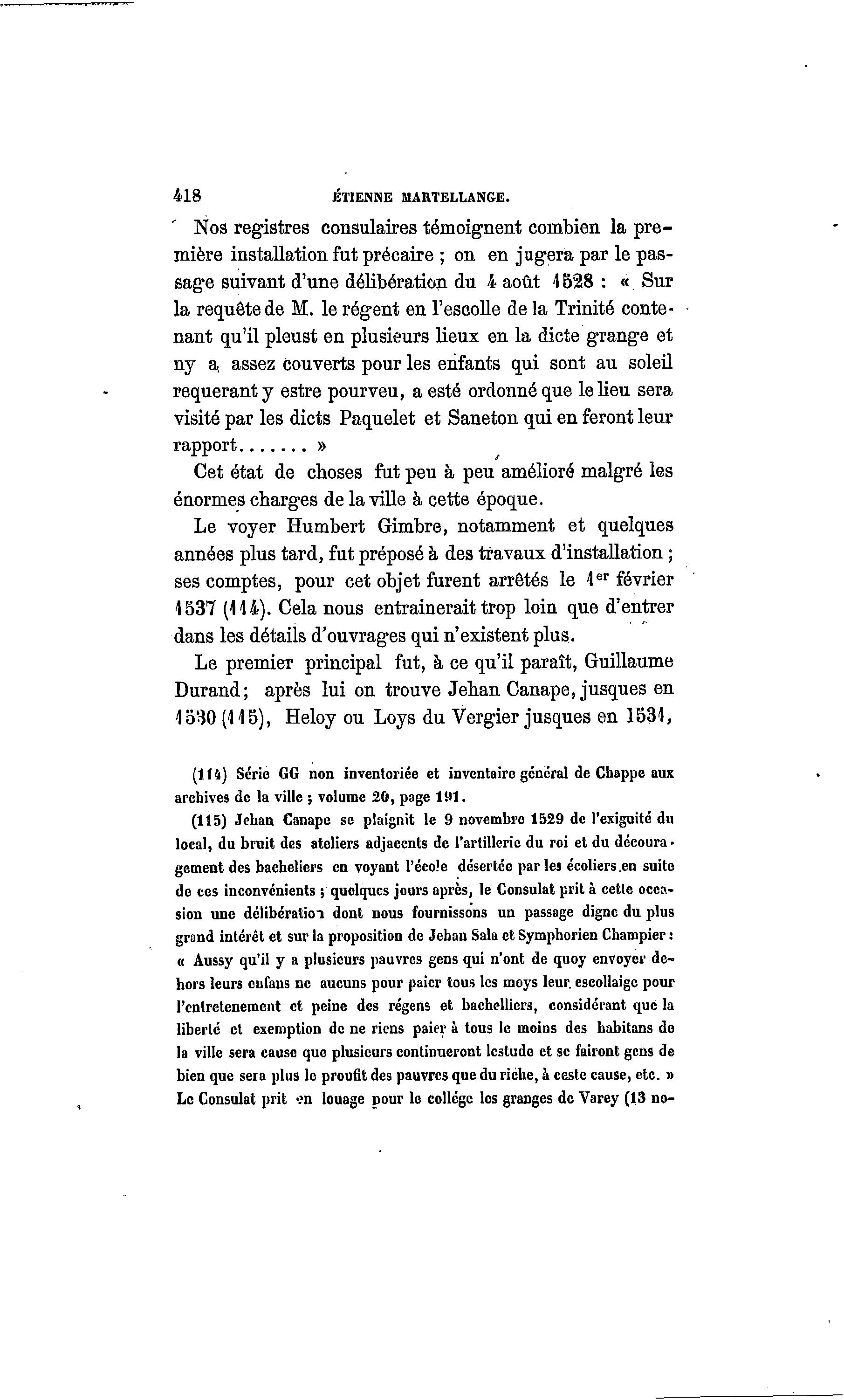 418 ETIENNE MARTELLANGE. Nos registres consulaires témoignent combien la pre- mière installation fut précaire ; on en jugera par le pas- sage suivant d'une délibération du 4 août 1528 : « Sur la requête de M. le régent en l'esoolle de la Trinité conte- nant qu'il pleust en plusieurs lieux en la dicte grange et ny a. assez couverts pour les enfants qui sont au soleil requérant y estre pourveu, a esté ordonné que le lieu sera visité par les dicts Paquelet et Saneton qui en feront leur rapport » Cet état de choses fut peu à peu amélioré malgré les énormes charges de la ville à cette époque. Le voyer Humbert Gimbre, notamment et quelques années plus tard, fut préposé à des travaux d'installation ; ses comptes, pour cet objet furent arrêtés le 1 er février 1537 (114). Cela nous entrainerait trop loin que d'entrer dans les détails d'ouvrages qui n'existent plus. Le premier principal fut, à ce qu'il paraît, Guillaume Durand; après lui on trouve Jehan Canapé, jusques en 1530 (115), Heloy ou Loys du Vergier jusques en 1531, (114) Série GG non inventoriée et inventaire général de Chappe aux archives de la ville ; volume 20, page 191. (115) Jehan Canapé se plaignit le 9 novembre 1529 de l'exiguïté du local, du bruit des ateliers adjacents de l'artillerie du roi et du découra- gement des bacheliers en voyant l'école désertée parles écoliers .en suite de ces inconvénients ; quelques jours après, le Consulat prit à cette occa- sion une délibération dont nous fournissons un passage digne du plus grand intérêt et sur la proposition de Jehan Sala et Symphorien Champier : « Aussy qu'il y a plusieurs pauvres gens qui n'ont de quoy envoyer de- hors leurs onfans ne aucuns pour paicr tous les moys leur, escollaige pour l'enlretenemcnt et peine des régens et bachellicrs, considérant que la liberté et exemption de ne riens paier à tous le moins des habitans de la ville sera cause que plusieurs continueront lestude et se fairont gens de bien que sera plus le proufit des pauvres que du riche, à ceste cause, etc. » Le Consulat prit en louage pour le collège les granges de Varey (13 no-