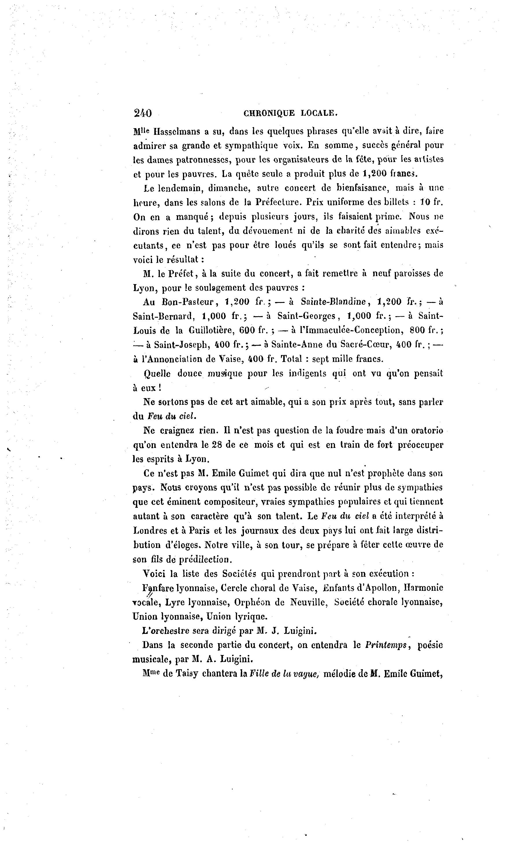 240 CHRONIQUE LOCALE. M"e Hasselmans a su, dans les quelques phrases qu'elle avait à dire, faire admirer sa grande et sympathique voix. En somme, succès général pour les dames patronnossos, pour les organisateurs de la fête, pour les artistes et pour les pauvres. La quête seule a produit plus de 1,200 francs. Le lendemain, dimanche, autre concert de bienfaisance, mais à une heure, dans les salons de la Préfecture. Prix uniforme des billets : 10 fr. On en a manqué ; depuis plusieurs jours, ils faisaient prime. Nous ne dirons rien du talent, du dévouement ni de la charité des aimables exé- cutants, ce n'est pas pour être loués qu'ils se sont fait entendre; mais voici le résultat : M. le Préfet, à la suite du concert, a fait remettre à neuf paroisses de Lyon, pour le soulagement des pauvres : Au Bon-Pasteur, 1,200 fr. ; — à Sainte-Blandine, 1,200 fr. ; — à Saint-Bernard, 1,000 fr.; — à Saint-Georges, 1,000 fr. ; — à Saint- Louis de la Guillotière, 600 fr. ; — à l'Immaculée-Conccption, 800 fr. ; '•— à Saint-Joseph, 400 fr. ; — à Sainte-Anne du Sacré-Coeur, 40O fr. ; — à l'Annonciation de Vaise, 400 fr. Total : sept mille francs. Quelle douce mussque pour les indigents qui ont vu qu'on pensait à eux ! Ne sortons pas de cet art aimable, qui a son prix après tout, sans parler du Feu du ciel. Ne craignez rien. Il n'est pas question de la foudre mais d'un oratorio qu'on entendra le 28 de ce mois et qui est en train de fort préoccuper les esprits à Lyon. Ce n'est pas H. Emile Guimet qui dira que nul n'est prophète dans son pays. Nous croyons qu'il n'est pas possible de réunir plus de sympathies que cet éminent compositeur, vraies sympathies populaires et qui tiennent autant à son caractère qu'à son talent. Le Feu du ciel a été interprété à Londres et à Paris et les journaux des deux pays lui ont fait large distri- bution d'éloges. Noire ville, à son tour, se prépare à fêter cette œuvre de son fils de prédilection. Voici la liste des Sociétés qui prendront part à son exécution : Fanfare lyonnaise, Cercle choral de Vaise, Enfants d'Apollon, Harmonie vocale, Lyre lyonnaise, Orphéon de Neuville, Société chorale lyonnaise, Union lyonnaise, Union lyrique. L'orchestre sera dirigé par M. J. Luigini. Dans la seconde partie du concert, on entendra le Printemps, poésie musicale, par M. A. Luigini. M me de Taisy chantera la Fille de la vague, mélodie de M. Emile Guimet,