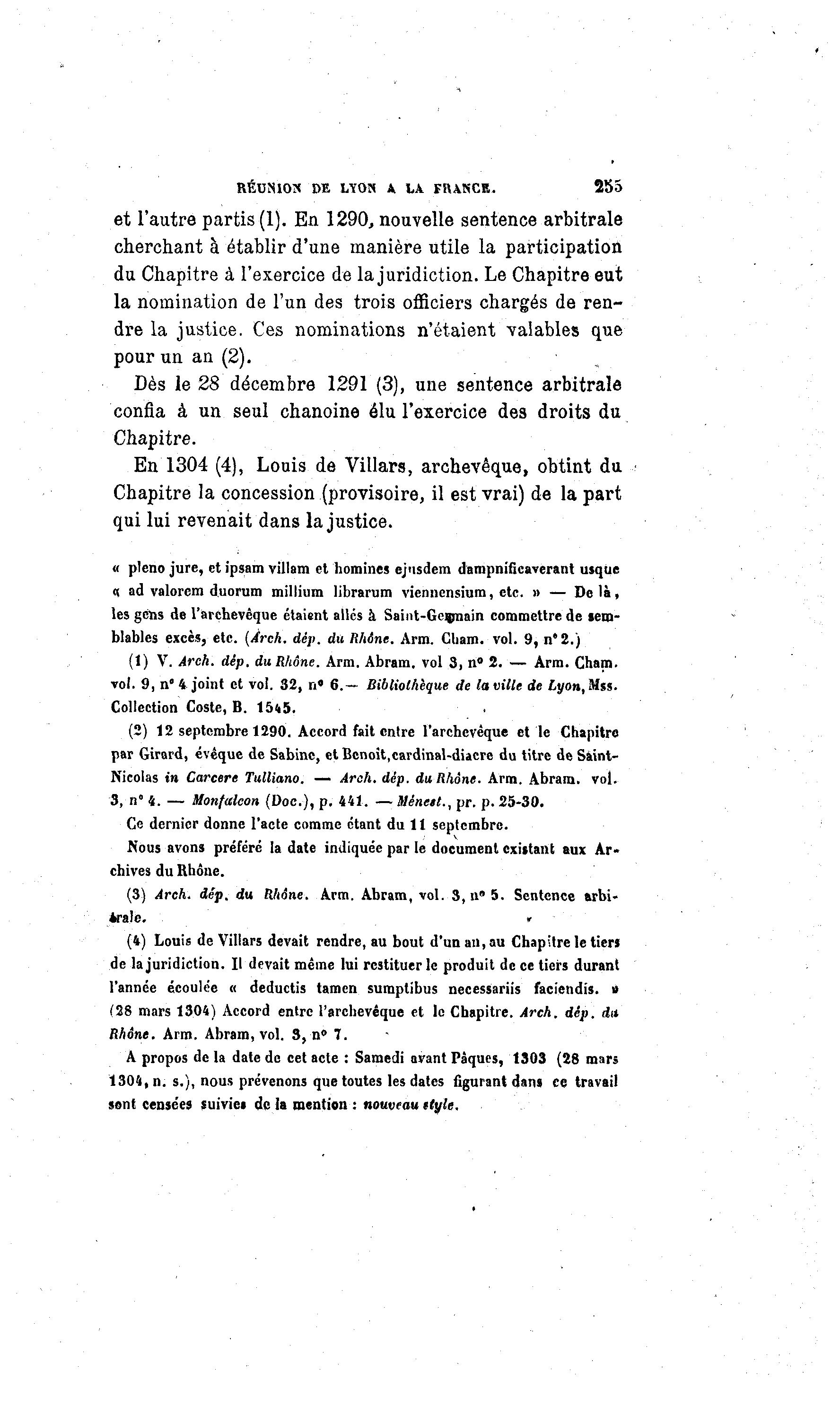 RÉUNION »E LYON A LA FRANCE. 255 et l'autre partis (1). En 1290, nouvelle sentence arbitrale cherchant à établir d'une manière utile la participation du Chapitre à l'exercice de la juridiction. Le Chapitre eut la nomination de l'un des trois officiers chargés de ren- dre la justice. Ces nominations n'étaient valables que pour un an (2). Dès le 28 décembre 1291 (3), une sentence arbitrale confia à un seul chanoine élu l'exercice des droits du Chapitre. En 1304 (4), Louis de Villars, archevêque, obtint du Chapitre la concession (provisoire, il est vrai) de la part qui lui revenait dans la justice. « pleno jure, et ipsam villam et homines ejusdem dampnificaverant usque < ad valorem duorum millium librarum viennensium, etc. » — De l à , < les gens de l'archevêque étaient allés à Saint-Germain commettre de sem- blables excès, etc. (Ârch. dêp. du Rhône. Arm. Cuam. vol. 9, n*2.) (1) V. Arch. dêp. du. Rhône. Arm. Abram. vol 3, n° 2. — Arm. Cham. vol. 9, n" 4 joint et vol. 32, n» 6.— Bibliothèque de la ville de Lyon, Mss. Collection Coste, B. 1545. (2) 12 septembre 1290. Accord fait entre l'archevêque et le Chapitre par Girard, évêque de Sabine, et Benoit,cardinal-diacre du titre de Saint- Nicolas in Carcere Tulliano, — Arch. dêp. du Rhône. Arm. Abram. vol. 3, n" 4. — Monfalcon (Doc), p. 441. — iléneit., pr. p. 25-30. Ce dernier donne l'acte comme étant du 11 septembre. Nous avons préféré la date indiquée par le document existant aux Ar- chives du Rhône. (3) Arch. dêp. du Rhône. Arm. Abram, vol. 3,11" 5. Sentence arbi- trale. » (4) Louis de Villars devait rendre, au bout d'un an, au Chapitre le tien de la juridiction. Il devait même lui restituer le produit de ce tiers durant l'année écoulée « deductis tamcn sumptibus necessariis faciendis. 1 1 (28 mars 1304) Accord entre l'archevêque et le Chapitre. Arch. dêp. dit Rhône. Arm. Abram, vol. 3 , n° 7. A propos de la date de cet acte : Samedi avant Pâques, 1303 (28 mars 1304, n. s.), nous prévenons que toutes les dates figurant dans ce travail sont censées suivies de la mention : nouveau ttyle.