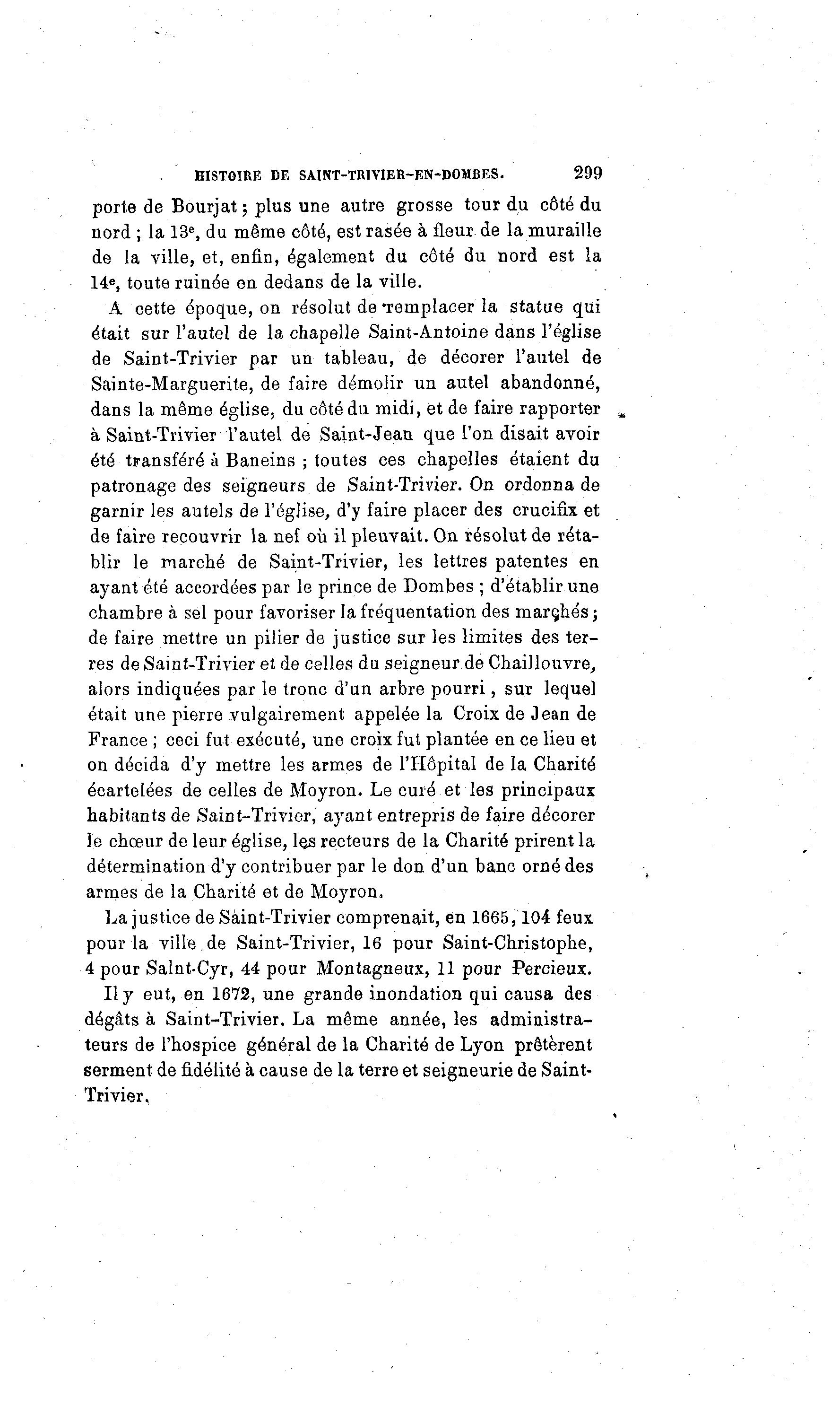 HISTOIRE DE SAINT-TRIVIER-EN-DOMBES. 299 porte de Bourjat ; plus une autre grosse tour du côté du nord ; la 13e, du même côté, est rasée à fleur de la muraille de la ville, et, enfin, également du côté du nord est la 14e, toute ruinée en dedans de la ville. A cette époque, on résolut de -remplacer la statue qui était sur l'autel de la chapelle Saint-Antoine dans l'église de Saint-Trivier par un tableau, de décorer l'autel de Sainte-Marguerite, de faire démolir un autel abandonné, dans la même église, du côté du midi, et de faire rapporter „ à Saint-Trivier l'autel de Saint-Jean que l'on disait avoir été transféré à Baneins ; toutes ces chapelles étaient du patronage des seigneurs de Saint-Trivier. On ordonna de garnir les autels de l'église, d'y faire placer des crucifix et de faire recouvrir la nef où il pleuvait. On résolut de réta- blir le marché de Saint-Trivier, les lettres patentes en ayant été accordées par le prince de Dombes ; d'établir une chambre à sel pour favoriser la fréquentation des marchés ; de faire mettre un pilier de justice sur les limites des ter- res de Saint-Trivier et de celles du seigneur de Chaillouvre, alors indiquées par le tronc d'un arbre pourri, sur lequel était une pierre vulgairement appelée la Croix de Jean de France ; ceci fut exécuté, une croix fut plantée en ce lieu et on décida d'y mettre les armes de l'Hôpital de la Charité écartelées de celles de Moyron. Le curé et les principaux habitants de Saint-Trivier, ayant entrepris de faire décorer le chœur de leur église, les recteurs de la Charité prirent la détermination d'y contribuer par le don d'un banc orné des armes de la Charité et de Moyron. La justice de Sà int-Trivier comprenait, en 1665,104 feux pour la ville de Saint-Trivier, 16 pour Saint-Christophe, 4 pour Salnt-Cyr, 44 pour Montagneux, 11 pour Percieux. Il y eut, en 1672, une grande inondation qui causa des dégâts à Saint-Trivier. La même année, les administra- teurs de l'hospice général de la Charité de Lyon prêtèrent serment de fidélité à cause de la terre et seigneurie de Saint- Trivier,