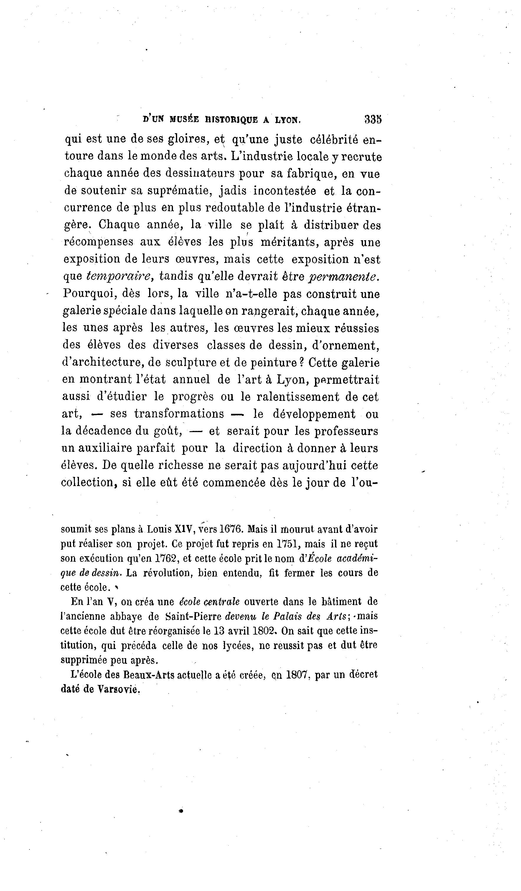 D'UN MUSÉE HISTORIQUE À'MON. 33b qui est une de ses gloires, et qu'une juste célébrité en- toure dans le monde des arts. L'industrie locale y recrute chaque année des dessinateurs pour sa fabrique, en vue de soutenir sa suprématie, jadis incontestée et la con- currence de plus en plus redoutable de l'industrie étran- gère. Chaque année, la Tille se plait à distribuer des récompenses aux élèves les plus méritants, après une exposition de leurs œuvres, mais cette exposition n'est que temporaire, tandis qu'elle devrait être permanente. Pourquoi, dès lors, la ville n'a-t-elle pas construit une galerie spéciale dans laquelle on rangerait, chaque année, les unes après les autres, les œuvres les mieux réussies des élèves des diverses classes de dessin, d'ornement, d'architecture, de sculpture et de peinture ? Cette galerie en montrant l'état annuel de l'art à Lyon, permettrait aussi d'étudier le progrès ou le ralentissement de cet art, — ses transformations — le développement ou la décadence du goût, — et serait pour les professeurs un auxiliaire parfait pour la direction à donner à leurs élèves. De quelle richesse ne serait pas aujourd'hui cette collection, si elle eût été commencée dès le jour de l'ou- soumit ses plans à Louis XIV, vers 1676. Mais il mourut avant d'avoir put réaliser son projet. Ce projet fut repris en 1751, mais il ne reçut son exécution qu'en 1762, et cette école prit le nom d'École académi- que de dessin. La révolution, bien entendu, fit fermer les cours de cette école. * En l'an V, on créa une école centrale ouverte dans le bâtiment de l'ancienne abbaye de Saint-Pierre devenu le Palais des Arts; -mais cette école dut être réorganisée le 13 avril 1802. On sait que cette ins- titution, qui précéda celle de nos lycées, ne réussit pas et dut être supprimée peu après. L'école des Beaux-Arts actuelle a été créée, en 1807, par un décret daté de Varsovie,