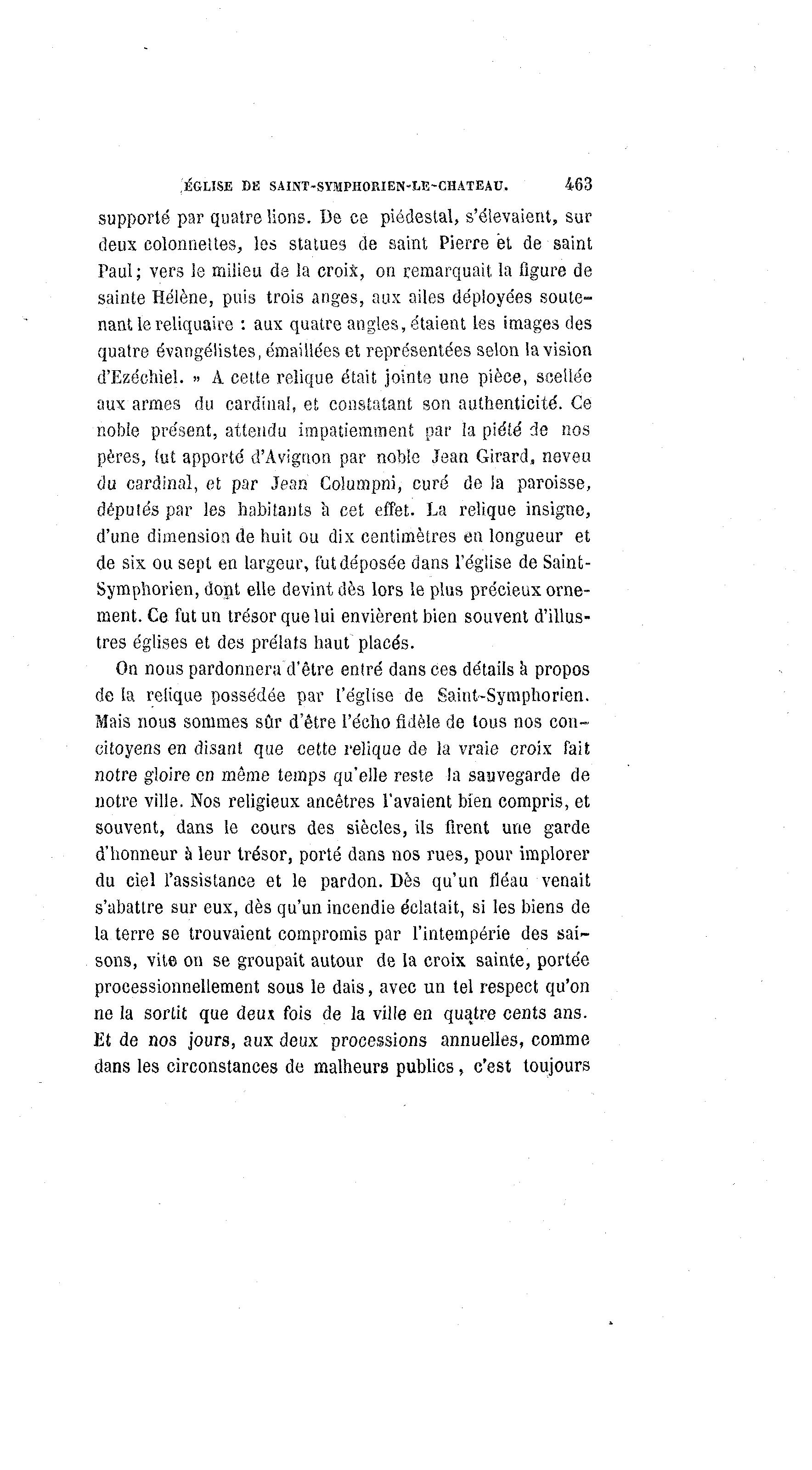 ,')ÉGLISE DE SAINT-SYMPHORIEN-LE-CHATEAU. 463 supporté par quatre lions. De ce piédestal, s'élevaient, sur deux colonnettes, les statues de saint Pierre et de saint Paul; vers le milieu de la croit, on remarquait la figure de sainte Hélène, puis trois anges, aux ailes déployées soute- nant le reliquaire : aux quatre angles, étaient les images des quatre évangélistes, émaillées et représentées selon la vision d'Ezéchiel. » A cette relique était jointe une pièce, scellée aux armes du cardinal, et constatant son authenticité'. Ce noble présent, attendu impatiemment par la piété de nos pères, (ut apporté d'Avignon par noble Jean Girard., neveu du cardinal, et par Jean Columpni, curé de ia paroisse, députés par les habitants à cet effet. La relique insigne, d'une dimension de huit ou dix centimètres en longueur et de six ou sept en largeur, fut déposée dans l'église de Sainfc- Symphorien, dont elle devint dès lors le plus précieux orne- ment. Ce fut un trésor que lui envièrent bien souvent d'illus- tres églises et des prélats haut placés. On nous pardonnera d'être entré dans ces détails a propos de la relique possédée par l'église de Saint-Symphorien. Mais nous sommes sûr d'être l'écho fidèle de tous nos con- citoyens en disant que cette relique de la vraie croix fait notre gloire en même temps qu'elle reste la sauvegarde de notre ville. Nos religieux ancêtres l'avaient bien compris, et souvent, dans le cours des siècles, ils firent une garde d'honneur à leur trésor, porté dans nos rues, pour implorer du ciel l'assistance et le pardon. Dès qu'un fléau venait s'abattre sur eux, dès qu'un incendie éclatait, si les biens de la terre se trouvaient compromis par l'intempérie des sai- sons, vite on se groupait autour de la croix sainte, portée processionnellement sous le dais, avec un tel respect qu'on ne la sortit que deux fois de la ville en quatre cents ans. Et de nos jours, aux deux processions annuelles, comme dans les circonstances de malheurs publics, c'est toujours
