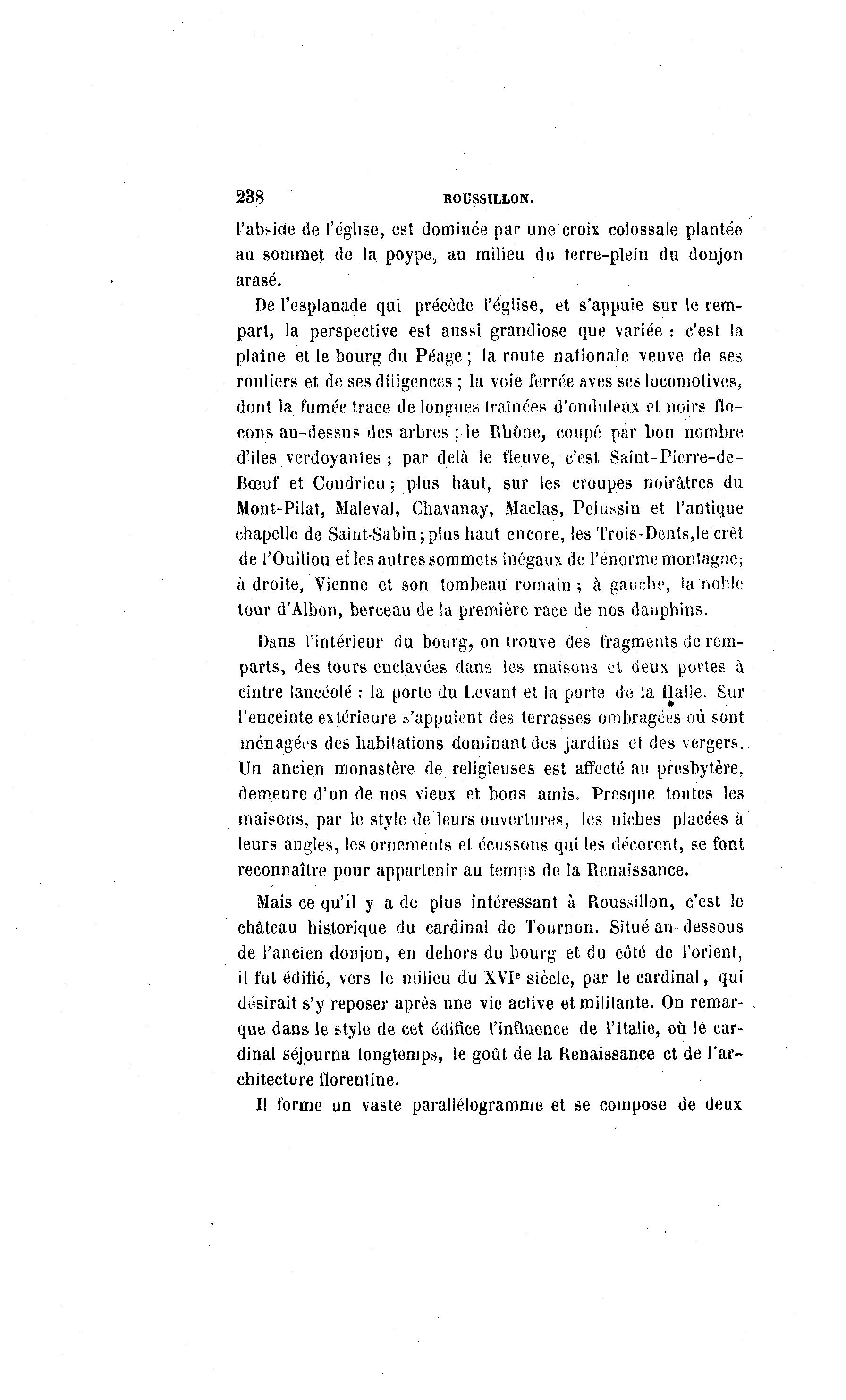 238 ROUSSILLON. l'abside de l'église, est dominée par une croix colossale plantée au sommet de la poype, au milieu du terre-plein du donjon arasé. De l'esplanade qui précède l'église, et s'appuie sur le rem- part, la perspective est aussi grandiose que variée : c'est la plaine et le bourg du Péage ; la route nationale veuve de ses rouliers et de ses diligences ; la voie ferrée aves ses locomotives, dont la fumée trace de longues traînées d'onduleux et noirs flo- cons au-dessus des arbres ; le Rhône, coupé par bon nombre d'îles verdoyantes ; par delà le fleuve, c'est Saint-Pierre-de- Bœuf et Condrieu ; plus haut, sur les croupes noirâtres du Mont-Pilat, Maleval, Chavanay, Maelas, Pelussin et l'antique chapelle de Saiut-Sabin;plus haut encore, les Trois-Dents,lecrèt de l'Ouillou et les autres sommets inégaux de l'énorme montagne; à droite, Vienne et son tombeau romain ; à gauche, la noble tour d'Àlbon, berceau de la première race de nos dauphins. Dans l'intérieur du bourg, on trouve des fragments de rem- parts, des tours enclavées dans les maisons et deux portes à cintre lancéolé : la porte du Levant et la porte de la Halle. Sur l'enceinte extérieure s'appuient des terrasses ombragées où sont ménagées des habitations dominant des jardins et des vergers.. Un ancien monastère de religieuses est affecté au presbytère, demeure d'un de nos vieux et bons amis. Presque toutes les maisons, par le style de leurs ouvertures, les niches placées à leurs angles, les ornements et écussons qui les décorent, se font reconnaître pour appartenir au temps de la Renaissance. Mais ce qu'il y a de plus intéressant à Roussillon, c'est le château historique du cardinal de Tournon. Situé au dessous de l'ancien donjon, en dehors du bourg et du côté de l'orient, il fut édifié, vers le milieu du XVIe siècle, par le cardinal, qui désirait s'y reposer après une vie active et militante. On remar- que dans le style de cet édifice l'influence de l'Italie, où le car- dinal séjourna longtemps, le goût de la Renaissance et de l'ar- chitecture florentine. Il forme un vaste parallélogramme et se compose de deux