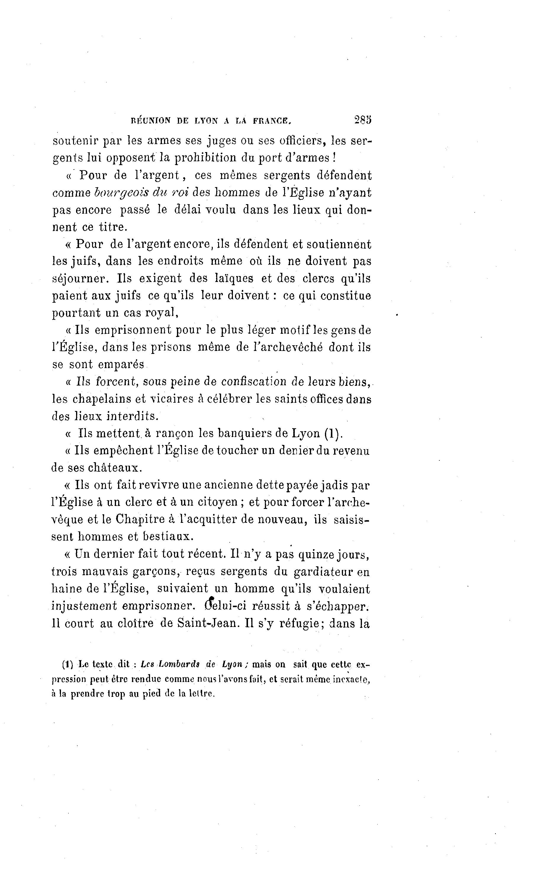 RÉUNION DE LYON A LA FRANCE, 285 soutenir par les armes ses juges ou ses officiers, les ser- gents lui opposent la prohibition du port d'armes ! « Pour de l'argent, ces mêmes sergents défendent comme bourgeois du roi des hommes de l'Eglise n'ayant pas encore passé le délai voulu dans les lieux qui don- nent ce titre. « Pour de l'argent encore, ils défendent et soutiennent les juifs, dans les endroits même où ils ne doivent pas séjourner. Ils exigent des laïques et des clercs qu'ils paient aux juifs ce qu'ils leur doivent : ce qui constitue pourtant un cas royal, « Ils emprisonnent pour le plus léger moiif les gens de l'Église, dans les prisons même de l'archevêché dont ils se sont emparés « Us forcent, sous peine de confiscation de leurs biens, les chapelains et vicaires à célébrer les saints offices dans des lieux interdits. « Ils mettent, à rançon les banquiers de Lyon (1). « Ils empêchent l'Église de toucher un denier du revenu de ses châteaux. « Ils ont fait revivre une ancienne dette payée jadis par l'Église à un clerc et à un citoyen ; et pour forcer l'arche- vêque et le Chapitre à l'acquitter de nouveau, ils saisis- sent hommes et bestiaux. « Un dernier fait tout récent. Il n'y a pas quinze jours, trois mauvais garçons, reçus sergents du gardiateur en haine de l'Église, suivaient un homme qu'ils voulaient injustement emprisonner. Uelui-ci réussit à s'échapper. 11 court au cloître de Saint-Jean. Il s'y réfugie; dans la (1) Le texte dit : Les lombards de Lyon; mais on sait que cette ex- pression peut être rendue comme nous l'avons fait, et serait même inexact, à la prendre trop au pied de la lettre.