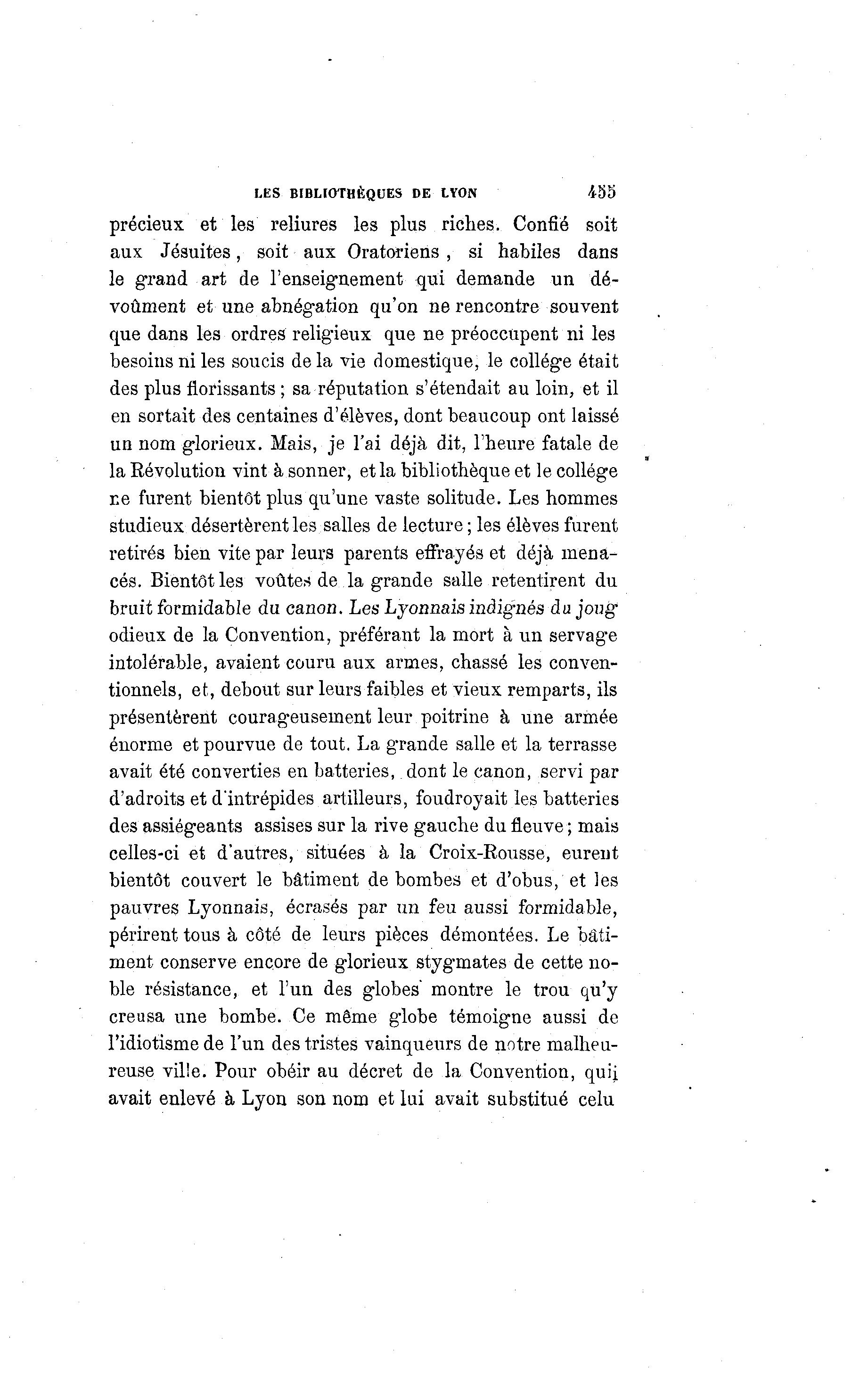 LES BIBLIOTHÈQUES DE LYON i35 précieux et les reliures les plus riches. Confié soit aux Jésuites, soit aux Oratoriens , si habiles dans le grand art de l'enseignement qui demande un dé- voûment et une abnégation qu'on ne rencontre souvent que dans les ordres religieux que ne préoccupent ni les besoins ni les soucis de la vie domestique, le collège était des plus florissants ; sa réputation s'étendait au loin, et il en sortait des centaines d'élèves, dont beaucoup ont laissé un nom glorieux. Mais, je l'ai déjà dit, l'heure fatale de la Révolution vint à sonner, et la bibliothèque et le collège ne furent bientôt plus qu'une vaste solitude. Les hommes studieux désertèrent les salles de lecture ; les élèves furent retirés bien vite par leurs parents effrayés et déjà mena- cés. Bientôt les voûtes de la grande salle retentirent du bruit formidable du canon. Les Lyonnais indignés du joug odieux de la Convention, préférant la mort à un servage intolérable, avaient couru aux armes, chassé les conven- tionnels, et, debout sur leurs faibles et vieux remparts, ils présentèrent courageusement leur poitrine à une armée énorme et pourvue de tout. La grande salle et la terrasse avait été converties en batteries, dont le canon, servi par d'adroits et d'intrépides artilleurs, foudroyait les batteries des assiégeants assises sur la rive gauche du fleuve ; mais celles-ci et d'autres, situées à la Croix-Rousse, eurent bientôt couvert le bâtiment de bombes et d'obus, et les pauvres Lyonnais, écrasés par un feu aussi formidable, périrent tous à côté de leurs pièces démontées. Le bâti- ment conserve encore de glorieux stygmates de cette no- ble résistance, et l'un des globes' montre le trou qu'y creusa une bombe. Ce même globe témoigne aussi de l'idiotisme de l'un des tristes vainqueurs de notre malheu- reuse ville. Pour obéir au décret de la Convention, quij avait enlevé à Lyon son nom et lui avait substitué celu