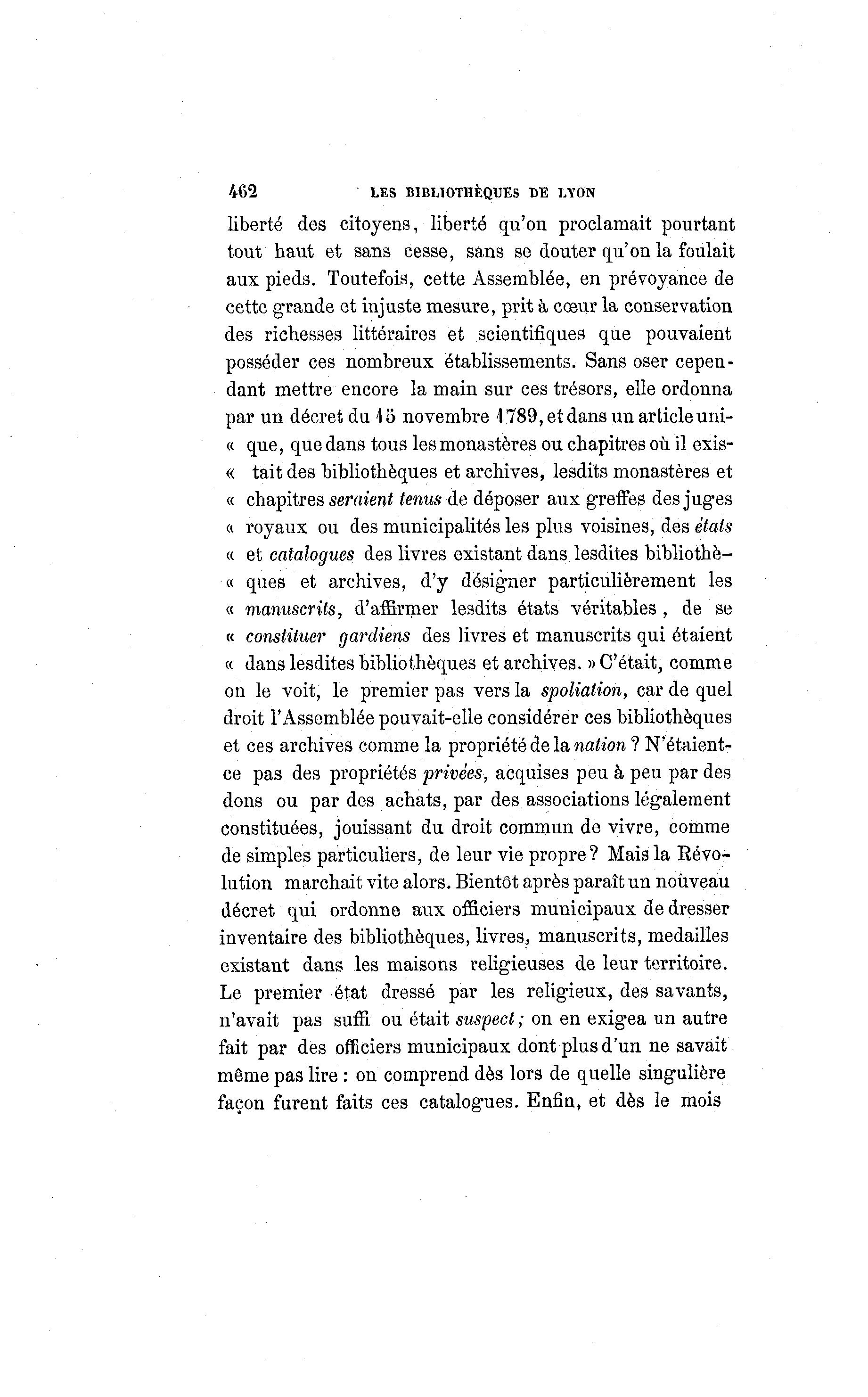 462 LES BIBLIOTHÈQUES DE LYON liberté des citoyens, liberté qu'on proclamait pourtant tout haut et sans cesse, sans se douter qu'on la foulait aux pieds. Toutefois, cette Assemblée, en prévoyance de cette grande et injuste mesure, prit -à cœur la conservation des richesses littéraires et scientifiques que pouvaient posséder ces nombreux établissements. Sans oser cepen- dant mettre encore la main sur ces trésors, elle ordonna par un décret du \ 5 novembre 1789, et dans un article uni- « que, que dans tous les monastères ou chapitres où il exis- « tait des bibliothèques et archives, lesdits monastères et « chapitres seraient tenus de déposer aux greffes des juges a royaux ou des municipalités les plus voisines, des états « et catalogues des livres existant dans lesdites bibliothè- « ques et archives, d'y désigner particulièrement les « manuscrits, d'affirmer lesdits états véritables , de se « constituer gardiens des livres et manuscrits qui étaient « dans lesdites bibliothèques et archives. » C'était, comme on le voit, le premier pas vers la spoliation, car de quel droit l'Assemblée pouvait-elle considérer ces bibliothèques et ces archives comme la propriété de la nation ? N'étaient- ce pas des propriétés privées, acquises peu à peu par des dons ou par des achats, par des associations légalement constituées, jouissant du droit commun de vivre, comme de simples particuliers, de leur vie propre? Mais la Révo- lution marchait vite alors. Bientôt après paraît un nouveau décret qui ordonne aux officiers municipaux de dresser inventaire des bibliothèques, livres, manuscrits, médailles existant dans les maisons religieuses de leur territoire. Le premier état dressé par les religieux, des savants, n'avait pas suffi ou était suspect ; on en exigea un autre fait par des officiers municipaux dont plus d'un ne savait même pas lire : on comprend dès lors de quelle singulière façon furent faits ces catalogues. Enfin, et dès le mois
