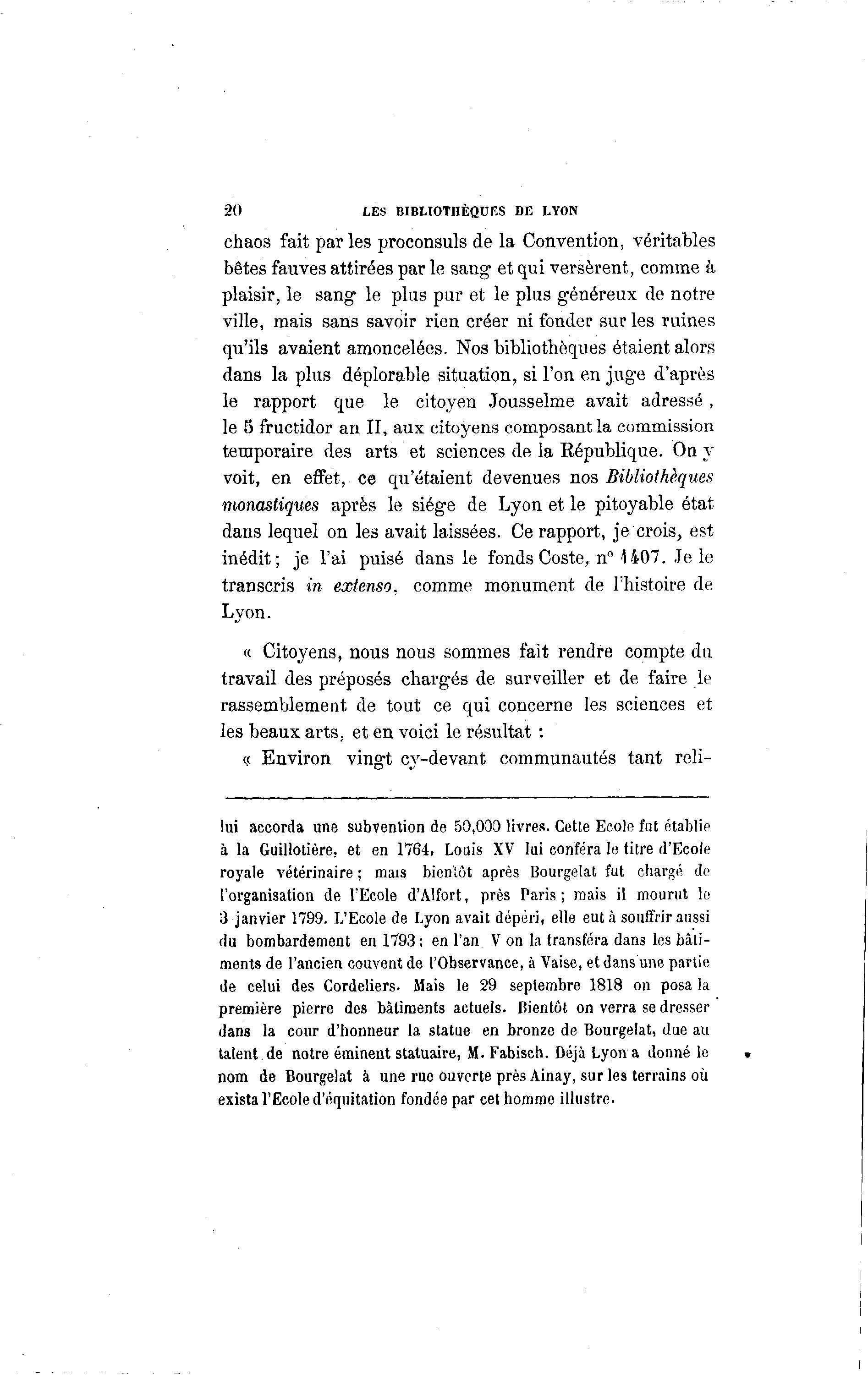 20 LES BIBLIOTHÈQUES DE LYON chaos fait parles proconsuls de la Convention, véritables bêtes fauves attirées par le sang et qui versèrent, comme à plaisir, le sang le plus pur et le plus généreux de notre ville, mais sans savoir rien créer ni fonder sur les ruines qu'ils avaient amoncelées. Nos bibliothèques étaient alors dans la plus déplorable situation, si l'on en juge d'après le rapport que le citoyen Jousselme avait adressé, le 5 fructidor an II, aux citoyens composant la commission temporaire des arts et sciences de la République. On y voit, en effet, ce qu'étaient devenues nos Bibliothèques monastiques après le siège de Lyon et le pitoyable état dans lequel on les avait laissées. Ce rapport, je crois, est inédit; je l'ai puisé dans le fonds Coste, n° 1407. Je le transcris in extenso, comme monument de l'histoire de Lyon. « Citoyens, nous nous sommes fait rendre compte du travail des préposés chargés de surveiller et de faire le rassemblement de tout ce qui concerne les sciences et les beaux arts, et en voici le résultat : « Environ vingt cy-devant communautés tant reli- lui accorda une subvention de 50,000 livres. Celle Ecole fut établie à la Guillotière. et en 1764, Louis XV lui conféra le titre d'Ecole royale vétérinaire ; mais bientôt après Bourgelat fut chargé de ['organisation de l'Ecole d'Alfort, près Paris; mais il mourut le 3 janvier 1799. L'Ecole de Lyon avait dépéri, elle eut à souffrir aussi du bombardement en 1793 ; en l'an V on la transféra dans les bâli- ments de l'ancien couvent de l'Observance, à Vaise, et dans une partie de celui des Cordeliers. Mais le 29 septembre 1818 on posa la première pierre des bâtiments actuels, bientôt on verra se dresser dans la cour d'honneur la statue en bronze de Bourgelat, due au talent de notre éminent statuaire, M. Fabisch. Déjà Lyon a donné le nom de Bourgelat à une rue ouverte près Ainay, sur les terrains où exista l'Ecole d'équitation fondée par cet homme illustre.