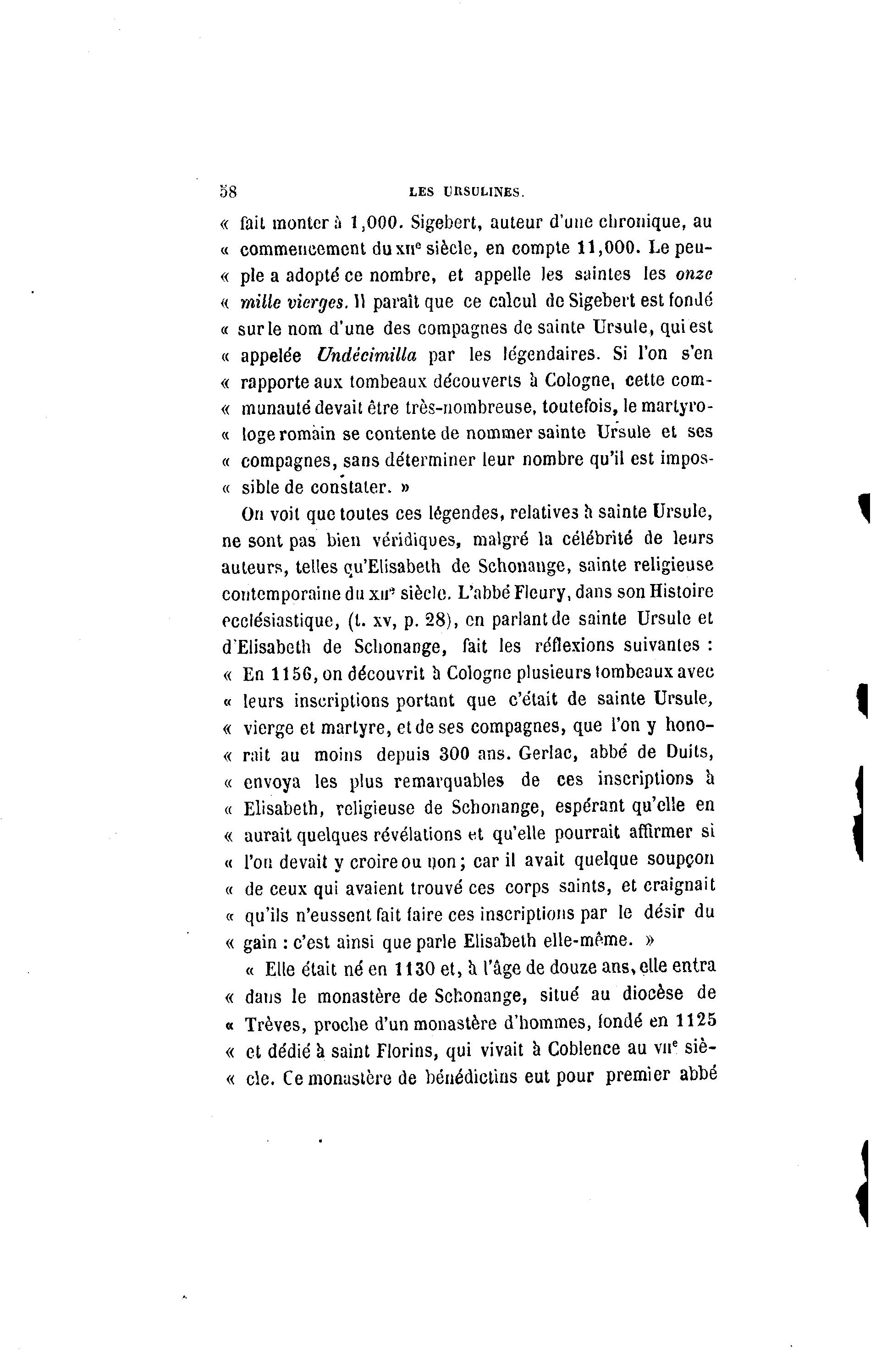 58 LES URSUUNES. « fait montera 1,000. Sigebert, auteur d'une chronique, au « commencement duxii0 siècle, en compte 11,000. Le peu- « pie a adopté ce nombre, et appelle les saintes les onze « mille vierges. 11 paraît que ce calcul de Sigebert est fondé « sur le nom d'une des compagnes de sainte Ursule, qui est « appelée Undécimilla par les légendaires. Si l'on s'en « rapporte aux tombeaux découverts a Cologne, cette com- « munauté devait être très-nombreuse, toutefois, le martyro- « loge romain se contente de nommer sainte Ursule et ses « compagnes, sans déterminer leur nombre qu'il est impos- « sible de constater. » On voit que toutes ces légendes, relatives h sainte Ursule, ne sont pas bien véridiques, malgré la célébrité de leurs auteurs, telles qu'Elisabeth de Schonange, sainte religieuse contemporaine du xii' siècle. L'abbé Fleury, dans son Histoire ecclésiastique, (t. xv, p. 28), en parlant de sainte Ursule et d'Elisabeth de Schonange, fait les réflexions suivantes : « En 1156, on découvrit a Cologne plusieurs tombeaux avec « leurs inscriptions portant que c'était de sainte Ursule, « vierge et martyre, et de ses compagnes, que l'on y hono- « rait au moins depuis 300 ans. Gerlac, abbé de Duits, « envoya les plus remarquables de ces inscriptions à « Elisabeth, religieuse de Schonange, espérant qu'elle en « aurait quelques révélations et qu'elle pourrait affirmer si « l'on devait y croire ou non; car il avait quelque soupçon « de ceux qui avaient trouvé ces corps saints, et craignait « qu'ils n'eussent fait faire ces inscriptions par le désir du « gain : c'est ainsi que parle Elisabeth elle-même. » « Elle était né en 1130 et, a l'âge de douze ans, elle entra « dans le monastère de Schonange, situé au diocèse de « Trêves, proche d'un monastère d'hommes, fondé en 1125 « et dédié à saint Florins, qui vivait à Coblence au vne siè- « cle. Ce monastère de bénédictins eut pour premier abbé