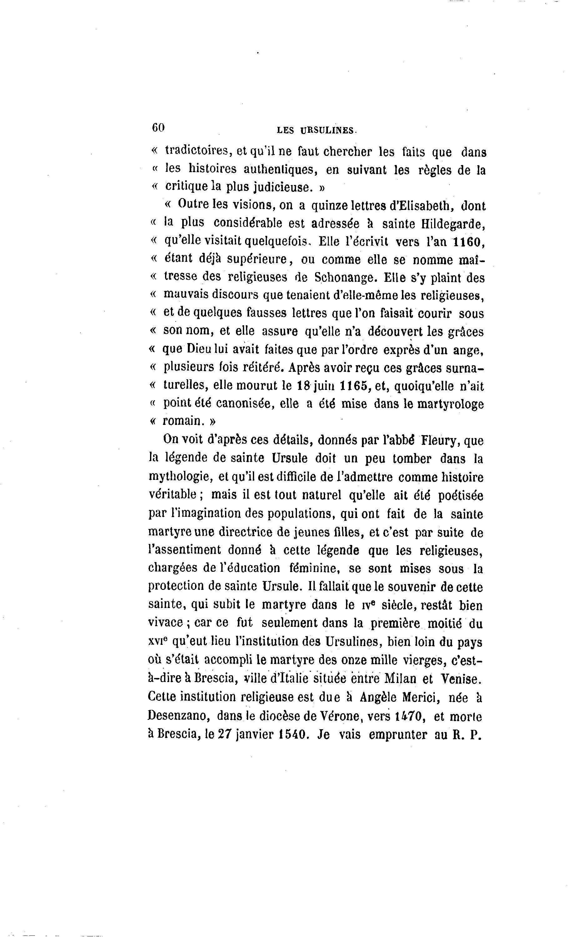 60 LES URSULINES. « tradictoires, et qu'ilne faut chercher les faits que dans « les histoires authentiques, en suivant les règles de la « critique la plus judicieuse. » « Outre les visions, on a quinze lettres d'Elisabeth, dont « ia plus considérable est adressée a sainte Hildegarde, « qu'elle visitait quelquefois. Elle l'écrivit vers l'an 1160, « étant déjà supérieure, ou comme elle se nomme maî- « tresse des religieuses de Schonange. Elle s'y plaint des « mauvais discours que tenaient d'elle-même les religieuses, « et de quelques fausses lettres que l'on faisait courir sous « son nom, et elle assure qu'elle n'a découvert les grâces « que Dieu lui avait faites que par l'ordre exprès d'un ange, « plusieurs fois réitéré. Après avoir reçu ces grâces surna- « turelles, elle mourut le 18 juin 1165, et, quoiqu'elle n'ait « point été canonisée, elle a été mise dans le martyrologe « romain. » On voit d'après ces détails, donnés par l'abbé Fleury, que la légende de sainte Ursule doit un peu tomber dans la mythologie, et qu'il est difficile de l'admettre comme histoire véritable ; mais il est tout naturel qu'elle ait été poétisée par l'imagination des populations, qui ont fait de la sainte martyre une directrice de jeunes filles, et c'est par suite de l'assentiment donné à cette légende que les religieuses, chargées de l'éducation féminine, se sont mises sous la protection de sainte Ursule. Il fallait que le souvenir de cette sainte, qui subit le martyre dans le ive siècle, restât bien vivace ; car ce fut seulement dans la première moitié du xvie qu'eut lieu l'institution des Ursulines, bien loin du pays où s'était accompli le martyre des onze mille vierges, c'est- à -dire a Brescia, ville d'Italie située entre Milan et Venise. Cette institution religieuse est due à Angèle Merici, née à Desenzano, dans le diocèse de Vérone, vers 1470, et morle à Brescia, le 27 janvier 1540. Je vais emprunter au R. P.