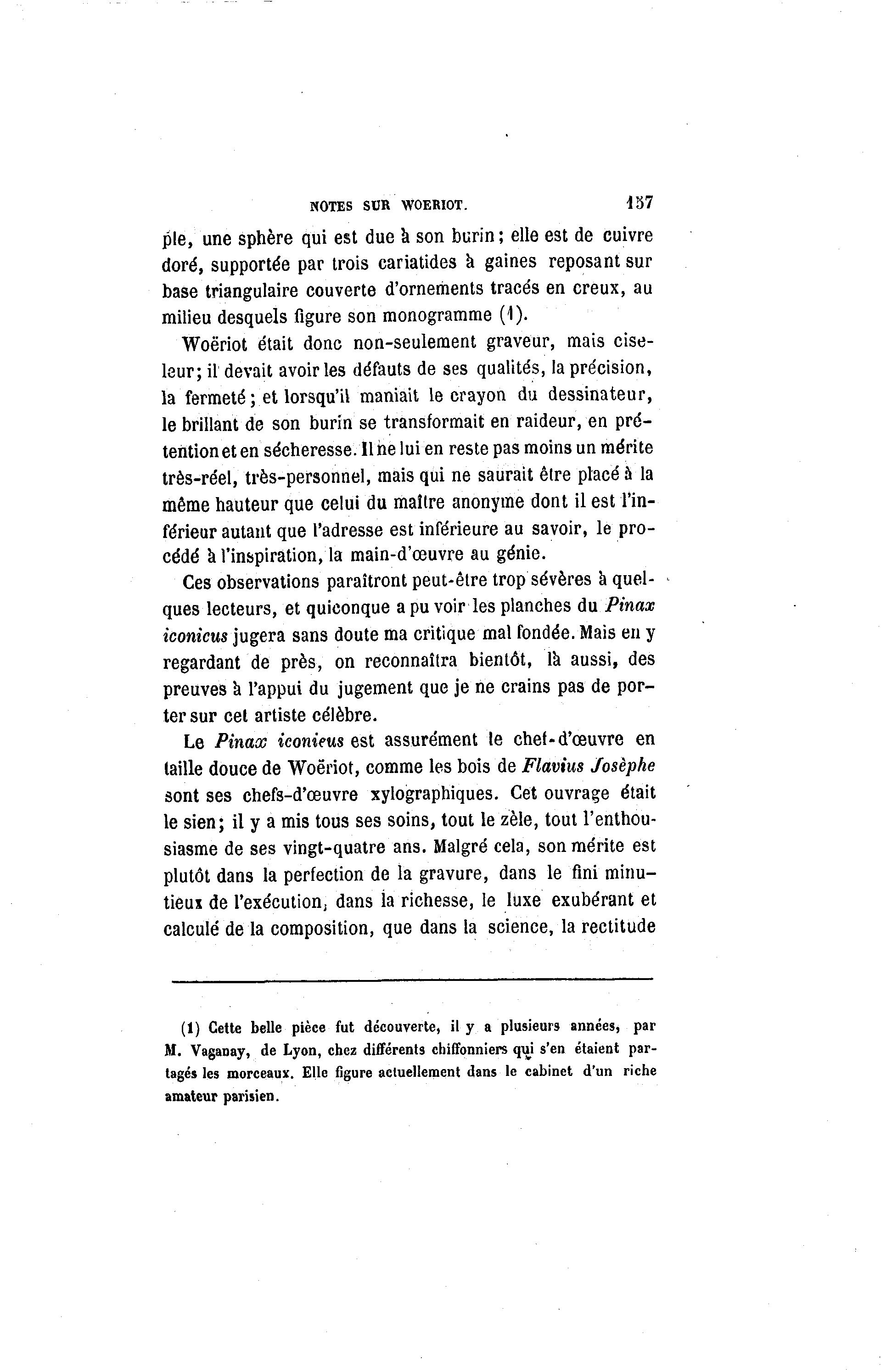 NOTES SDR WOERIOT. 437 pie, une sphère qui est due à son burin ; elle est de cuivre doré, supportée par trois cariatides a gaines reposant sur base triangulaire couverte d'ornements tracés en creux, au milieu desquels figure son monogramme (1). Woëriot était donc non-seulement graveur, mais cise- leur; il devait avoir les défauts de ses qualités, la précision, la fermeté ; et lorsqu'il maniait le crayon du dessinateur, le brillant de son burin se transformait en raideur, en pré- tention et en sécheresse. Une lui en reste pas moins un mérite très-réel, très-personnel, mais qui ne saurait être placé à la même hauteur que celui du maître anonyme dont il est l'in- férieur autant que l'adresse est inférieure au savoir, le pro- cédé a l'inspiration, la main-d'œuvre au génie. Ces observations paraîtront peut-être trop sévères à quel- - ques lecteurs, et quiconque a pu voir les planches du Pinax iconicus jugera sans doute ma critique mal fondée. Mais en y regardant de près, on reconnaîtra bientôt, la aussi, des preuves a l'appui du jugement que je ne crains pas de por- ter sur cet artiste célèbre. Le Pinax iconieus est assurément le chef-d'œuvre en taille douce de Woëriot, comme les bois de Flavius Josèphe sont ses chefs-d'œuvre xylographiques. Cet ouvrage était le sien; il y a mis tous ses soins, tout le zèle, tout l'enthou- siasme de ses vingt-quatre ans. Malgré cela, son mérite est plutôt dans la perfection de la gravure, dans le fini minu- tieux de l'exécution) dans la richesse, le luxe exubérant et calculé de la composition, que dans la science, la rectitude (1) Cette belle pièce fut découverte, il y a plusieurs années, par M. Vaganay, de Lyon, chez différents chiffonniers qui s'en étaient par- tagés les morceaux. Elle figure actuellement dans le cabinet d'un riche amateur parisien.