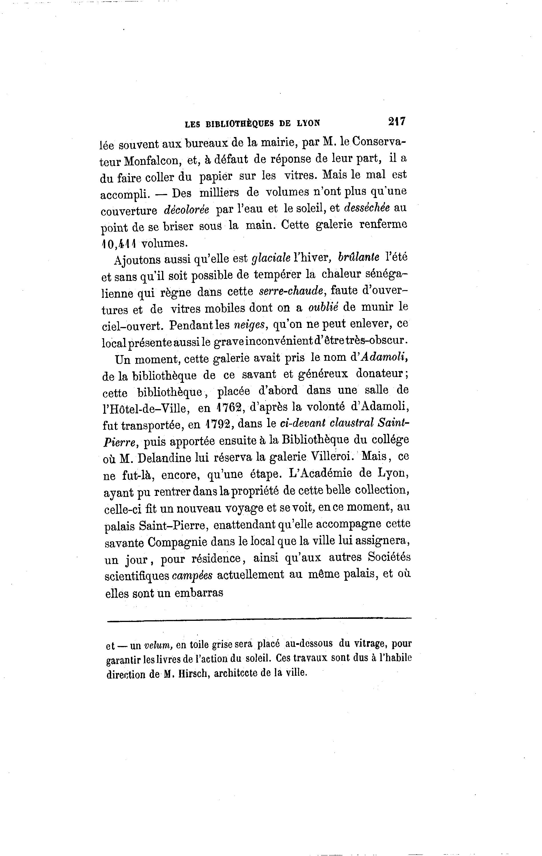LES BIBLIOTHÈQUES DE LYON 217 lée souvent aux bureaux de la mairie, par M. le Conserva- teur Monfalcon, et, à défaut de réponse de leur part, il a du faire coller du papier sur les vitres. Mais le mal est accompli. — Des milliers de volumes n'ont plus qu'une couverture décolorée par l'eau et le soleil, et desséchée au point de se briser sous la main. Cette galerie renferme 10,411 volumes. Ajoutons aussi qu'elle est glaciale l'hiver, brûlante l'été et sans qu'il soit possible de tempérer la chaleur sénéga- lienne qui règne dans cette serre-chaude, faute d'ouver- tures et de vitres mobiles dont on a oublié de munir le ciel-ouvert. Pendant les neiges, qu'on ne peut enlever, ce local présente aussi le grave inconvénient d'être très-obscur. Un moment, cette galerie avait pris le nom à 'Adamoli, de la bibliothèque de ce savant et généreux donateur ; cette bibliothèque, placée d'abord dans une salle de l'Hôtel-de-Ville, en 1762, d'après la volonté d'Adamoli, fut transportée, en 1792, dans le ci-devant claustral Saint- Pierre, puis apportée ensuite à la Bibliothèque du collège où M. Delandine lui réserva la galerie Villeroi. Mais, ce ne fut-là , encore, qu'une étape. L'Académie de Lyon, ayant pu rentrer dans la propriété de cette belle collection, celle-ci fit un nouveau voyage et se voit, en ce moment, au palais Saint-Pierre, enattendant qu'elle accompagne cette savante Compagnie dans le local que la ville lui assignera, un jour, pour résidence, ainsi qu'aux autres Sociétés scientifiques campées actuellement au même palais, et où. elles sont un embarras et — un vélum, en toile grise sera placé au-dessous du vitrage, pour garantir les livres de l'action du soleil. Ces travaux sont dus à l'habile direction de M. Hirsch, architecte de la ville.