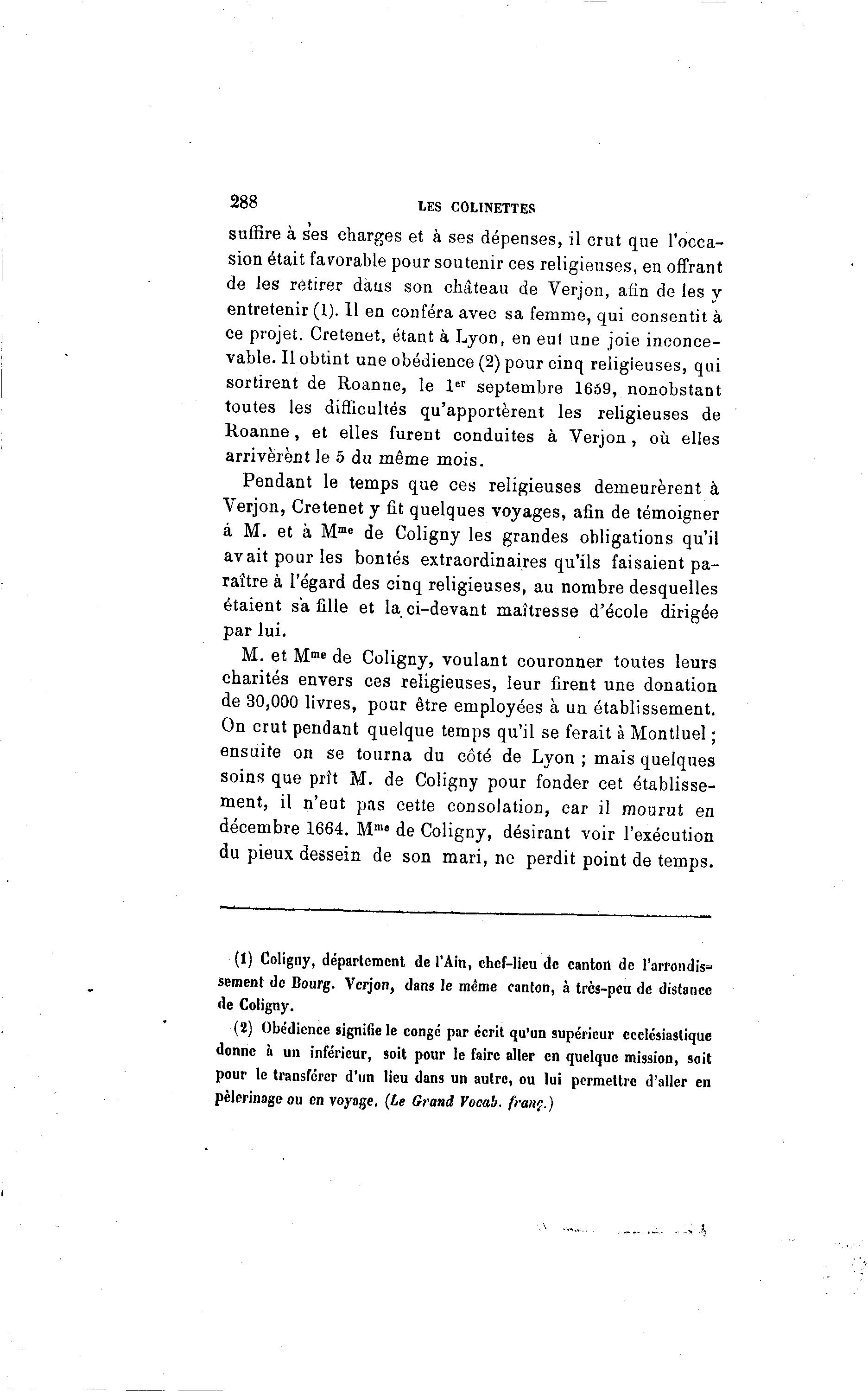 288 LES COMNETTES suffire à ses charges et à ses dépenses, il crut que l'occa- sion était favorable pour soutenir ces religieuses, en offrant de les retirer dans son château de Verjon, afin de les y entretenir (1). 11 en conféra avec sa femme, qui consentit à ce projet. Cretenet, étant à Lyon, en eul une joie inconce- vable. Il obtint une obédience (2) pour cinq religieuses, qui sortirent de Roanne, le 1 er septembre 1659, nonobstant toutes les difficultés qu'apportèrent les religieuses de Roanne, et elles furent conduites à Verjon, où elles arrivèrent Je 5 du même mois. Pendant le temps que ces religieuses demeurèrent à Verjon, Cretenet y fit quelques voyages, afin de témoigner à M. et à Mme de Coligny les grandes obligations qu'il avait pour les bontés extraordinaires qu'ils faisaient pa- raître à l'égard des cinq religieuses, au nombre desquelles étaient s'a fille et la ci-devant maîtresse d'école dirigée par lui. M. et Mme de Coligny, voulant couronner toutes leurs charités envers ces religieuses, leur firent une donation de 30,000 livres, pour être employées à un établissement. On crut pendant quelque temps qu'il se ferait à Montluel ; ensuite on se tourna du côté de Lyon ; mais quelques soins que prît M. de Coligny pour fonder cet établisse- ment, il n'eut pas cette consolation, car il mourut en décembre 1664. Mme de Coligny, désirant voir l'exécution du pieux dessein de son mari, ne perdit point de temps. (1) Coligny, département de l'Ain, chef-lieu de canton de l'arrondis» sèment de Bourg. Verjon, dans le même canton, à très-peu de distance de Coligny. (2) Obédience signifie le congé par écrit qu'un supérieur ecclésiastique donne à un inférieur, soit pour le faire aller en quelque mission, soit pour le transférer d'un lieu dans un autre, ou lui permettre d'aller en pèlerinage ou en voyage. (Le Grand Vocab. franc.)